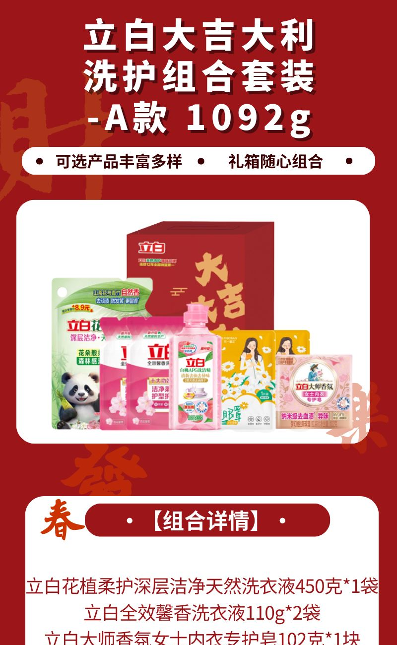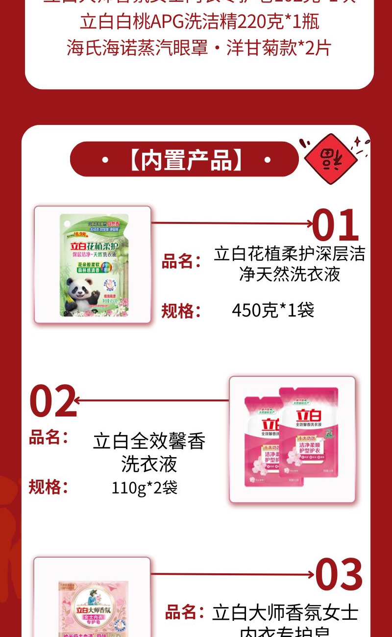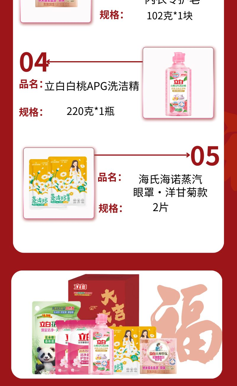 配置: 立白花植柔护深层洁净天然洗衣液450克*1袋 立白全效馨香洗衣液110g*2袋 立白大师香氛女士内衣专护皂102克*1块 立白白桃APG洗洁精220克*1瓶 海氏海诺蒸汽眼罩·洋甘菊款*2片 卖点: 可选产品丰富多样,礼箱随心组合,多种价位因需而定,充分满足各种送礼需求,是商务送礼、单位福利的用心之选。