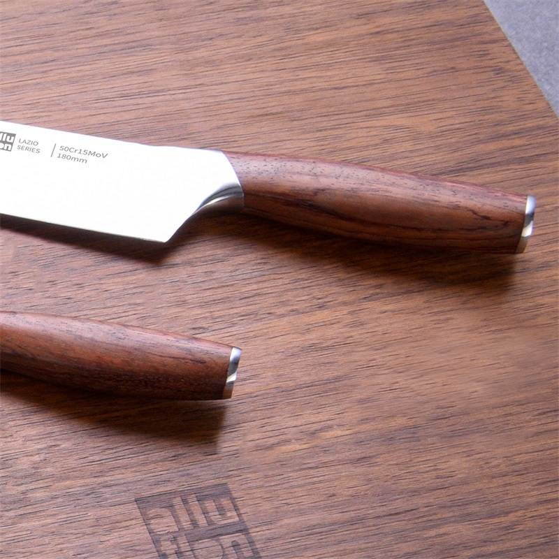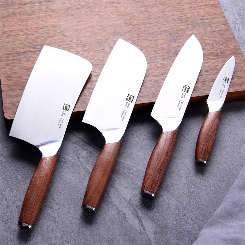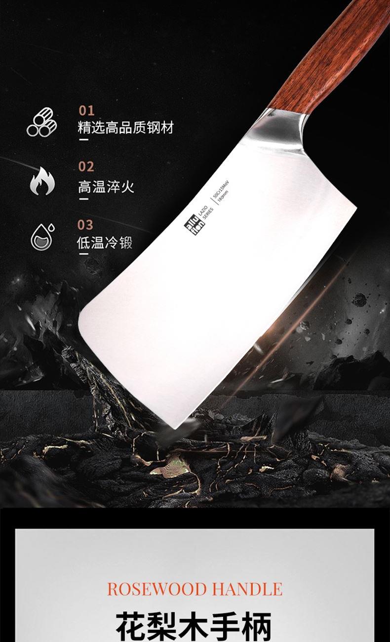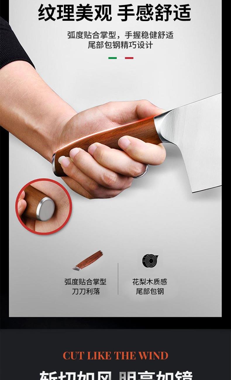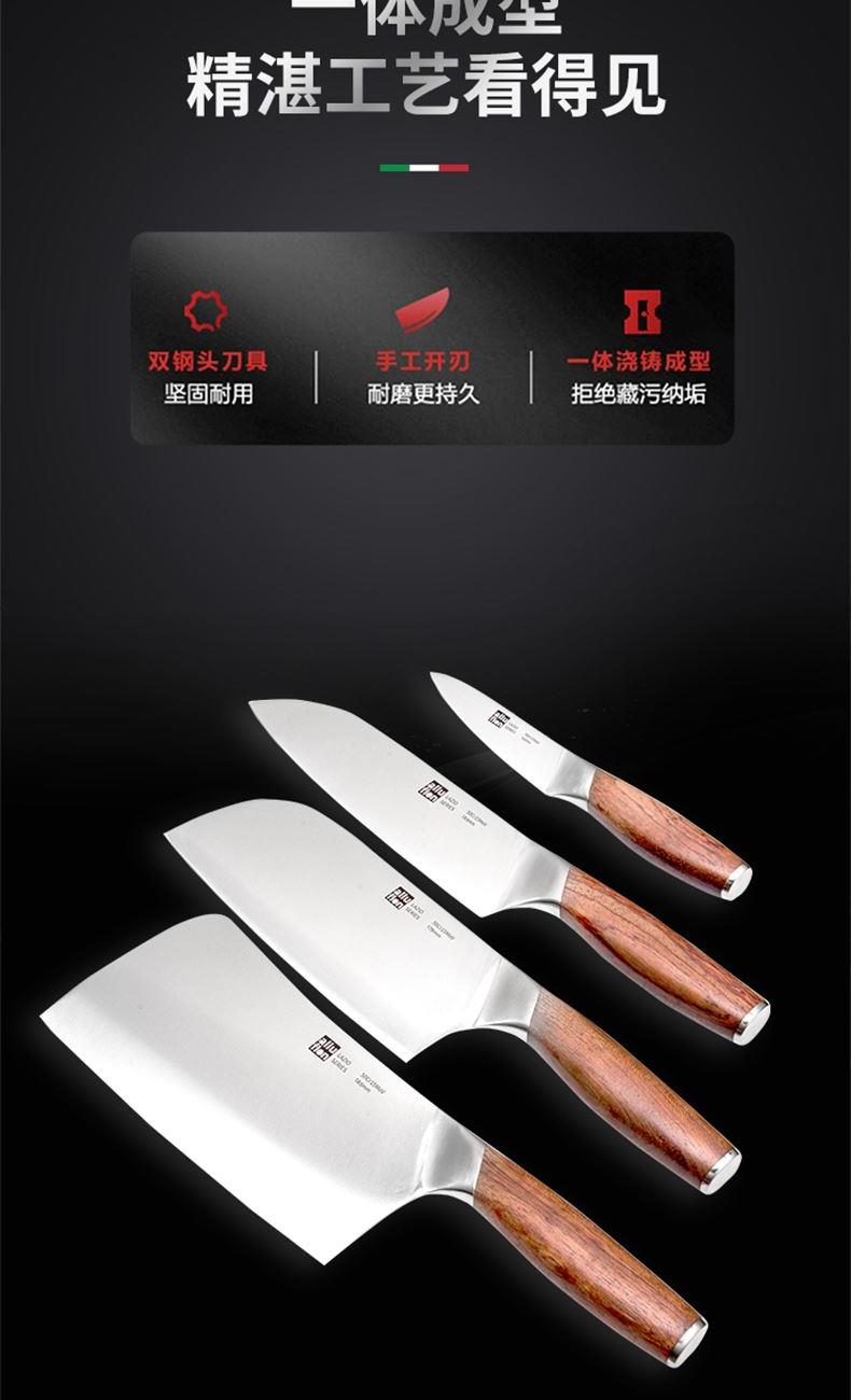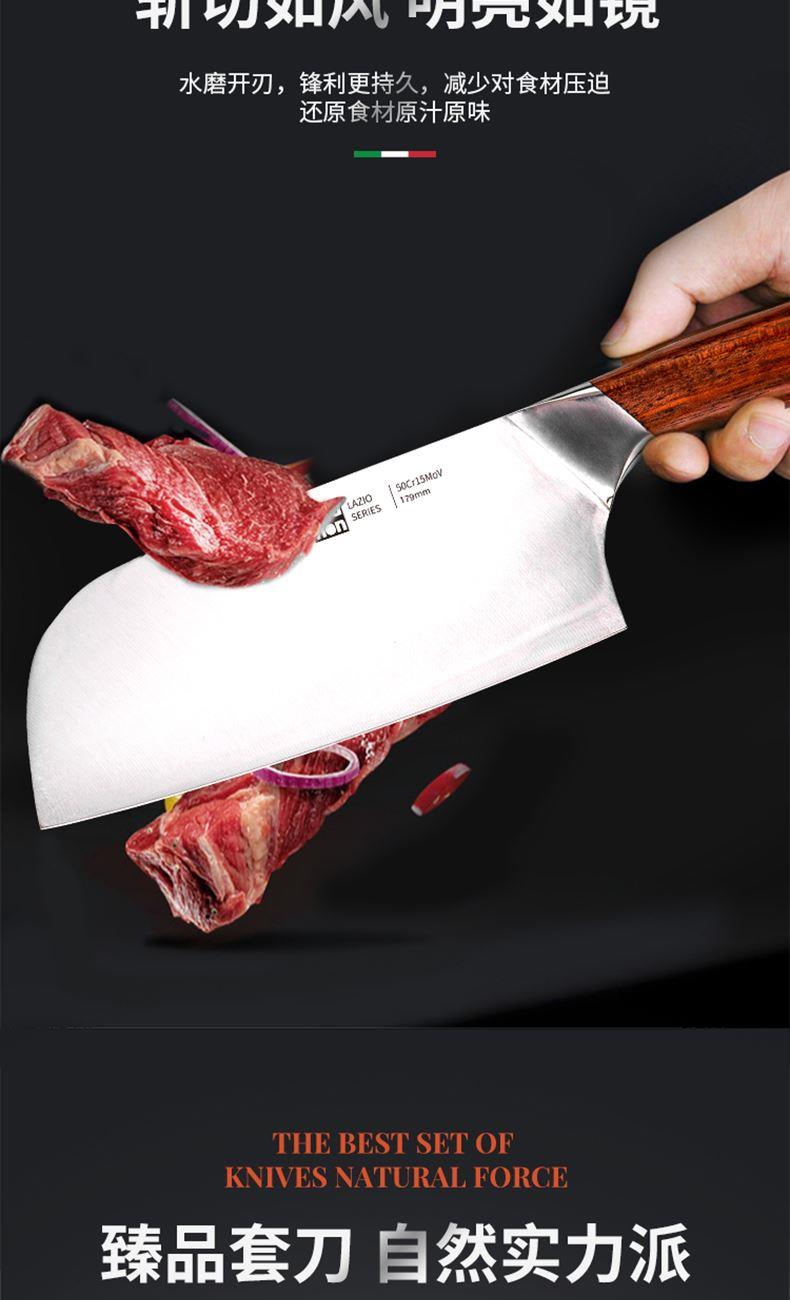 规格:六件套(切片刀、砍骨刀、三德刀、 水果刀、剪刀、刀座) 材质:50Cr15MoV钢、花梨木 单个尺寸:250*143*350 1、50Cr15MoV,高硬度 2、冷锻处理,钢材结构稳定 3、花梨木手柄,纹理精美 4、臻品套刀,专刀专用。