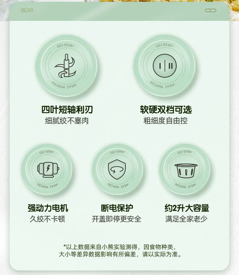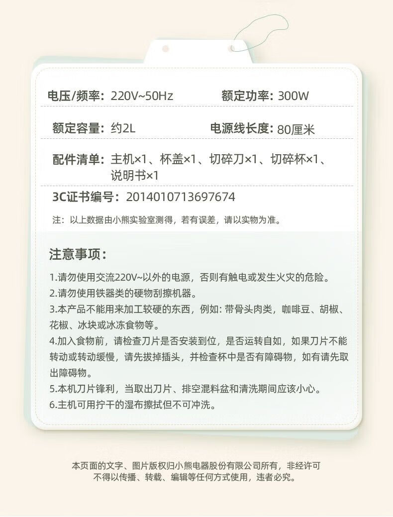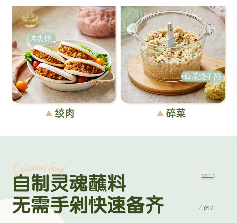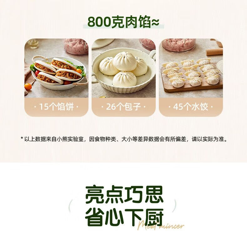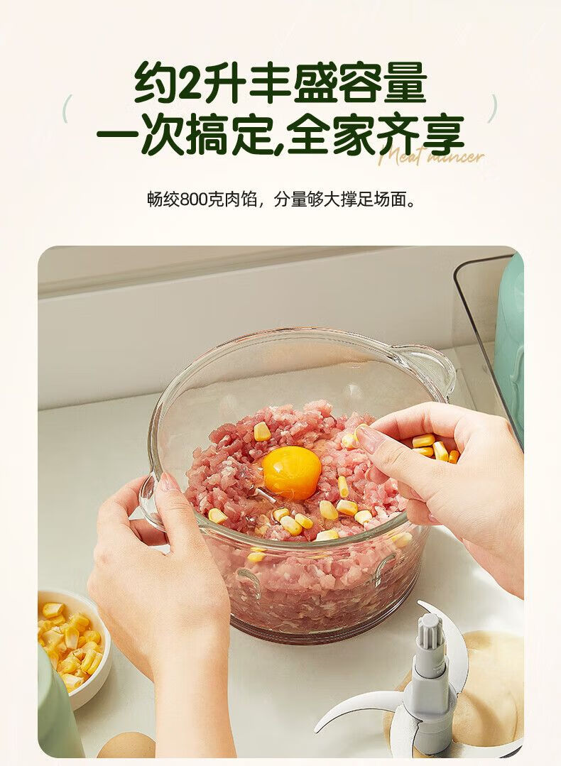 参数: 额定容量 1.8L 额定功率 300W 产品重量 1.8kg 包装尺寸 206x206x213mm 箱数 12台/箱 卖点: 1、短轴四叶刀,易清洗不塞肉 2、300W整机大功率,耐用不易损 3、约2升大容量,全家饺子宴 4、双档可选,软硬食材都兼顾