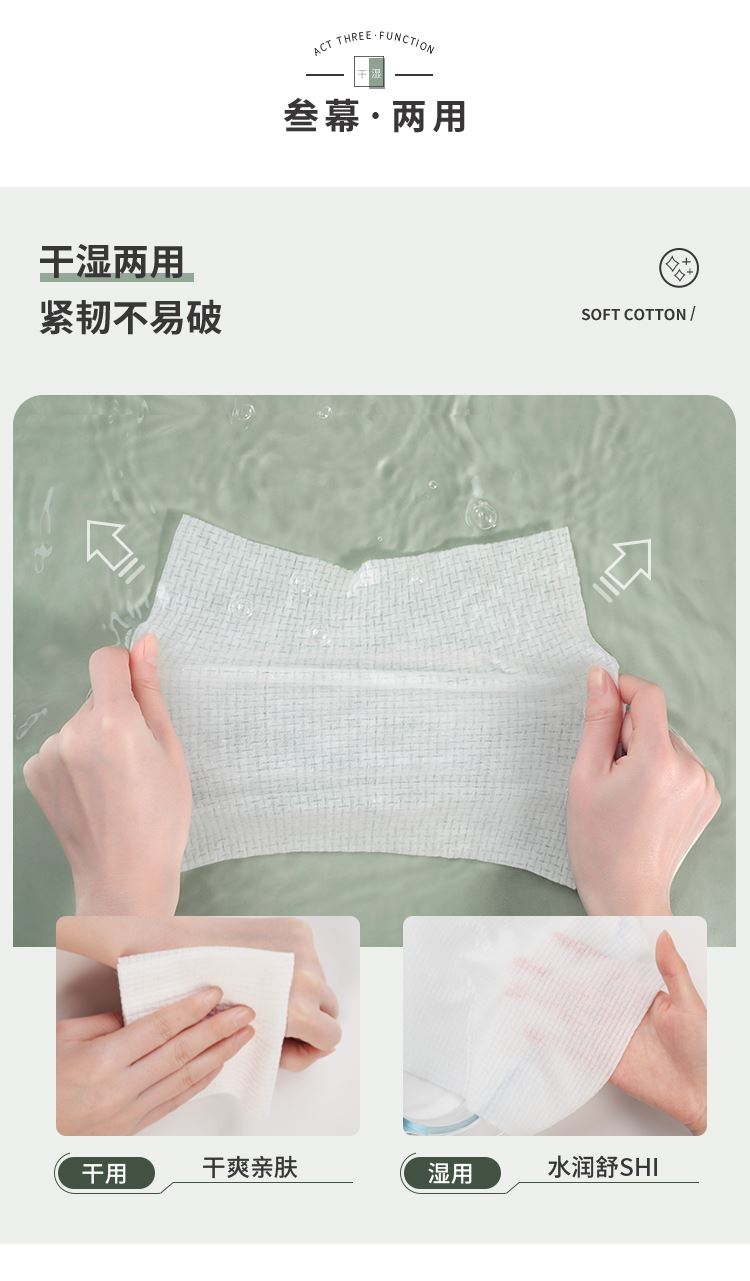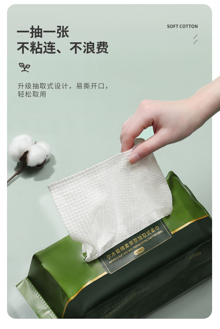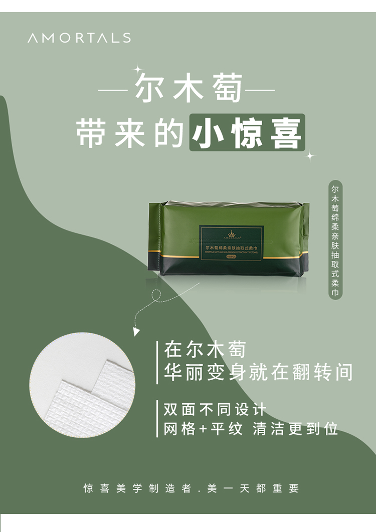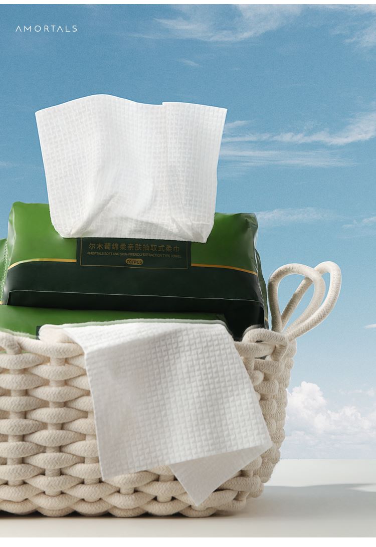 产品:AMORTALS尔木萄绵柔亲肤抽取式柔巾 材质:再生纤维素纤维 规格:20cm*20cm 80g/平方米 纹理:EF纹+平纹 净含量:70片/包 加厚亲肤材质‌:采用90g/m²加厚设计,双面EF+平纹结构,触感柔软且不易掉絮,适合敏感肌‌ ‌干湿两用‌:湿用可深层清洁,干用方便快捷,卸妆、洁面一巾搞定‌ ‌安全无添加‌:新疆长绒棉,无荧光剂、酒精等刺激成分,通过高温处理‌ ‌便携实用‌:70抽*2包组合装,满足日常囤货需求,抽取式设计避免连抽浪费。