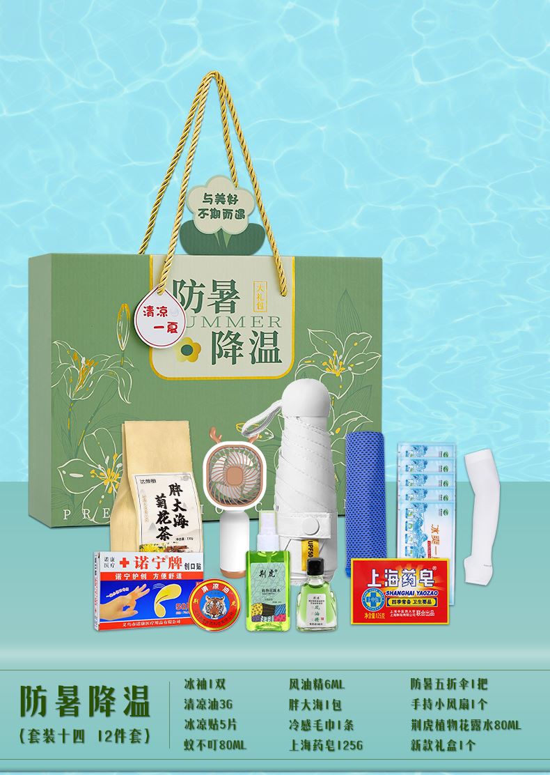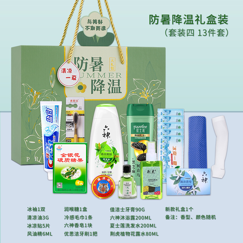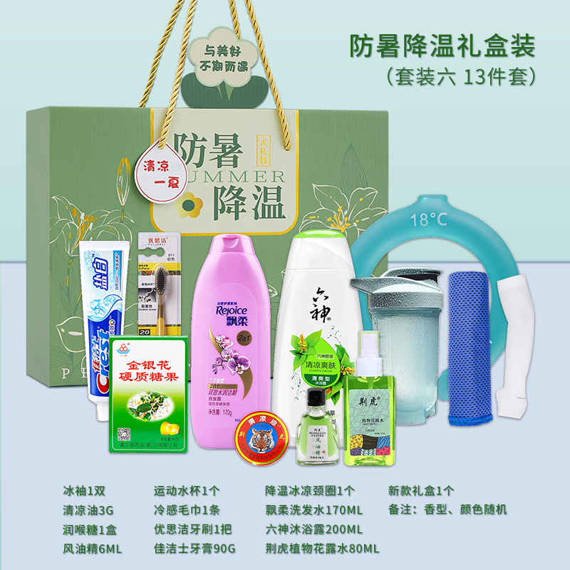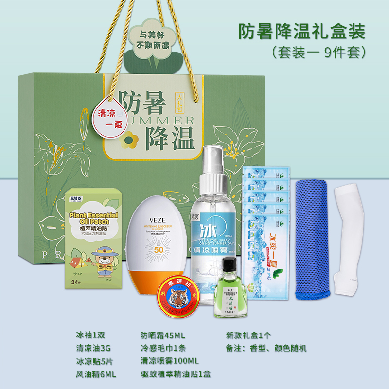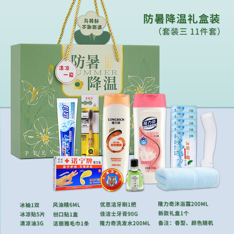 1.注:商城报价对应首张主图款式! 其他套装参考细节图,费用另计! 2. 咨询下单请备注好产品信息! 3.首图款式产品明细:防暑降温礼盒装(套装二 11件套): 冰袖1双,风油精6ML,冷感毛巾1条,隆力奇花露水60ML,冰凉贴5片,气囊梳1把,优思洁牙刷1把,新款礼盒1个,清凉油3G,上海药皂125G,佳洁士牙膏90G