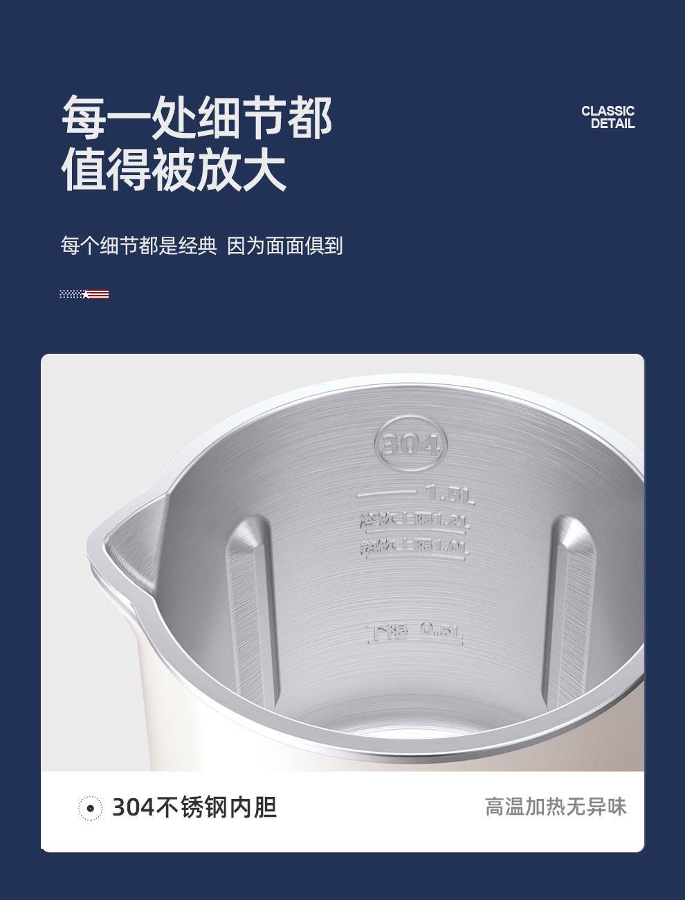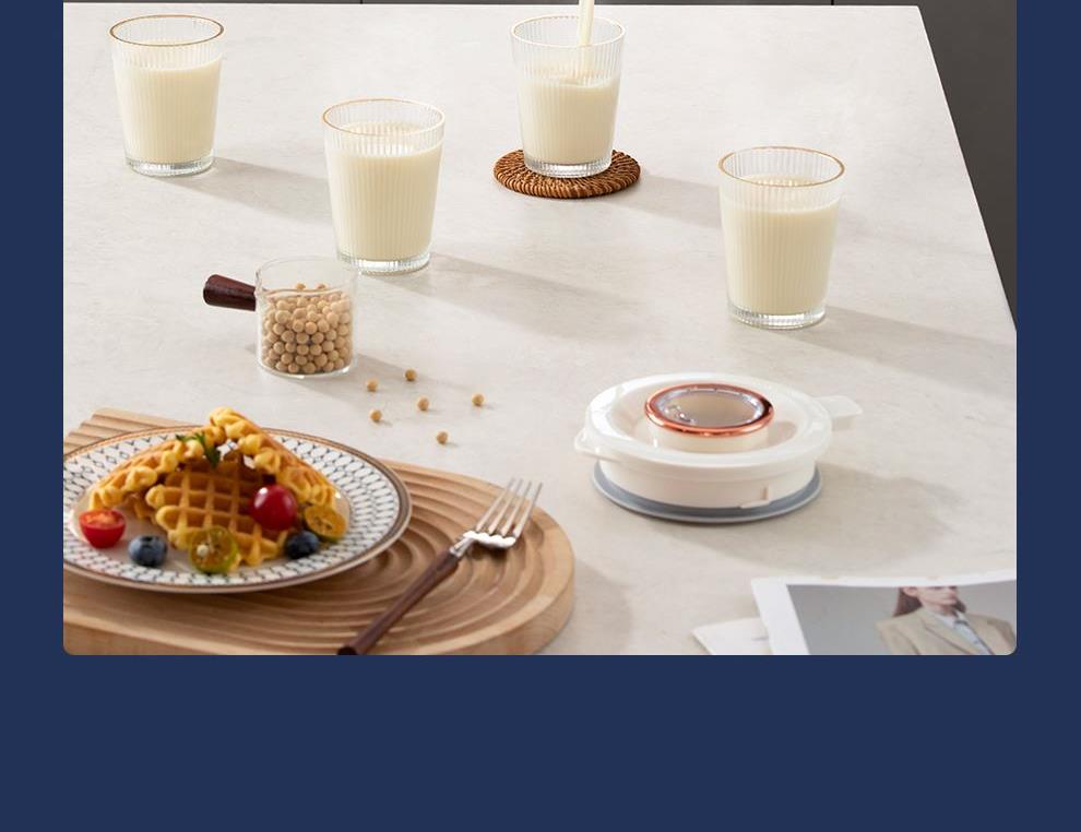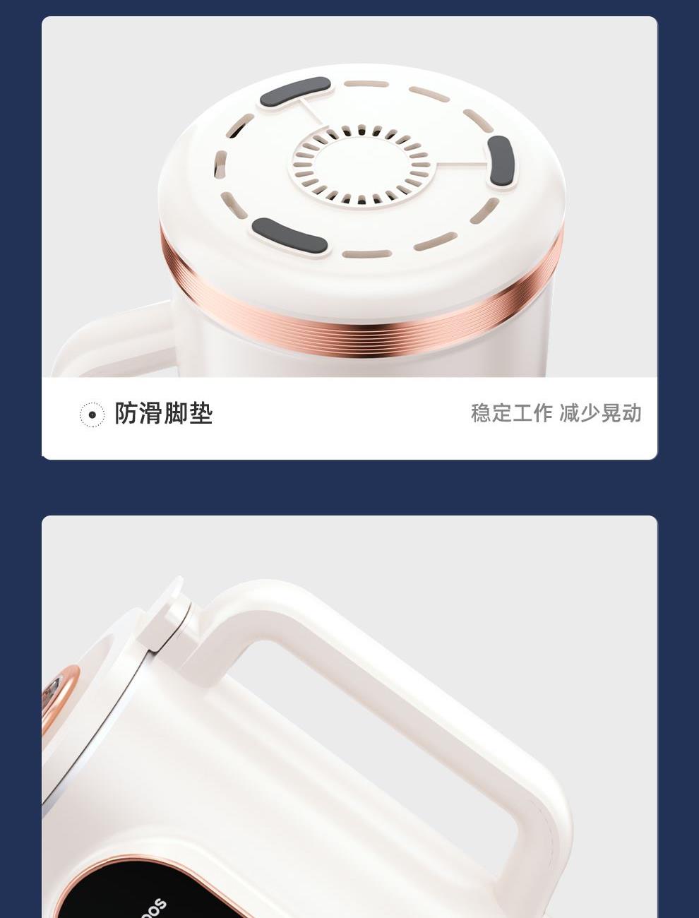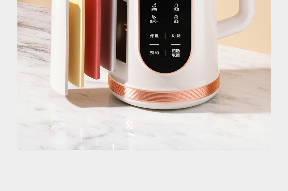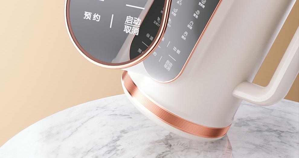 额定功率:800W加热/250W搅拌 额定容量:1.2L 额定电压:220V~ 额定频率:50Hz 产品净重:1.5kg 产品毛重:1.7kg 整箱重量:21.6kg 装 箱 数:12台/箱 产品尺寸:195x145x275mm 彩盒尺寸:310x200x200mm 产品条码:6971537238102 外箱尺寸:635x620x420mm 一机多用&智能触控屏冷热双打,一键清洗;10大菜单选择,12H预约,6H长效保温; 不锈钢材质食品级304不锈钢搅拌杯,四维立体10叶精钢刀片; 高速电机&安全保障动力强劲,快速切割,细腻研磨;开盖断电保护; 轻盈机体1.2L精巧容量适合一家4口,小巧不占地,收纳方便。
