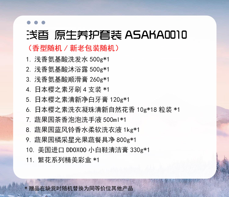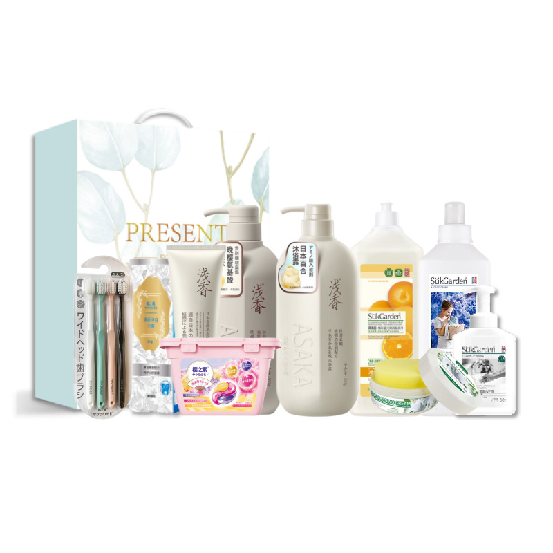 【套装配置】(香型随机/新老包装随机) 1.浅香氨基酸洗发水500g*1 2.浅香氨基酸沐浴露500g*1 3.浅香氨基酸顺滑膏260g*1 4.日本樱之素牙刷4支装*1 5.日本樱之素清新净白牙膏120g*1 6.日本樱之素洗衣凝珠清新自然花香10g*18粒装*1 7.蔬果园茶香泡泡洗手液500ml*1 8.蔬果园蓝风铃香水柔软洗衣液1kg*1 9.蔬果园橘采星光果蔬餐具净800g*1 10.美国进口DDOXOO小白鞋清洁膏330g*1 11.繁花系列精美彩盒*1