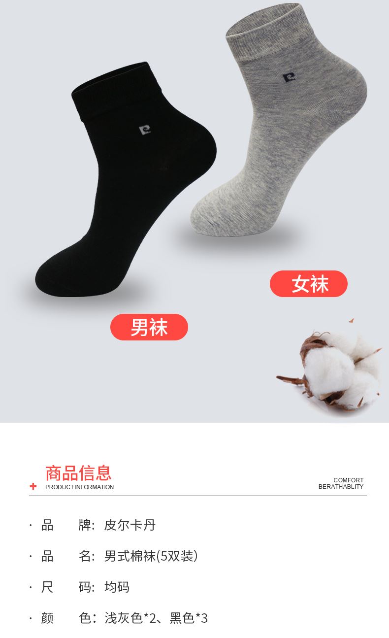 货号:020HPCM0001 款式:男式棉袜 规格:5双装 颜色:黑色*3、浅灰色*2 成分:100 % 棉(弹力纤维除外)