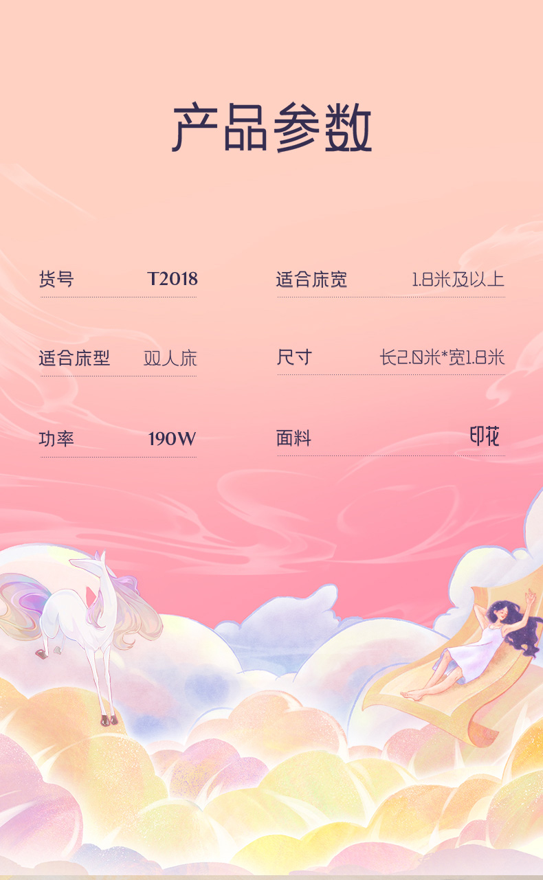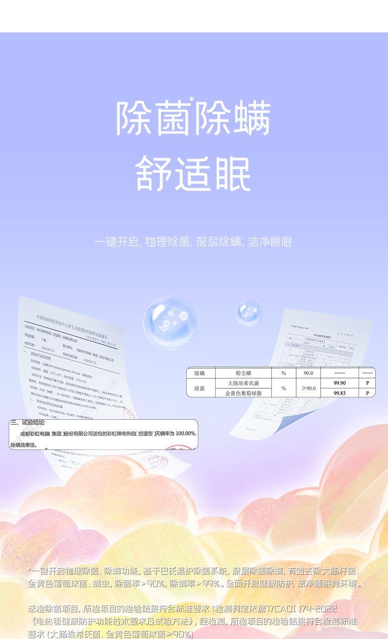型号:TT200×180-21X 功率:190W 功能:9档调温,一键除螨,排潮除湿。 开关:大屏数显,双控双温,可定时。 面料:化纤 包装:彩盒 1、NTC环温监测,自适应调温 2、9档调温,随心调节 3、一键除螨,健康安心 4、1-15小时定时,默认15小时自动停止加热。 5、双温双控,互不干扰 6、自动断电,自动降档,助力安心好眠 7、排潮除湿,每晚不到1度电 8,礼品属性,包装精美