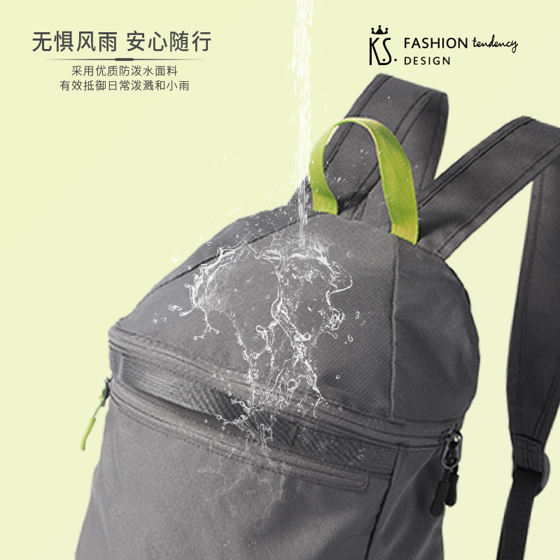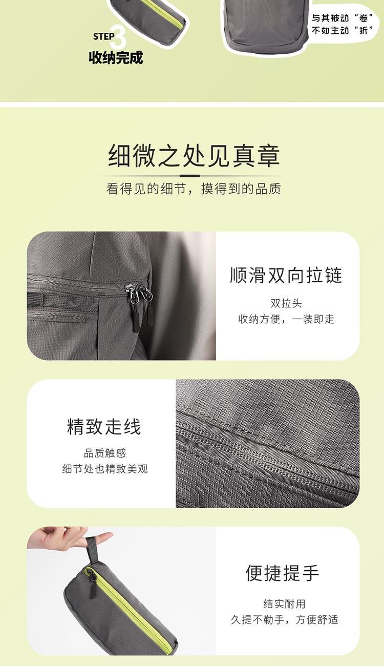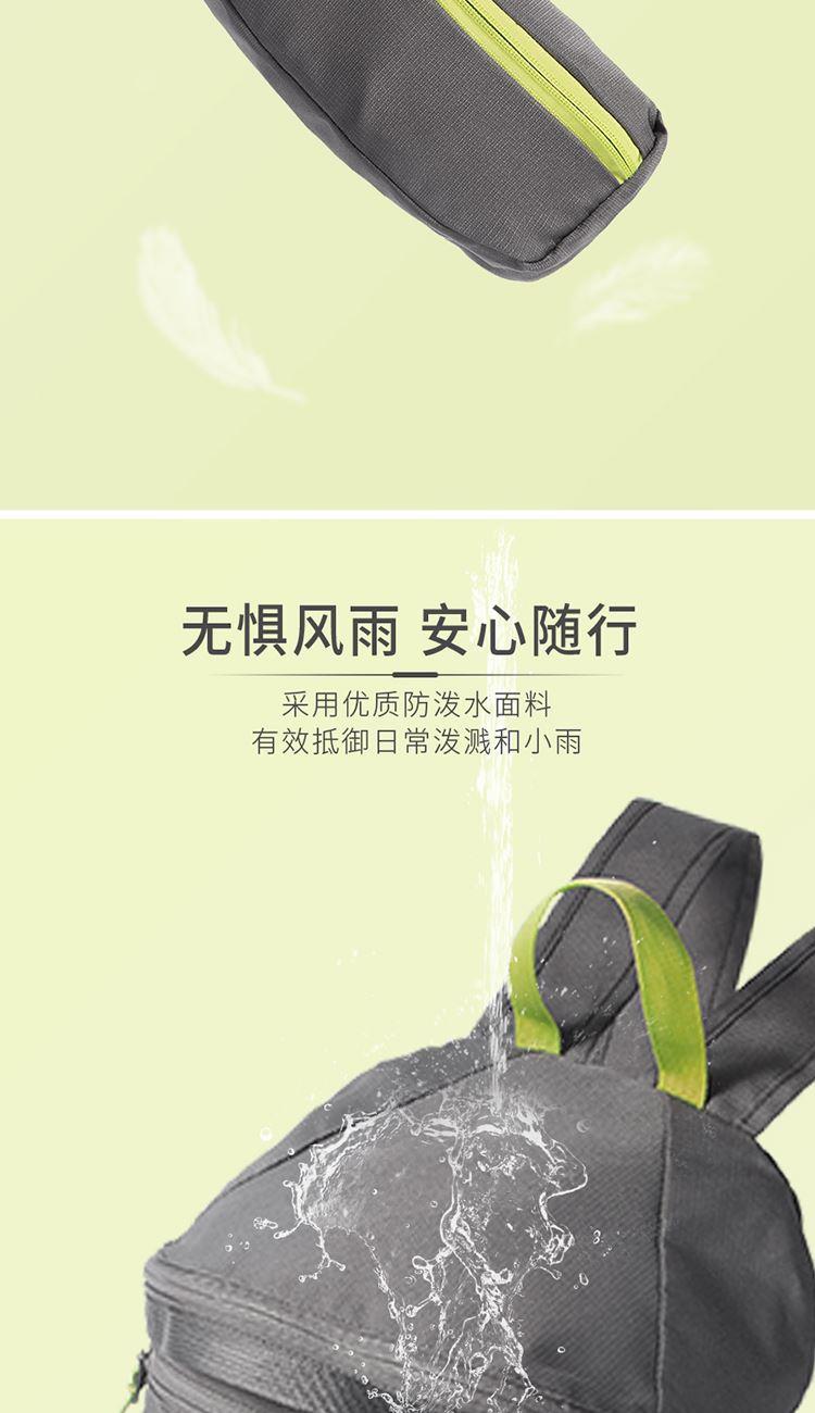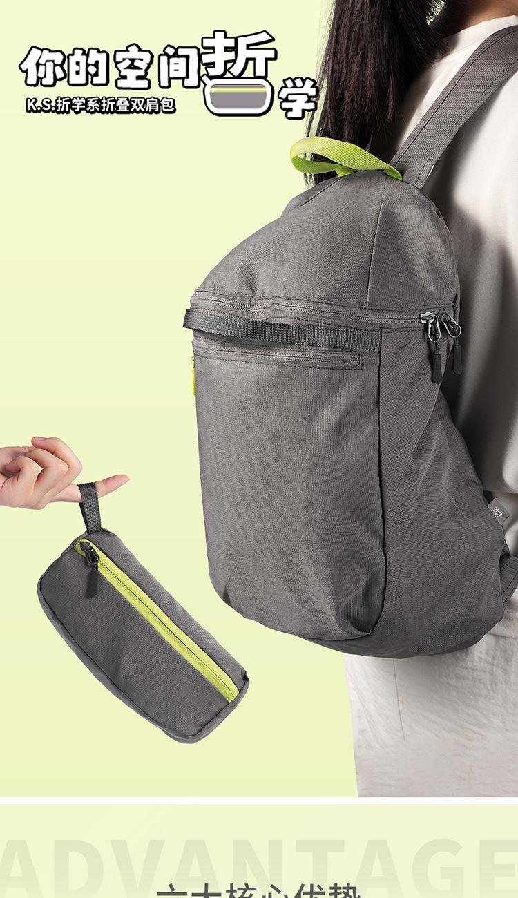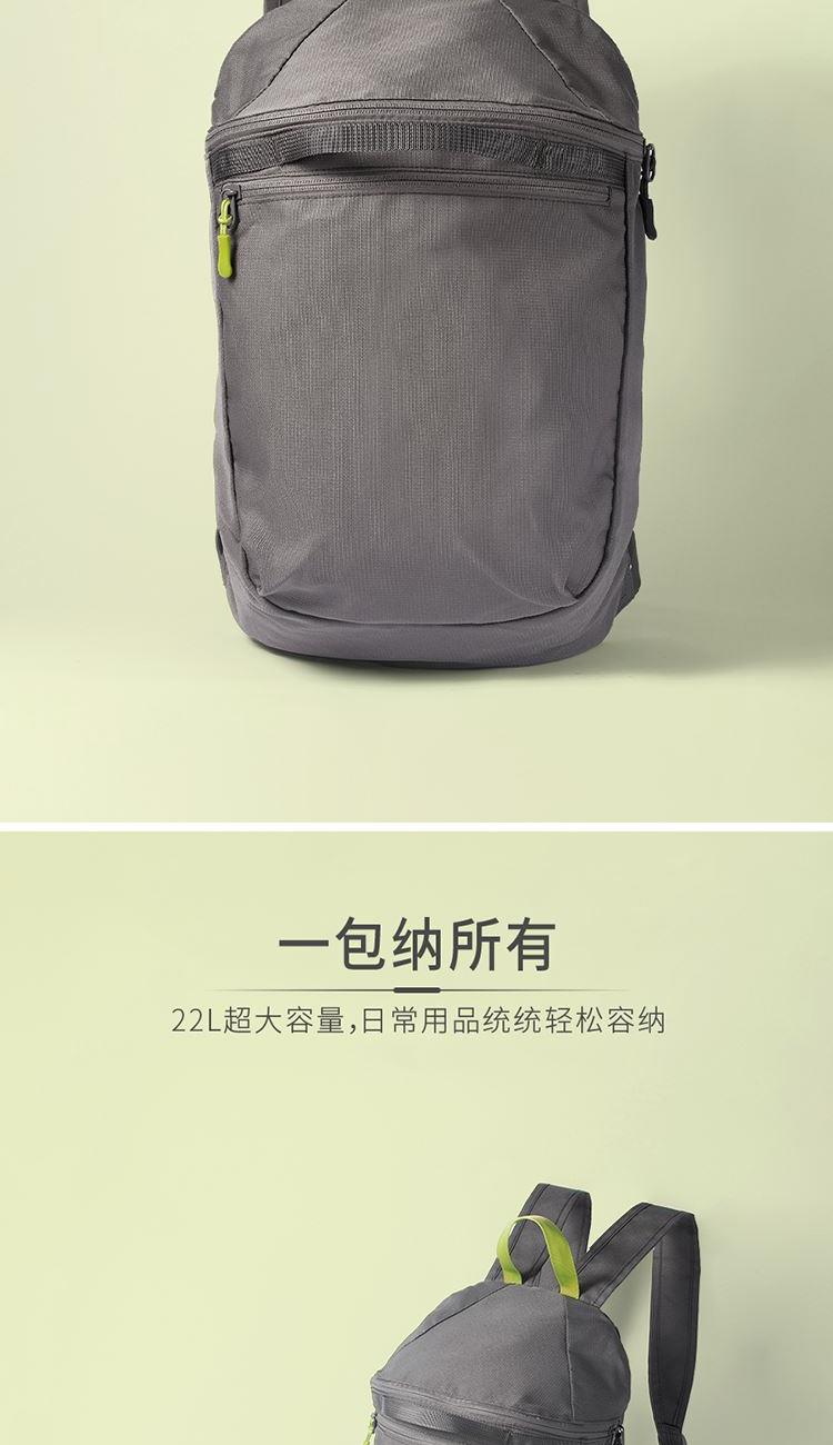 1.轻便,轻量化设计: 自重轻盈,背负无负担,出行更轻松。 2.一键折叠,收纳无忧: 轻松折叠成小巧体积,节省空间,通勤旅行随取随用。 3.22L大容量,通勤旅行皆宜: 轻松容纳笔记本电脑.衣物.日常用品,满足多种场景需求。 4.防水面料,从容应对: 高密度面料有效抵御日常泼溅和小雨,保护包内物品干爽。 主料:尼龙塔丝隆,成分:99.9%尼龙 里布:牛津布,99.9%涤纶 提手:99.9%涤纶