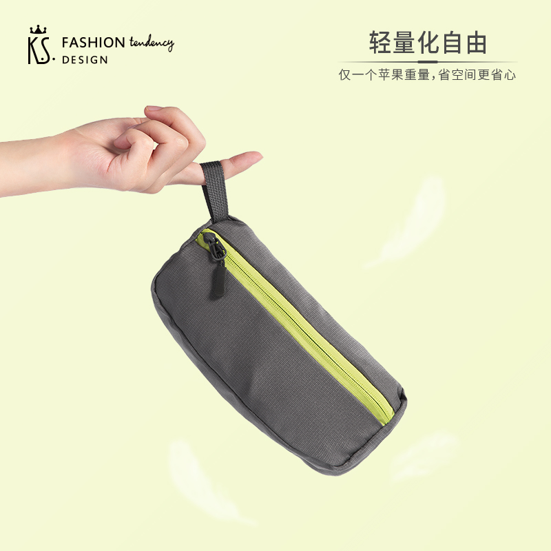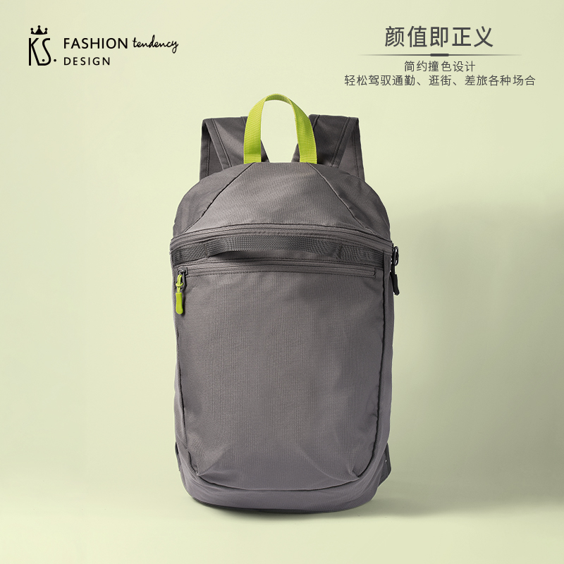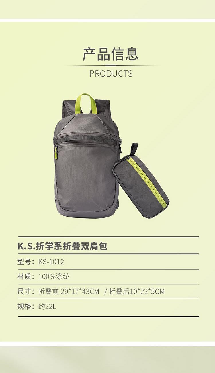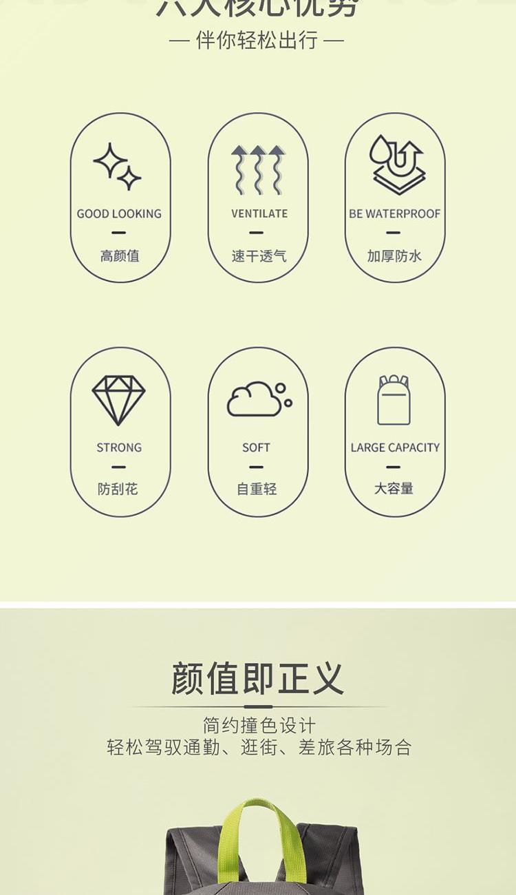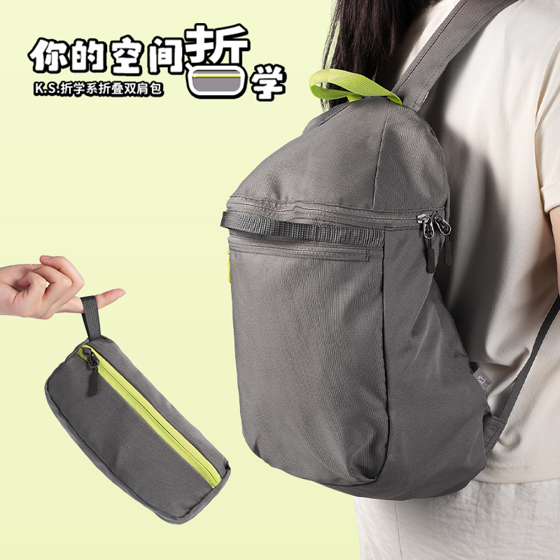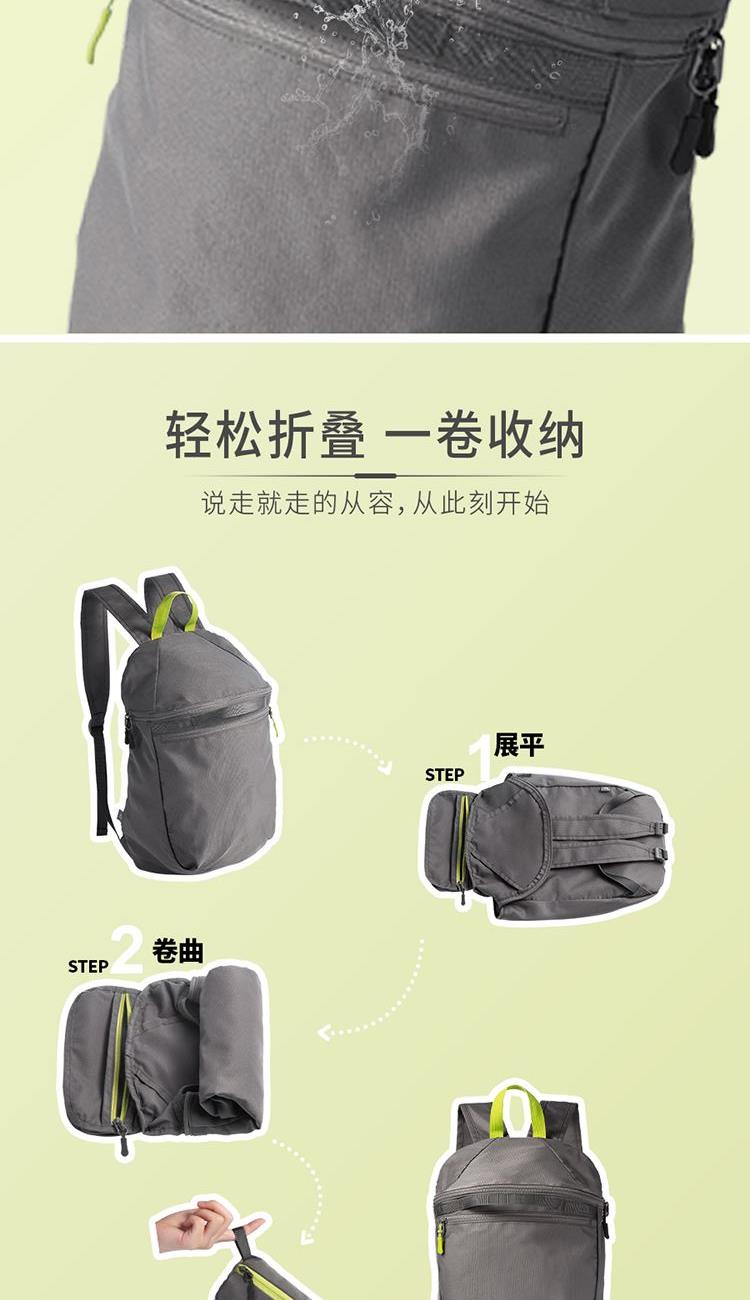 1.轻便,轻量化设计: 自重轻盈,背负无负担,出行更轻松。 2.一键折叠,收纳无忧: 轻松折叠成小巧体积,节省空间,通勤旅行随取随用。 3.22L大容量,通勤旅行皆宜: 轻松容纳笔记本电脑.衣物.日常用品,满足多种场景需求。 4.防水面料,从容应对: 高密度面料有效抵御日常泼溅和小雨,保护包内物品干爽。 主料:尼龙塔丝隆,成分:99.9%尼龙 里布:牛津布,99.9%涤纶 提手:99.9%涤纶