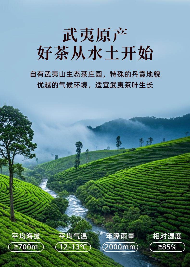 自有武夷山生态茶庄园,特殊的丹霞地貌,优樾的气候环境,适宜武夷茶叶生长。
