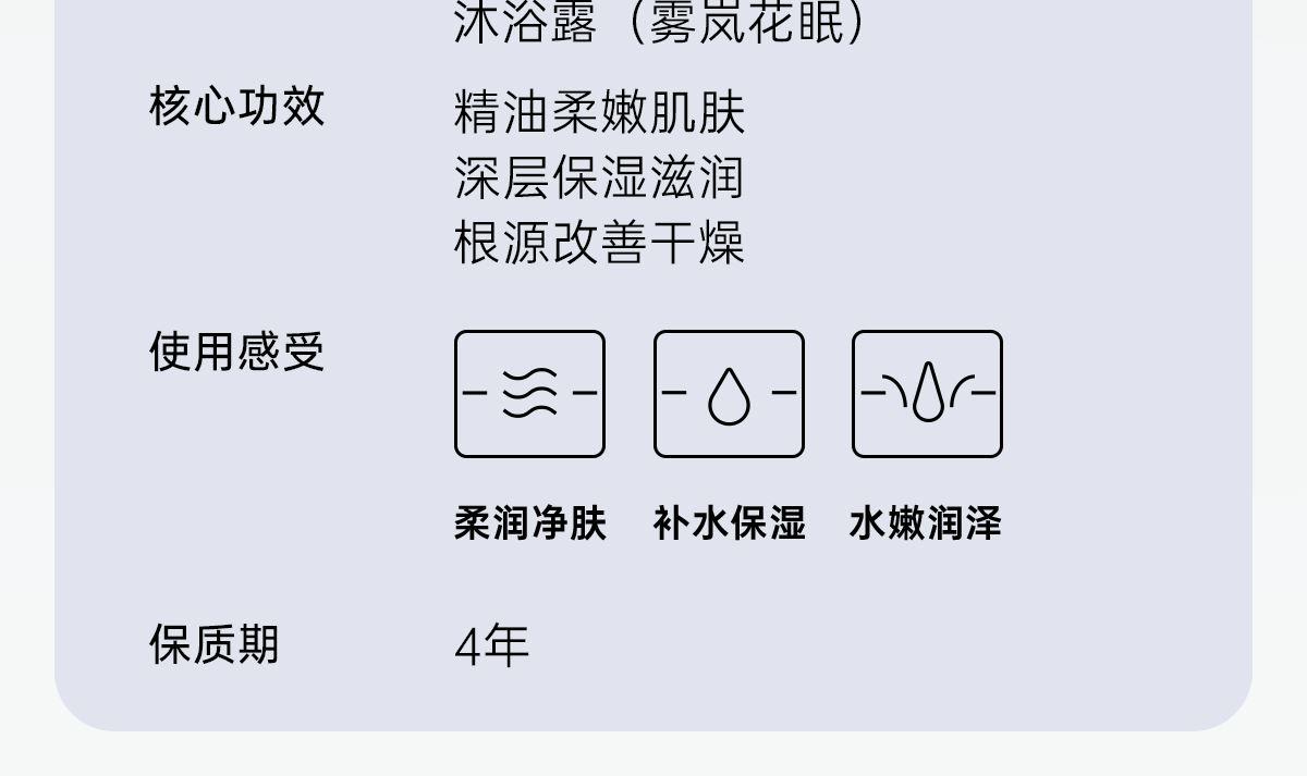 核心功效: 精油柔嫩肌肤 深层保湿滋润 根源改善干燥 产品卖点: 柔润净肤 补水保湿 水嫩润泽