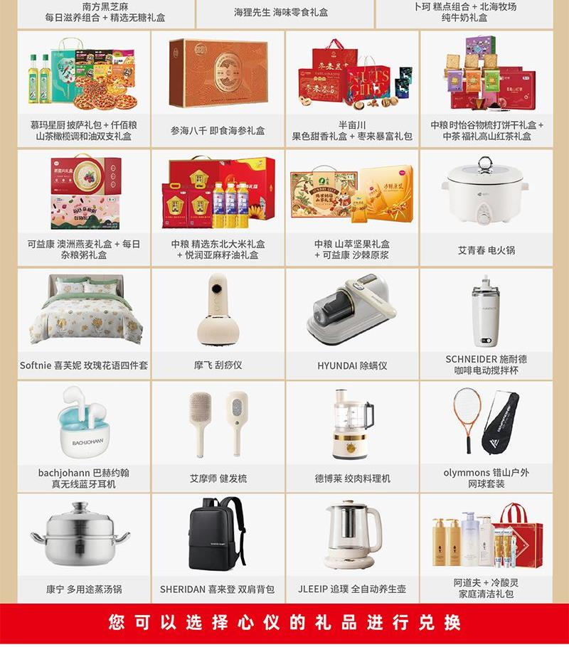 选项1 紫燕 熟食礼盒 选项2 巴比 早餐组合 选项3 南方黑芝麻 每日滋养组合+南方黑芝麻 精选无糖礼盒 选项4 海狸先生 海味零食礼盒 选项5 卜珂 糕点组合+北海牧场 纯牛奶礼盒 选项6 慕玛星厨 披萨礼包+仟佰粮 山茶橄榄调和油双支礼盒 选项7 参海八千 即食海参礼盒 选项8 半亩川 果色甜香礼盒+半亩川 枣来暴富礼包 选项9 中茶 福礼高山红茶礼盒+中粮 时怡谷物梳打饼干礼盒 选项10 可益康 澳洲燕麦礼盒+可益康 每日杂粮粥礼盒 选项11 中粮 皇家粮仓天下米行精选东北大米礼盒+中粮 悦润亚麻籽油礼盒 选项12 中粮 山萃坚果礼盒+可益康 沙棘原浆 选项13 康宁 多用途蒸汤锅 选项14 Morphyrichards摩飞 刮痧仪 选项15 SCHNEIDER施耐德 咖啡电动搅拌杯 选项16 艾青春 电火锅 选项17 SHERIDAN喜来登 双肩背包 选项18 Softnie喜芙妮 玫瑰花语床单被套四件套 选项19 HYUNDAI 除螨仪 选项20 BACHJOHANN巴赫约翰 真无线蓝牙耳机 选项21 艾摩师 健发梳 选项22 德博莱 绞肉料理机 选项23 olymmons错山户外 网球套装 选项24 JLEEIP追璞 全自动养生壶 选项25 阿道夫+冷酸灵 家庭清洁礼包