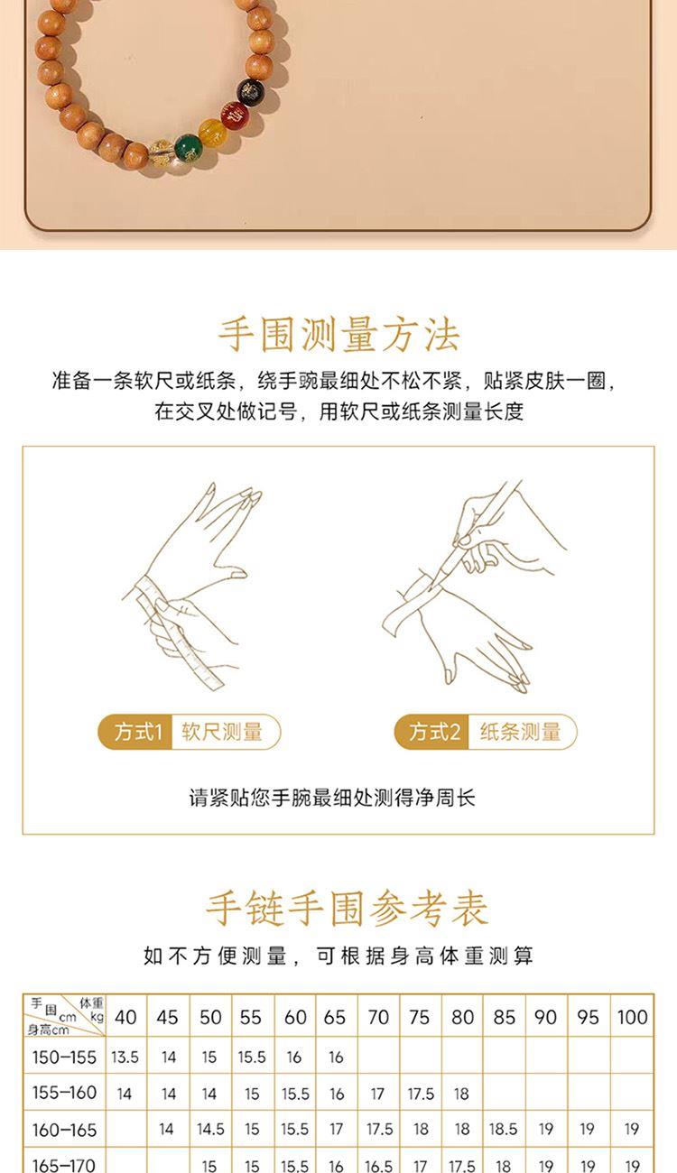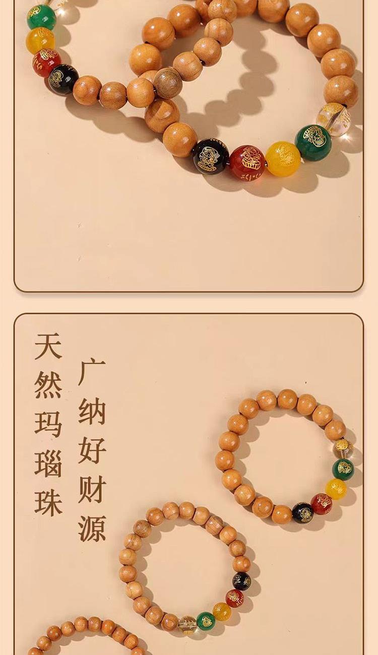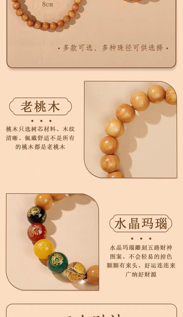 招财与守财并举: 五路财神桃木手串寓意不仅积极地从五方招揽财富,还能牢牢地守住财富,防止破财、漏财(桃木辟邪,阻挡小人、厄运)。 吉祥与平安共存: 寓意在追求财富的同时,也保障了家宅和家人的平安顺遂,体现了“家和万事兴”的传统理念。 正能量场域: 桃木的浩然正气与财神的祥瑞之气相结合,寓意着能在摆放的空间内形成一个强大的正能量磁场,促进事业兴旺,人际和谐。