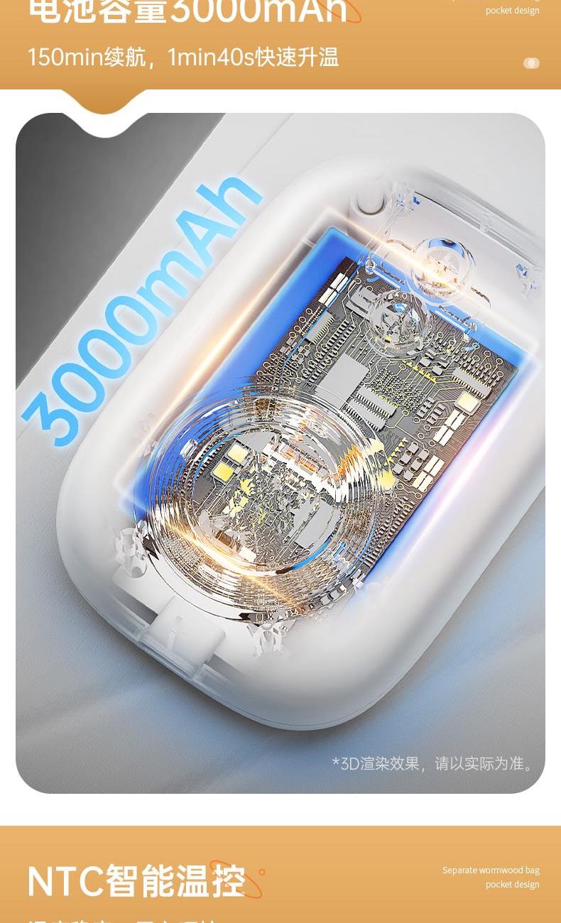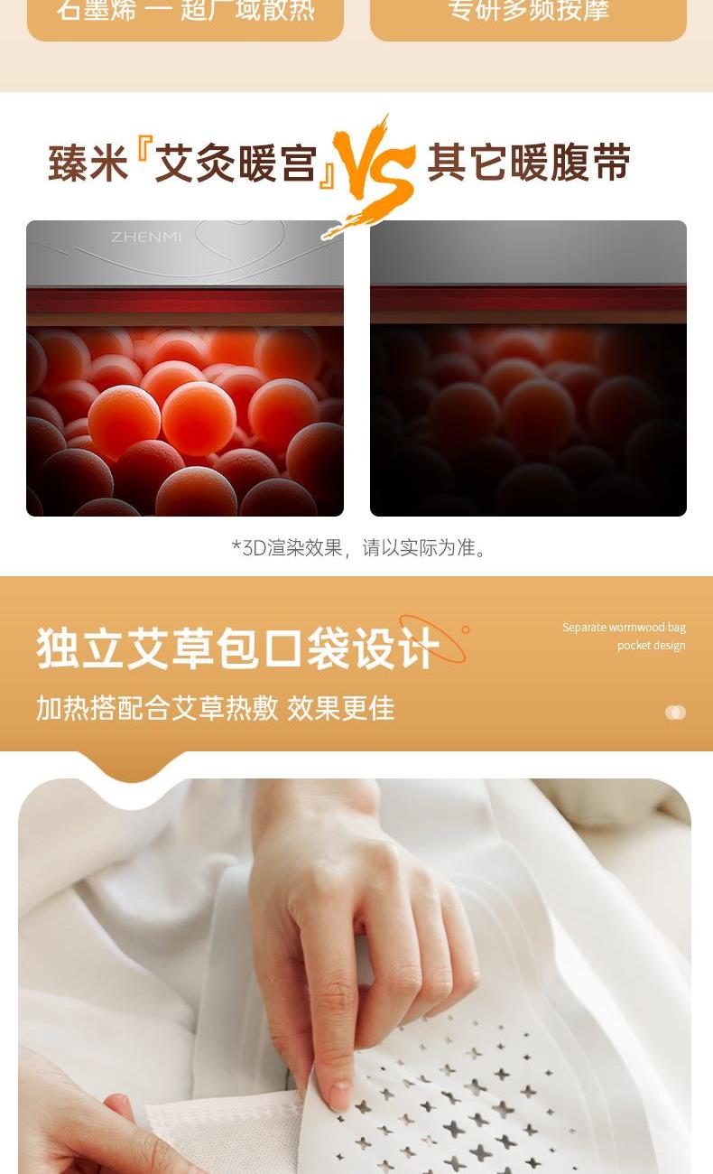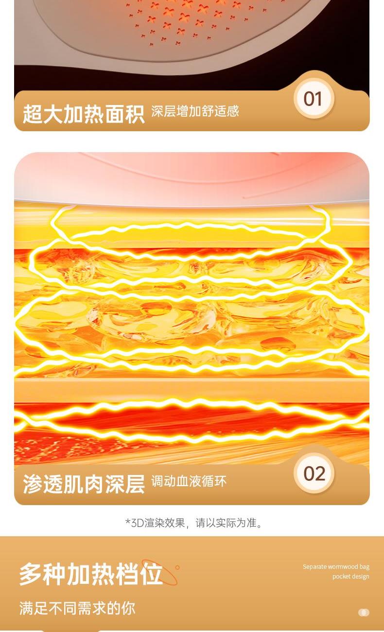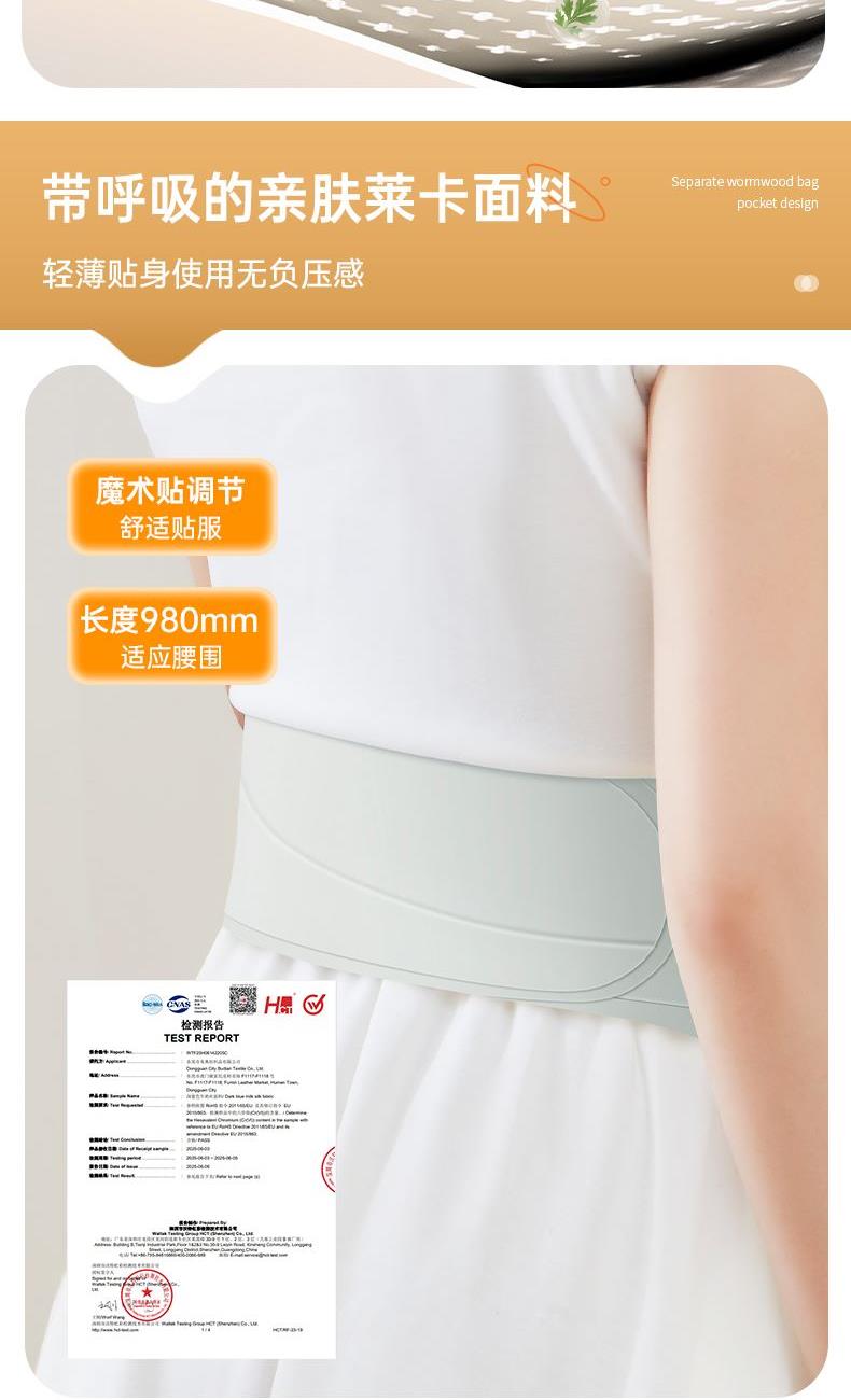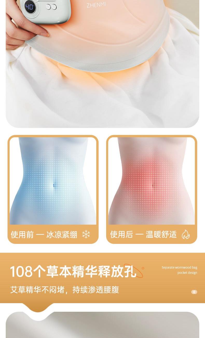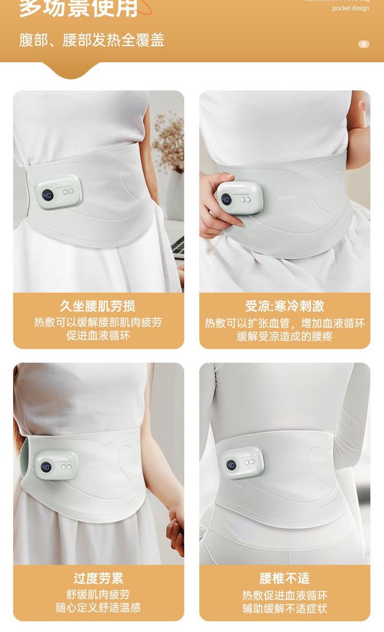 优质莱卡面料,一体成型,无针线设计柔软亲肤,贴身使用更舒适(注意60-65度建议隔衣使用,避免烫伤); 超薄设计,告别传统长方形暖宫腰带,隐藏使用,告别尴尬; 5位触点磁吸式独立控盒设计,一放,一吸即锁定,使用超方便,行走起来更牢固; 3档震动按摩,缓解腹部压力,升级2位振源设计,不仅暖宫,更能热敷按摩腰部,缓解疲劳; 40°C/45°C/50°C/55°C/60°C/65°C 六档热敷功能,满足不同人群,更多使用场景; 3000mah大容量电池,续航100min 15Min自动定时, 225cm²超大发热面积覆盖面积更广,使用更贴心 加宽260mm里面魔术贴,满足更多人群使用需求; 独立艾草包位置设计,满足更多养生使用需求 振动、发热独立控制,根据个人喜好选择使用,更方便。