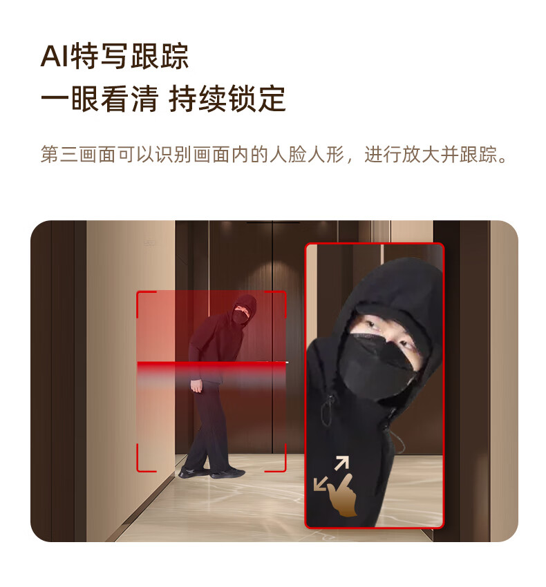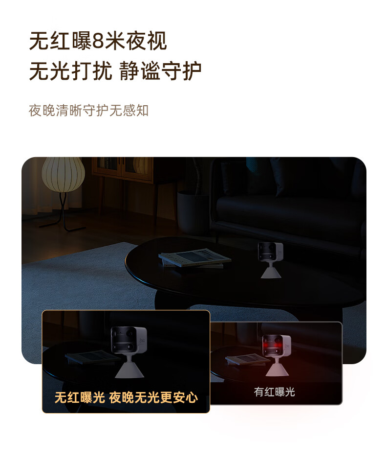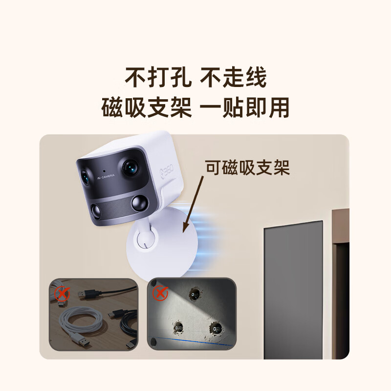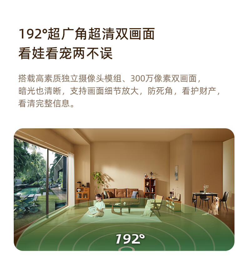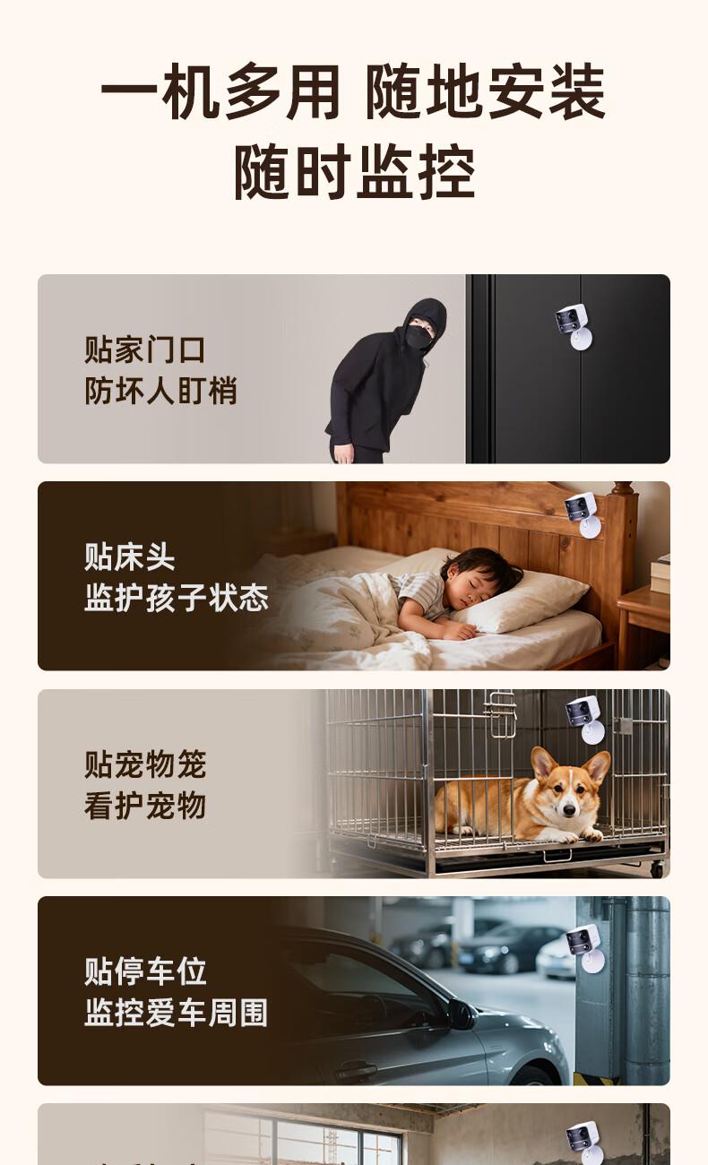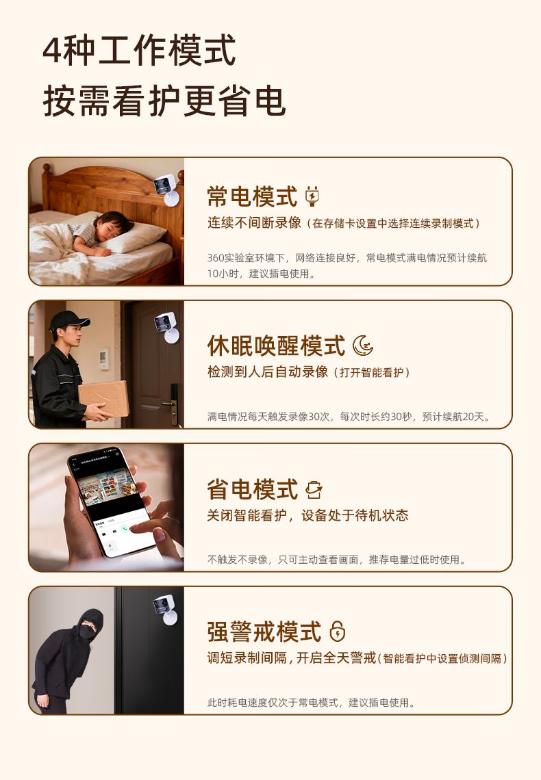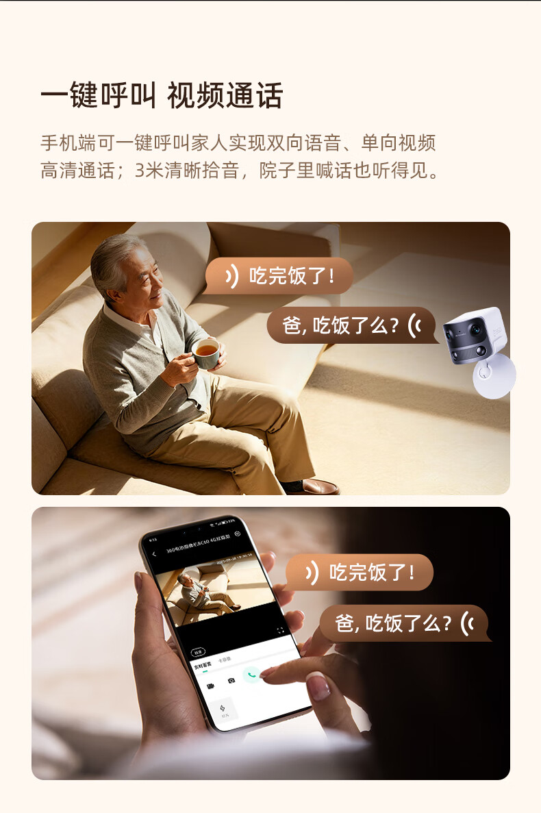 产品参数: 1、300W像素、旋转角度:192°广角视野,自带4G网络 2、重量:0.3kg、包装尺寸:150*97*50mm 产品功能: 1、双镜头,看的广,无电无网都能用,自带流量长续航。 2、一机多用,。 3、AI特写跟踪,一眼看清,持续锁定。 3、三画面,超广角,两个区域同时看, 4、无红曝8米夜视,无光打扰,静谧守护, 5、不打孔,不走线,磁吸支架一贴即用, 6、自带流量卡,无网环境也能用,超长续航免插电,持久守护不担心。 7、一键呼叫,视频通话,实时查看回看。