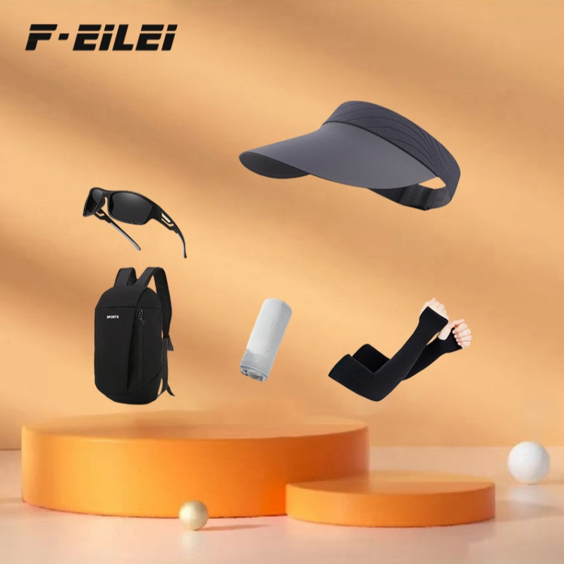产品材质:帽子:冰丝聚酯纤维 墨镜:pvc 背包:聚酯纤维 运动巾:冰丝+聚酯纤维160g 冰袖:锦纶氨纶 产品规格: 帽子:54-58cm 冰袖:均码 背包:21*38cm 产品组合: (防晒帽背包墨镜冰袖运动巾)