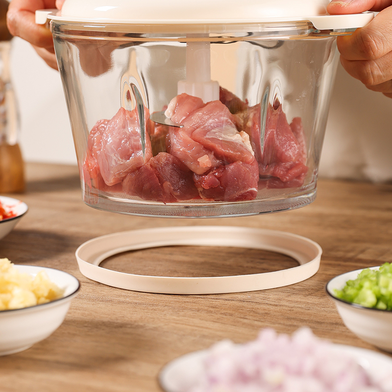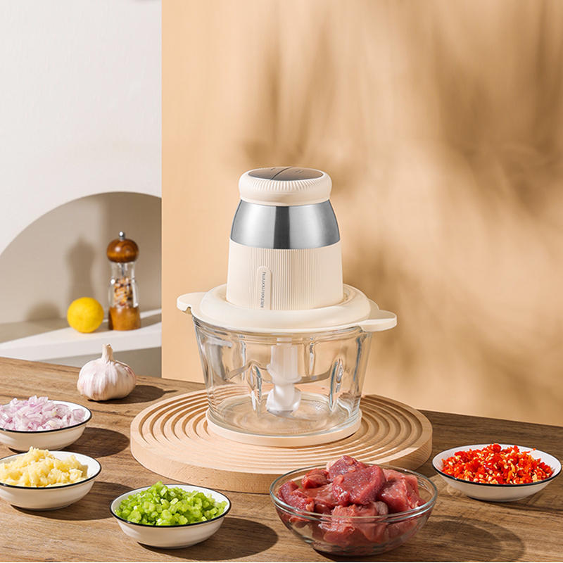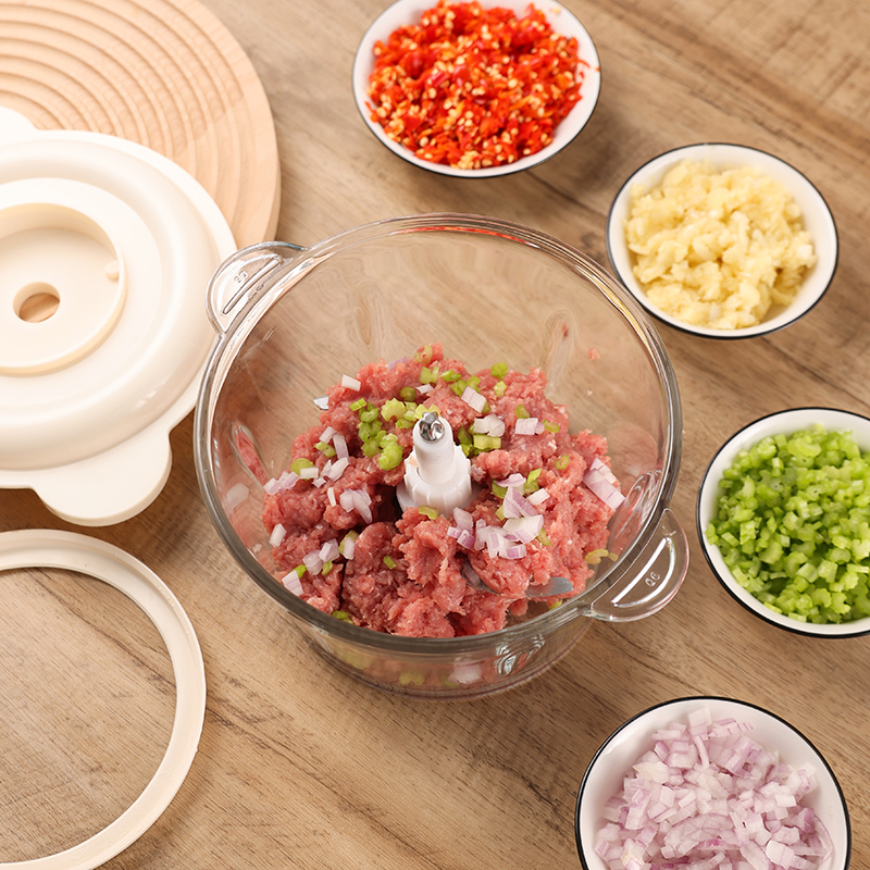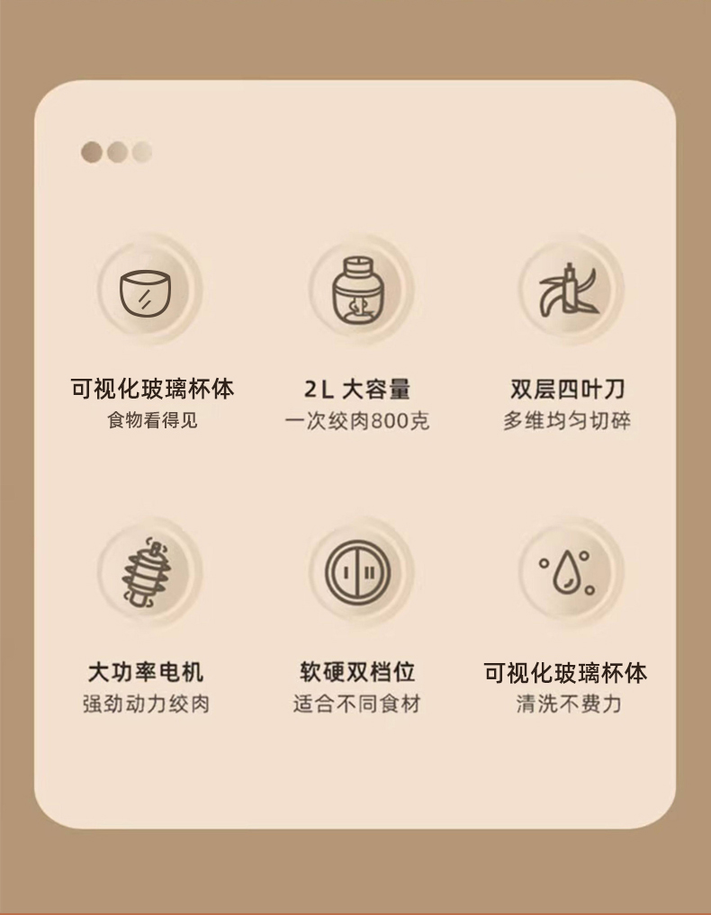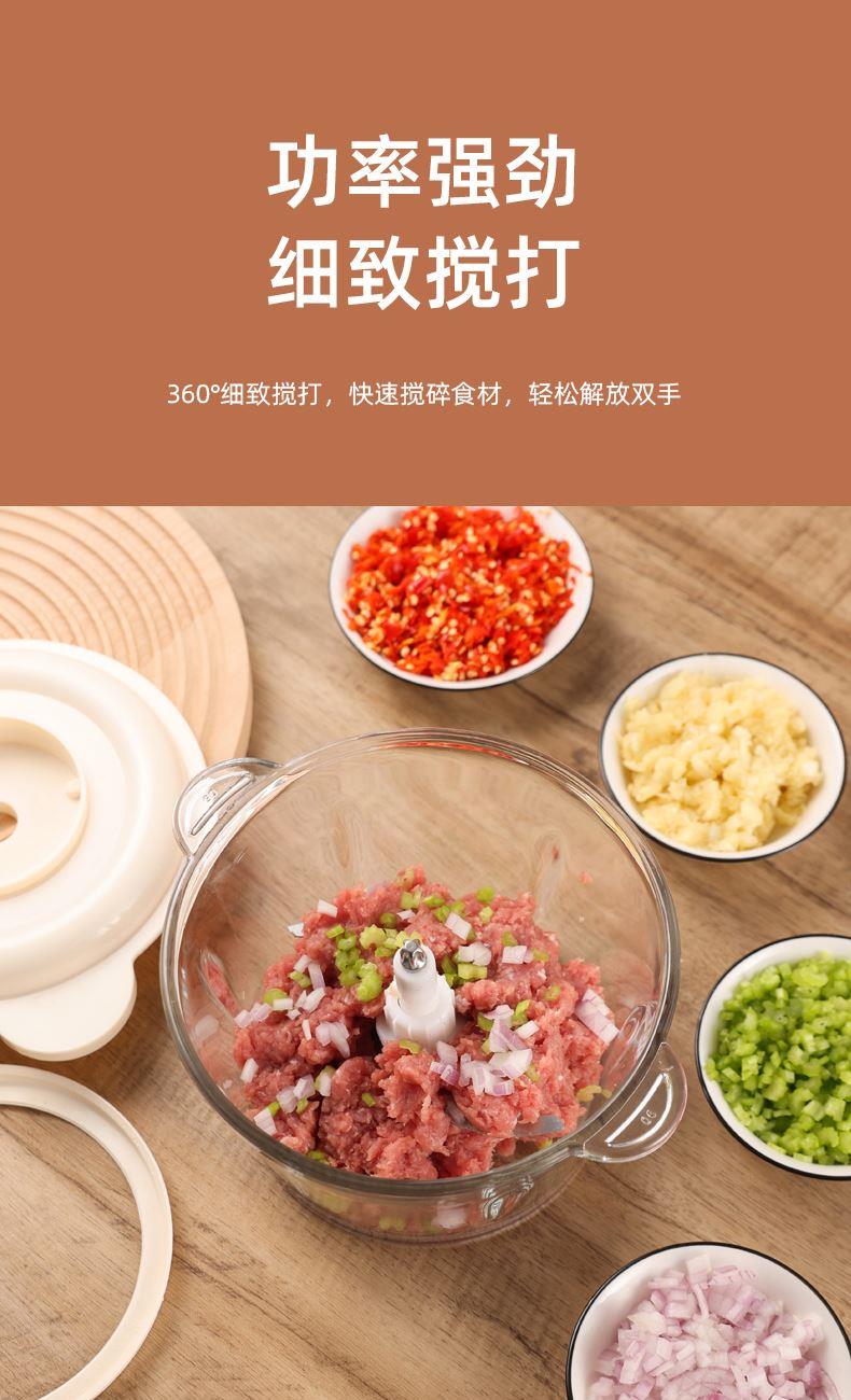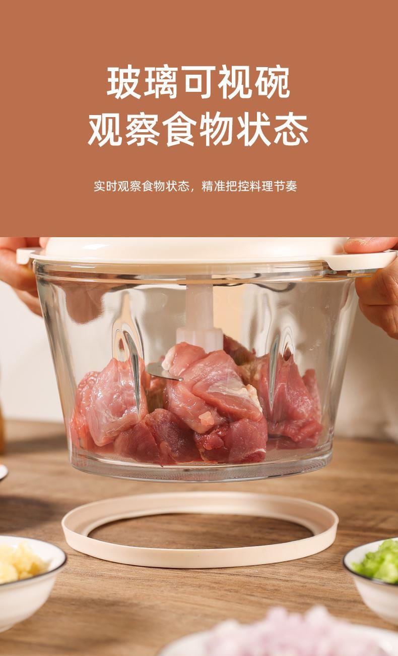功率:300W 电压:220V 容量:2L 毛重:1.95Kg 材质:外壳PP+304不锈钢 彩盒包装尺寸:310*210*163mm 外箱包装尺寸: 635*330*520mm 推荐理由: 1、304不锈钢4叶精钢刀,绞肉只需要几秒 2、300W大功率纯铜电机,动力强 3、双按键操作,快,慢可切换 4、不锈钢机头, 可视化玻璃杯体,食品安全 5、2升大容量,满足全家所需 6、加厚防滑杯垫,绞肉操作更方便