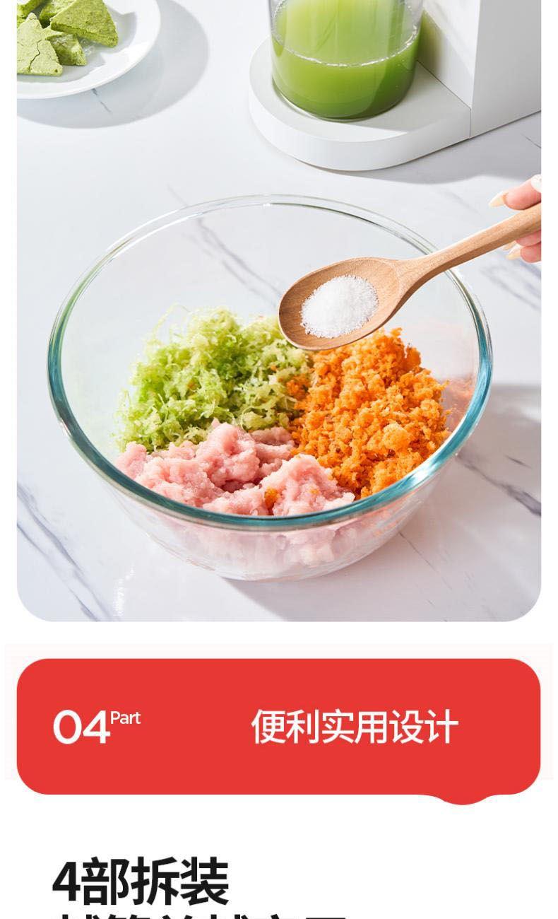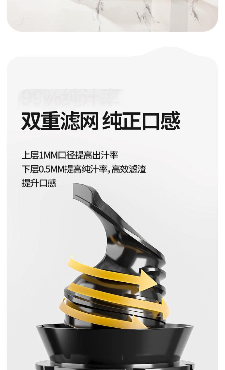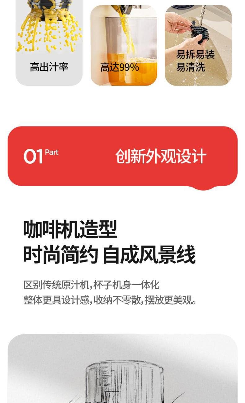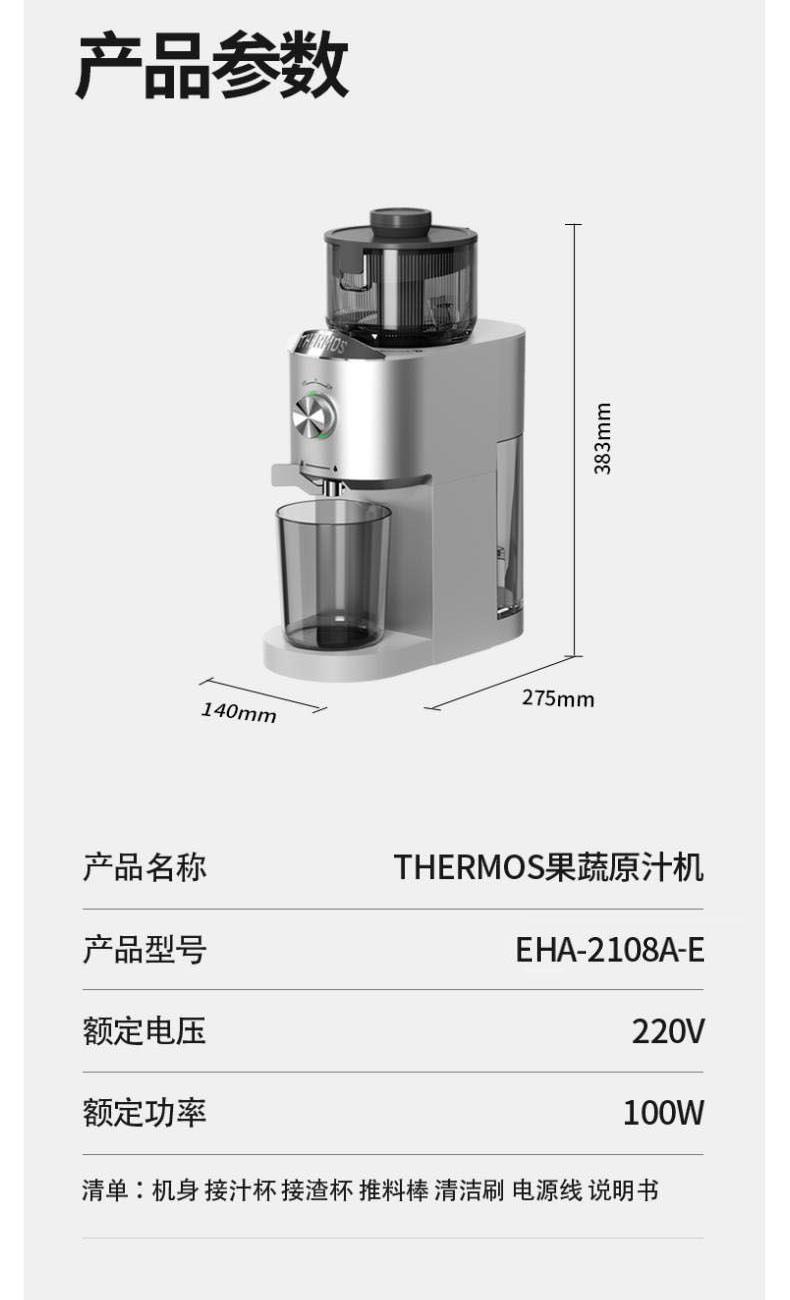 额定电源 :220V~50Hz 额定功率 : 100W 接汁杯容量:1.5L 接渣桶容量:0.9L 净 重 : 2.8kg 产品尺寸 :275mmx140mm x383mm (含推进杆)