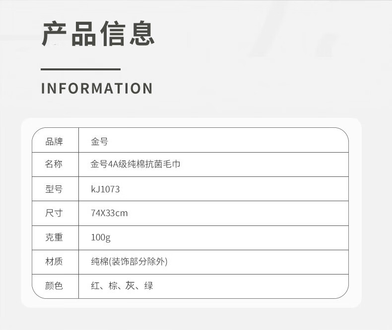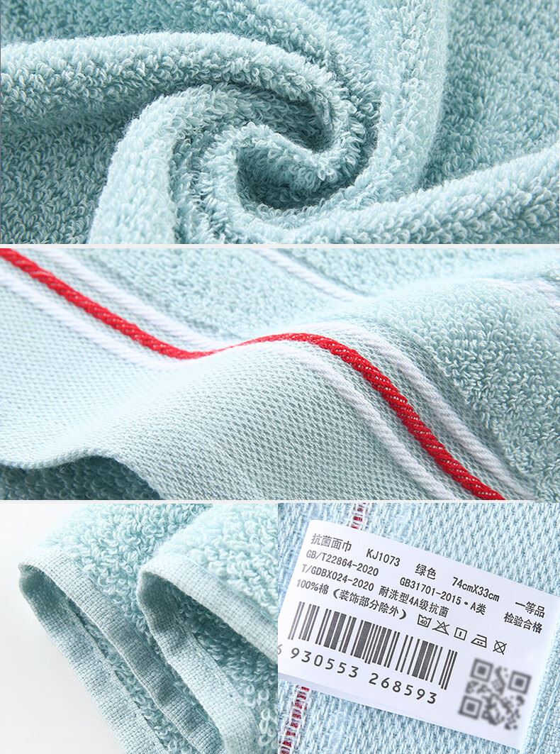 材质:纯棉 货号:KJ1073 颜色:绿 灰 产品说明: 1.用心选好棉制成棉纤维,细长而柔软通过生产工艺让棉纤维在纺纱时充分接触空气,。 2.精梳大毛圈蓬松丰盈,加长毛环易吸水储水,轻轻擦拭即刻吸干面部水渍,肌肤悦亨清爽洁净。 3.无甲醛、无荧光剂、无致癌香胺,严选好材,纤长细软,蓬松柔韧。