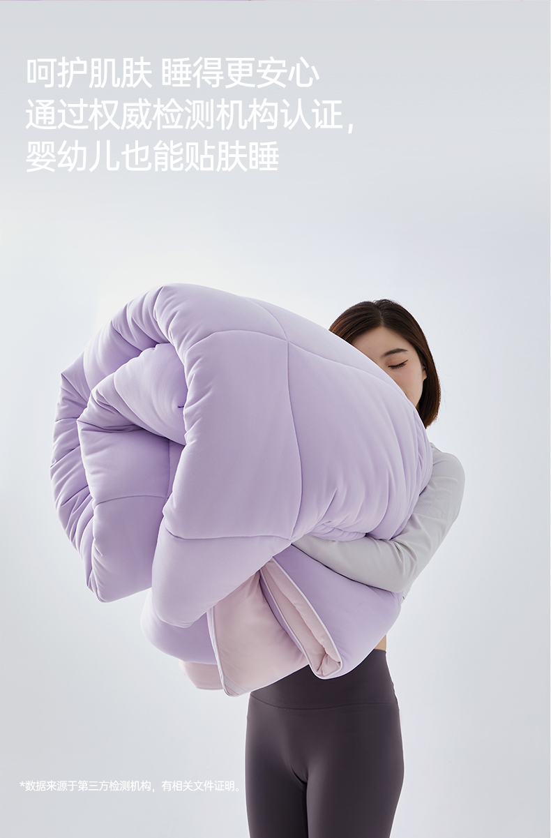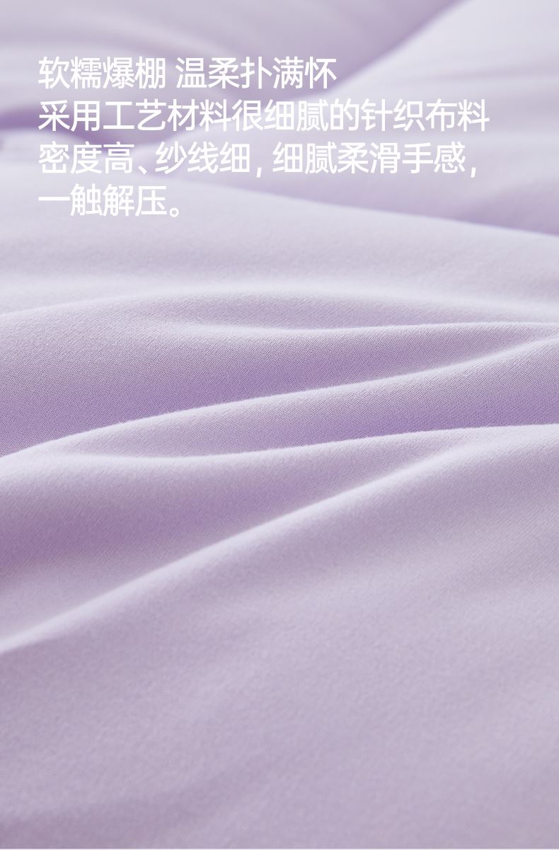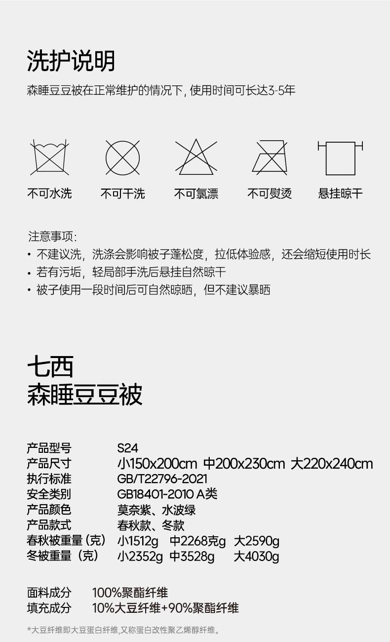 产品规格: 冬被(150*200cm、200*230cm、220*240cm) 产品净重:冬被:2.3kg、3.5kg、4kg 外箱毛重: 冬被:3.35kg、4.52kg、5.03kg 外箱尺寸冬被:300*300*530mm 产品颜色:水波绿/莫奈紫 1.采用密度高纱线细的针织面料工艺,颠覆传统针织面料手感,柔软度超过市面上95%的被子 2.科学配比大豆纤维填充物,针织面料工艺打造柔软滑糯,蓬松睡不扁 3.定位衔缝工艺结合固定面料填充平整贴合,速热锁温 4.天然大豆纤维填充,加乘针织面料工艺吸湿透气,婴儿也能贴肤睡