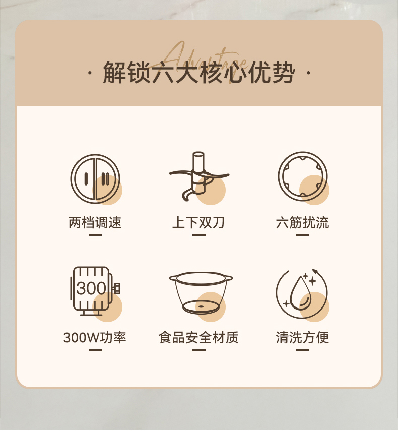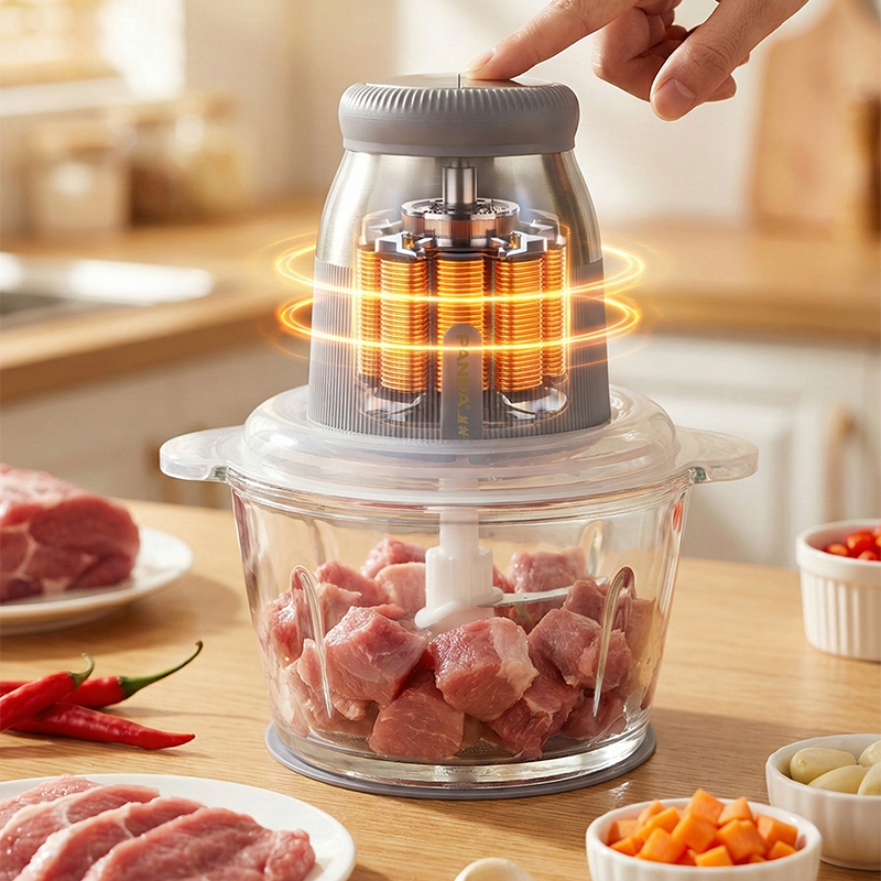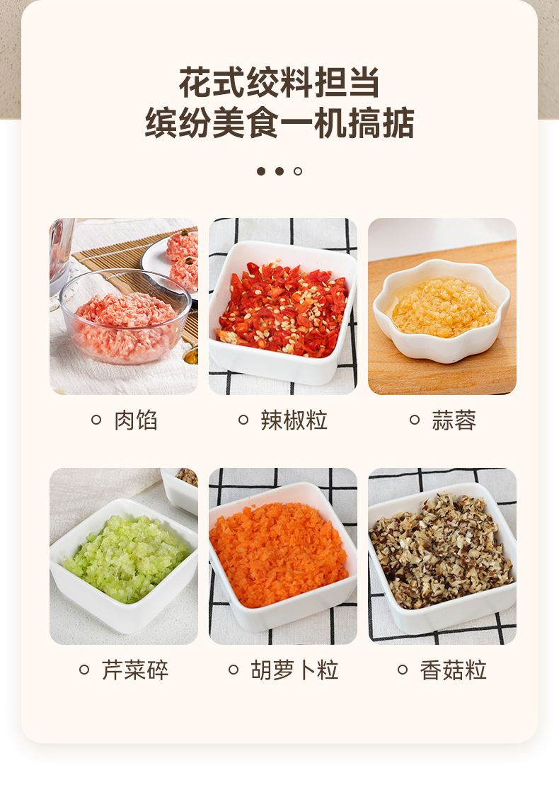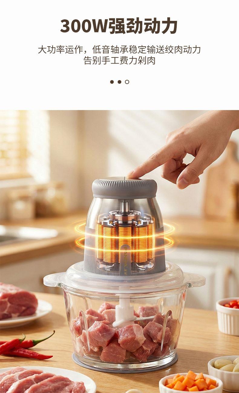 绞肉绞菜两用,一机多能,满足多样需求 玻璃碗体,健康材质,清洗方便 快慢双档设计,软硬食材轻松应对