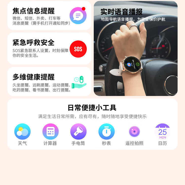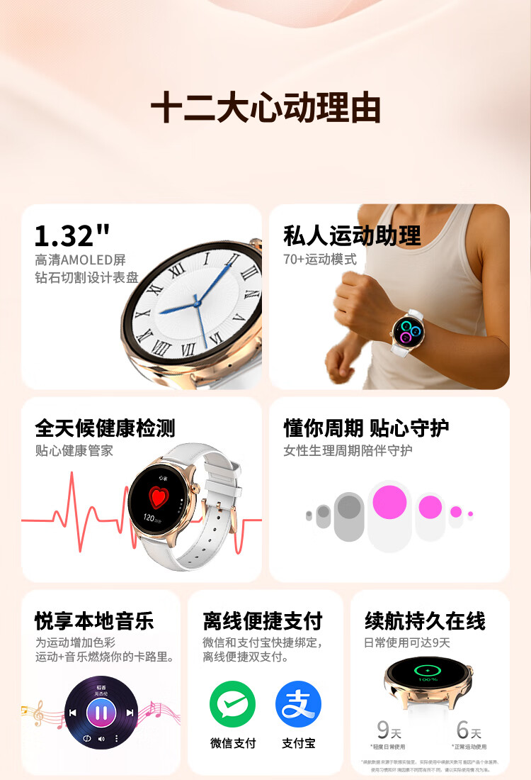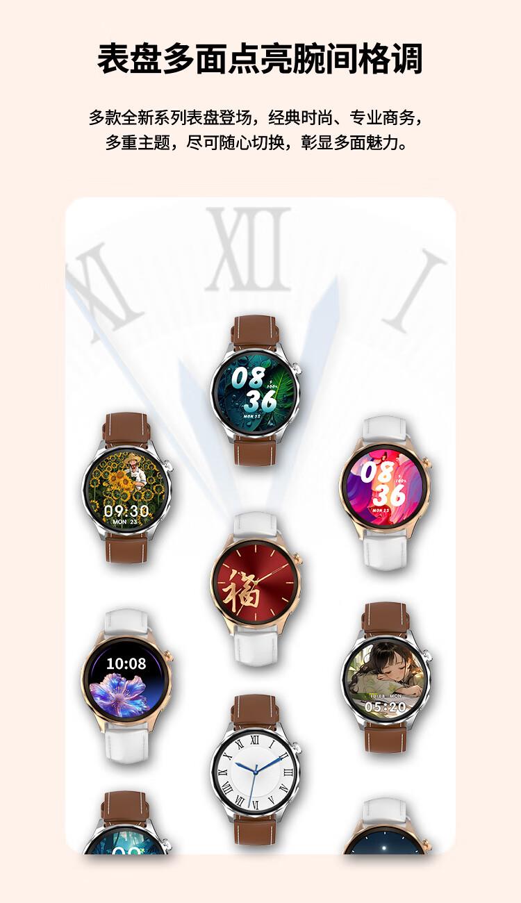 1.32英寸 AMOLED 熊猫玻璃 锌合金真空镀 塑胶喷涂钢琴黑 不锈钢电镀 钢化玻璃+电镀丝印工艺 磁吸快拆皮表带+硅胶表带 304不锈钢 43.4*11mm IP68 微信支付、支付宝支付、乘车码、AOD熄屏表盘、AI精美表盘、AI表盘相册,菜单壁纸、语音备忘录、个性化铃声,本地音乐/相册、遥控拍照、导航、世界时钟、翻译官、活体识别、SOS、天气、手电筒、计算器