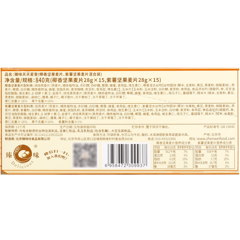 臻味椰香坚果麦片28g*15小袋 臻味紫薯坚果麦片28g*15小袋