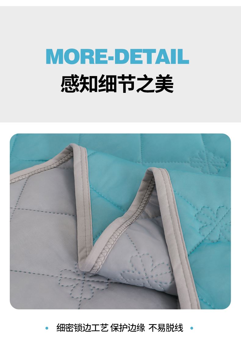 规 格:150*200cm 花 型:豆沙、果绿、湖蓝、魅紫、墨绿、浅粉、浅绿、天蓝、 面 料:仿锦氨(聚酯纤维) 填充物:聚酯纤维 面料光泽自然,手感细腻, 透气滑爽,温尔不燥,面料采用A类标准科技凉感丝,直接和肌肤亲密的接触,细密锁边工艺 保护边缘 不易脱线,随便机洗,解放双手。花式无线绗缝,有效固定填充物。