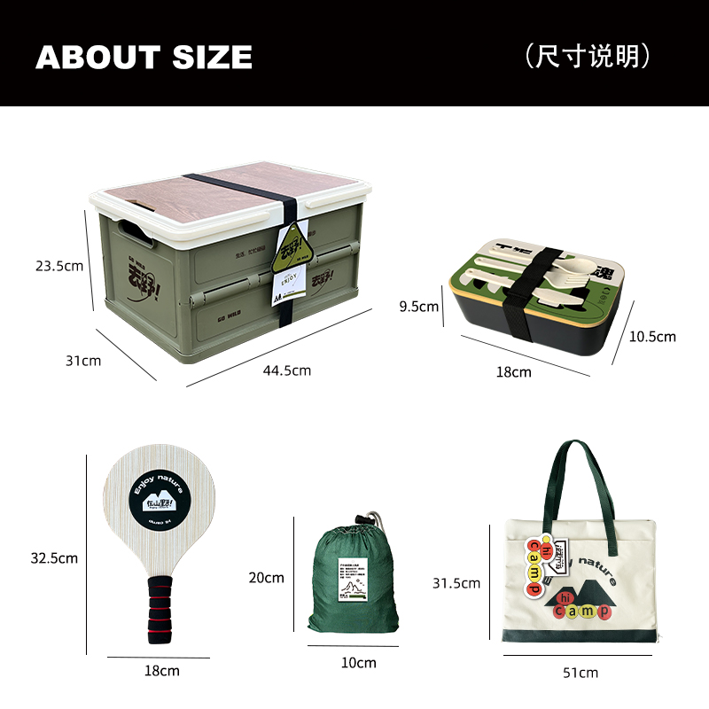 礼盒参数: 折叠篮尺寸:44.5*31*24cm 套装重量:3790g/套 详细介绍: 1.便当盒 品质竹木盖板 尺寸10.5*18*9.5cm 2.板羽球 材质:实心木板 3.单人吊床 承重:150KG 面料:降落伞布210T(尼丝纺) 规格:单人230*90cm 配件:吊床+挂钩2个+绑绳2根 4.三合一帆布包 帆布包/野餐垫/大富翁棋盘 材质:牛津布+防水涂层 展开尺寸145*98cm;帆布包尺寸40*50cm