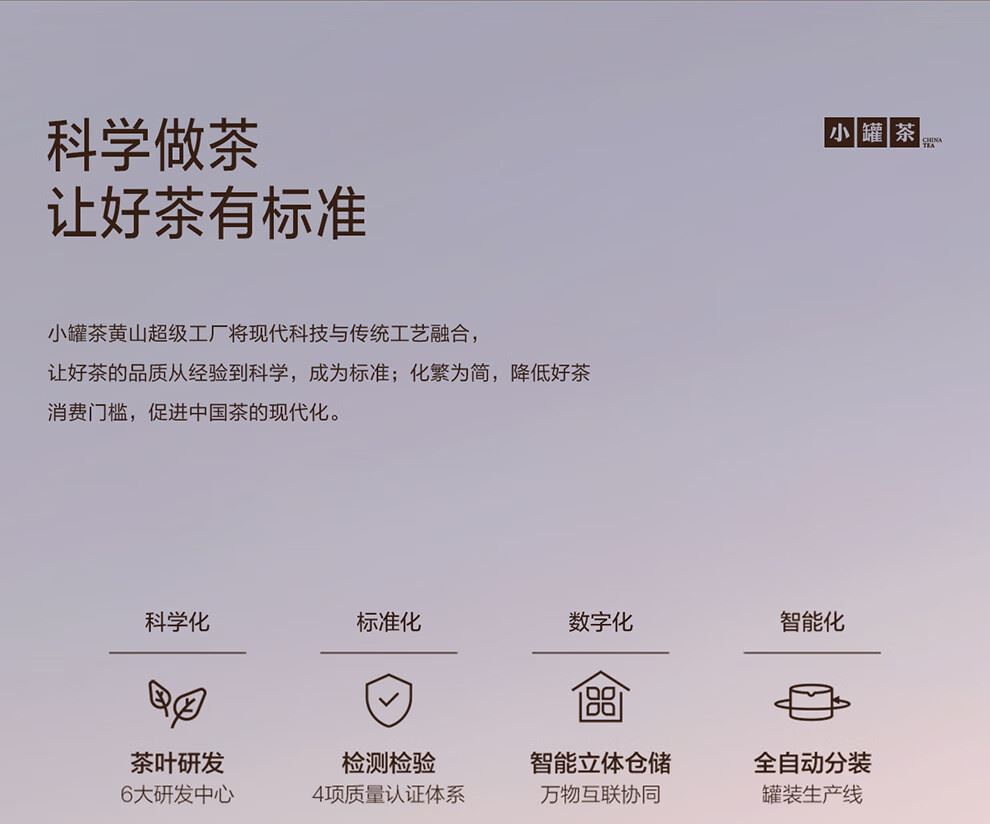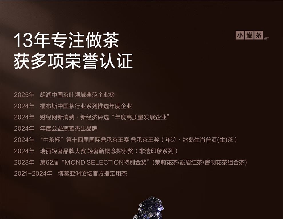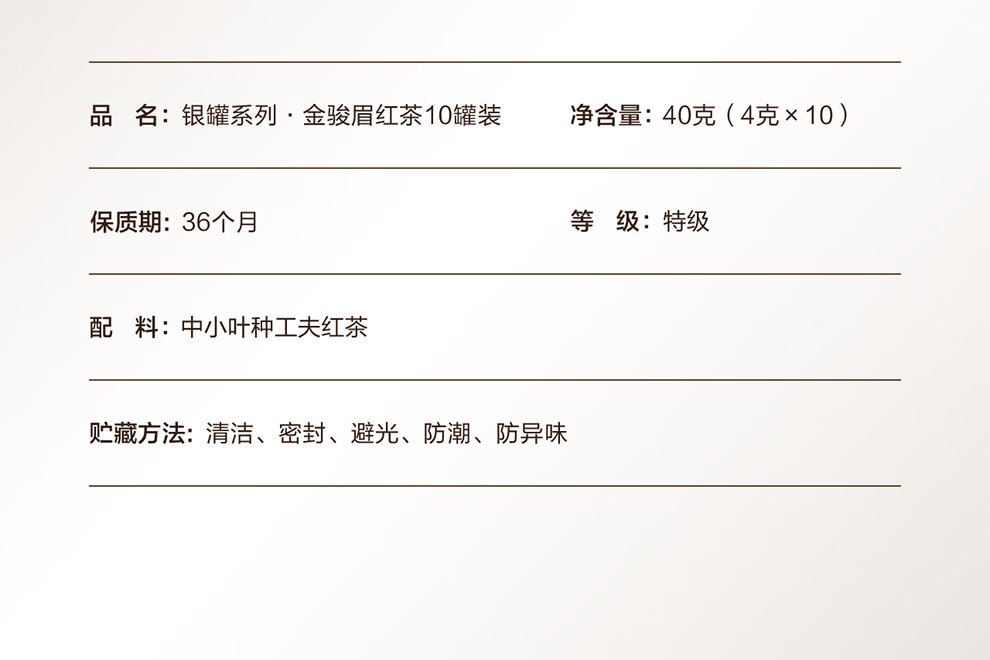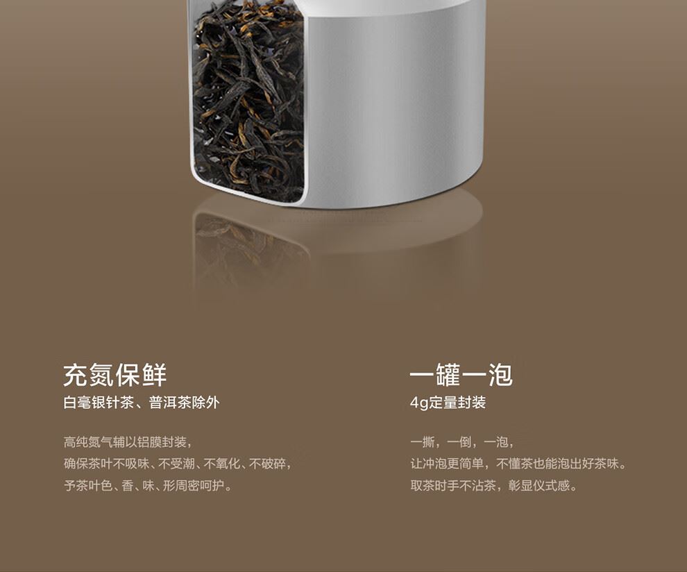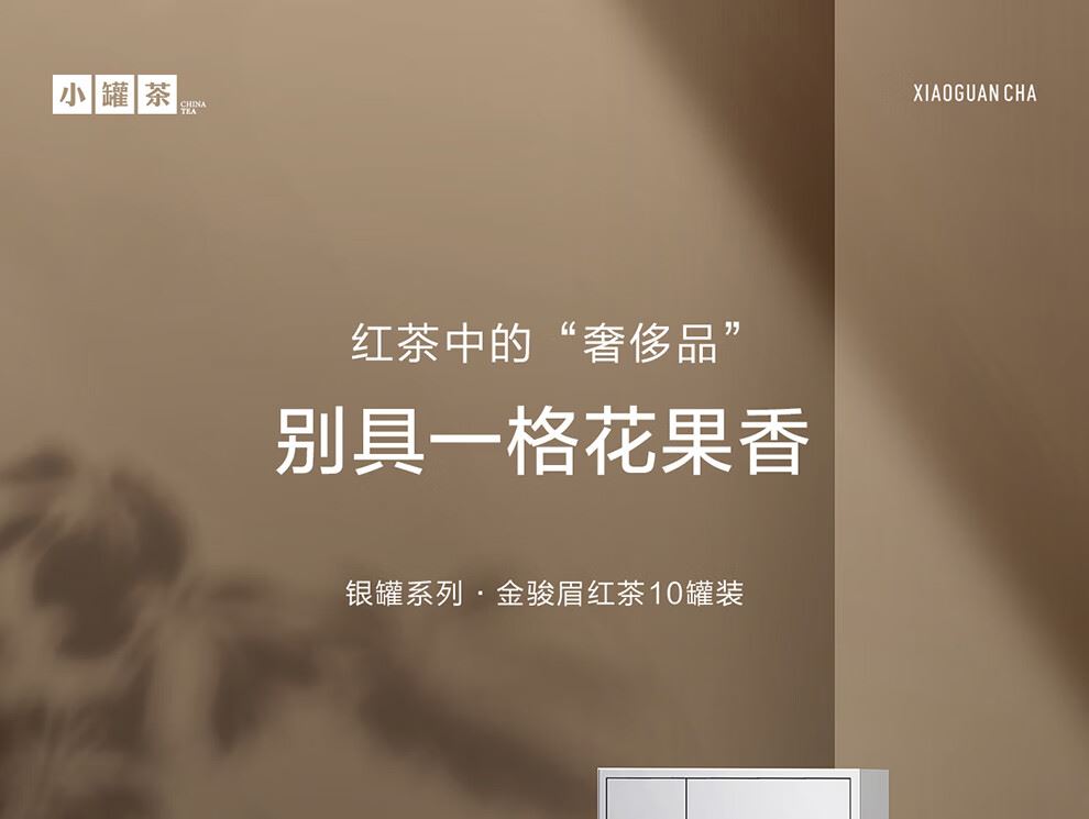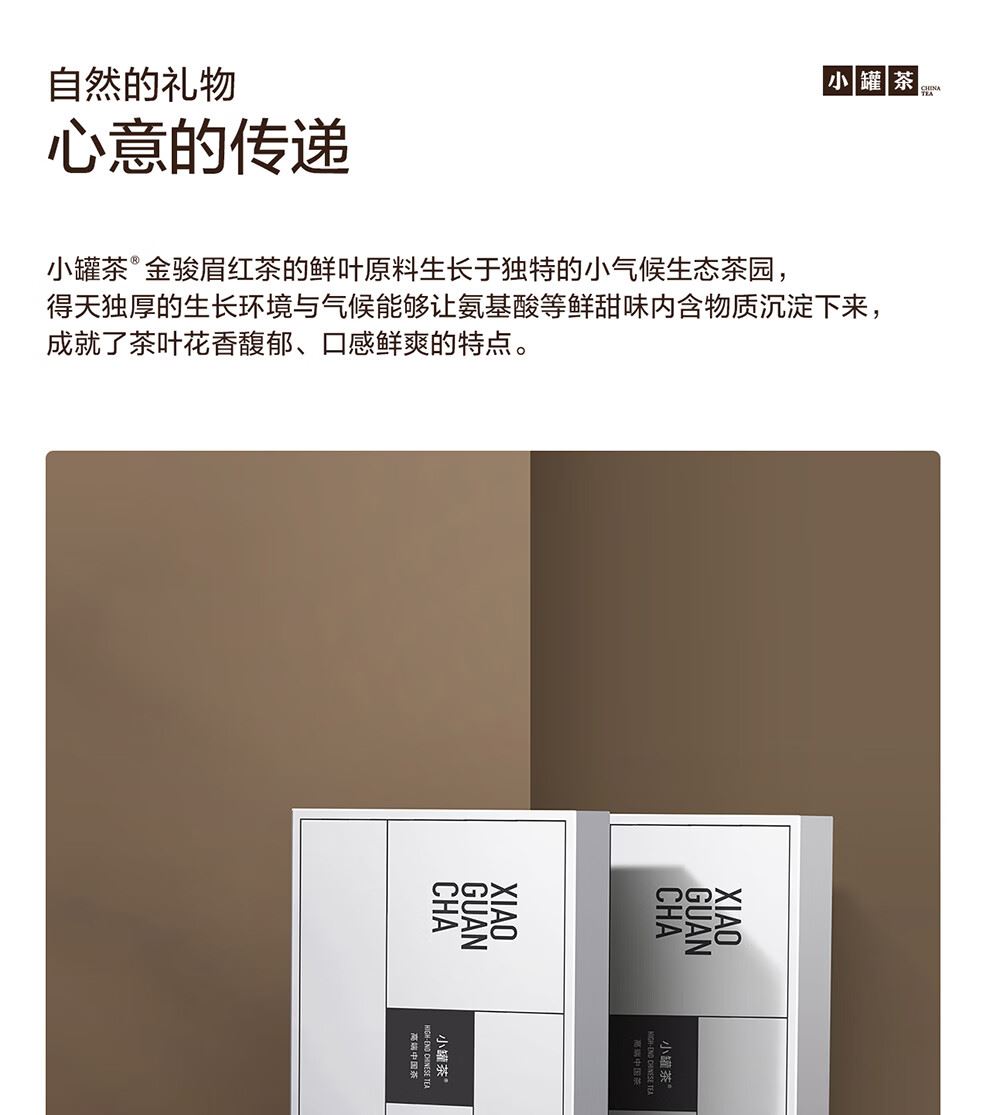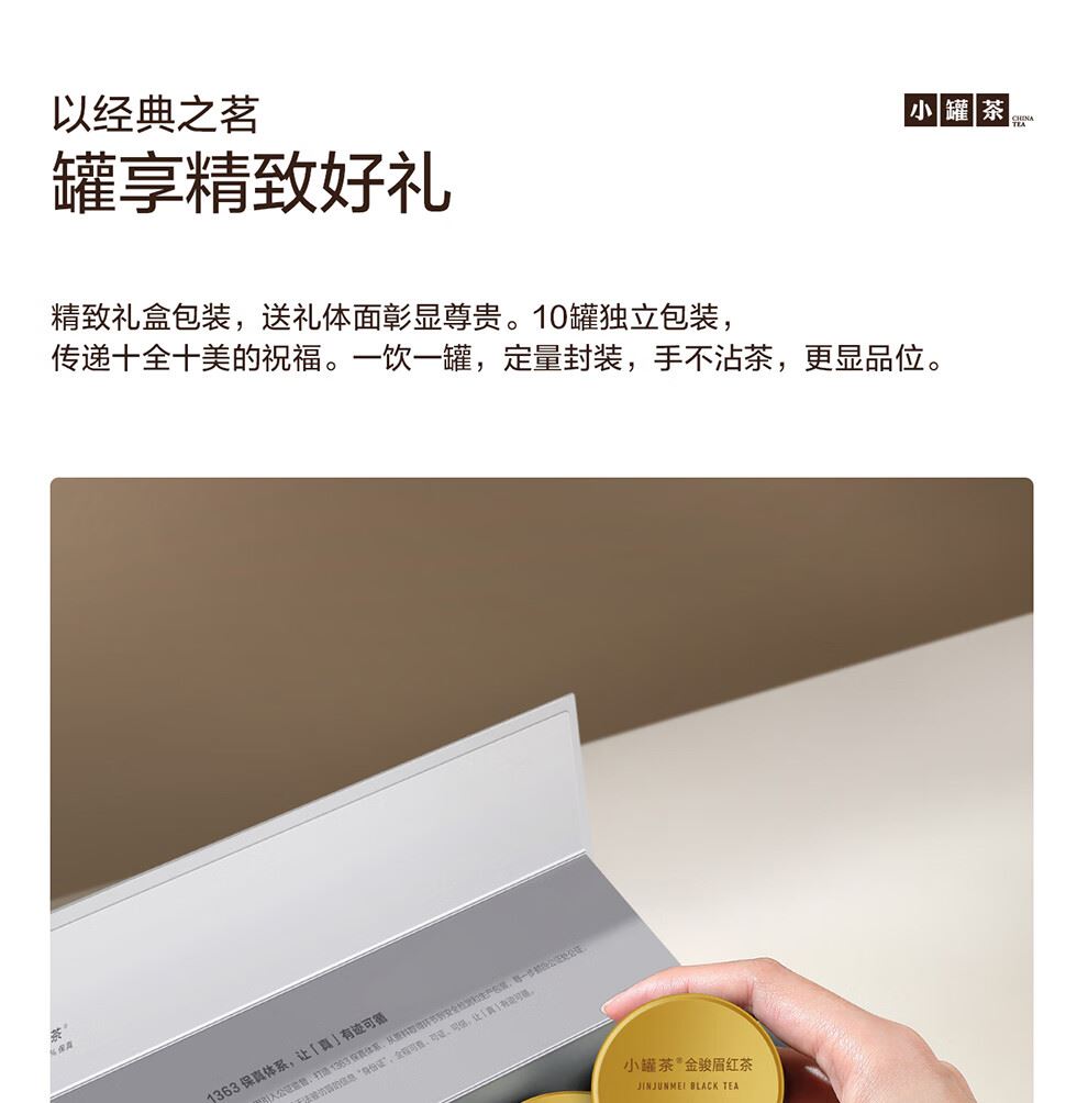 轻奢商务茶叶pinpai-小罐茶 小罐茶全国线下2000+实体门店 小罐茶 x 敢保真(产地保真、年份保真、安全保真) 档次商务送礼就送小罐茶 别具一格的花果香 科学拼配 | 新派金骏眉 | 花果香馥郁 银罐系列 · 金骏眉红茶10罐装 等级:特级 净含量:40克(4克*10罐)保质期:36个月 让舌尖懂茶是好茶的责任 小罐茶金骏眉红茶花果香馥郁,水中带甜、甜中带香,鲜醇甜爽。 以经典之茗 罐享精致好礼 精致礼盒包装,送礼体面彰显尊贵。10罐独立包装,传递十全十美的祝福。一饮一罐,定量封装,手不沾茶,更显品位。