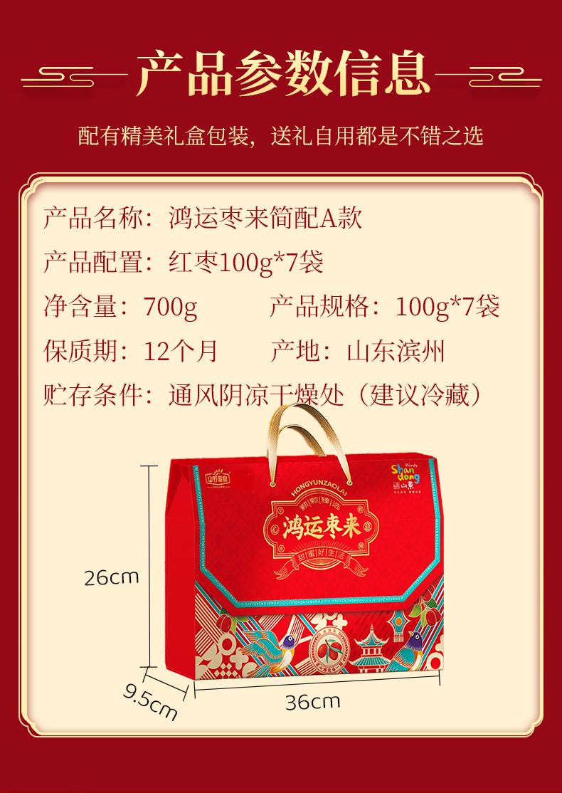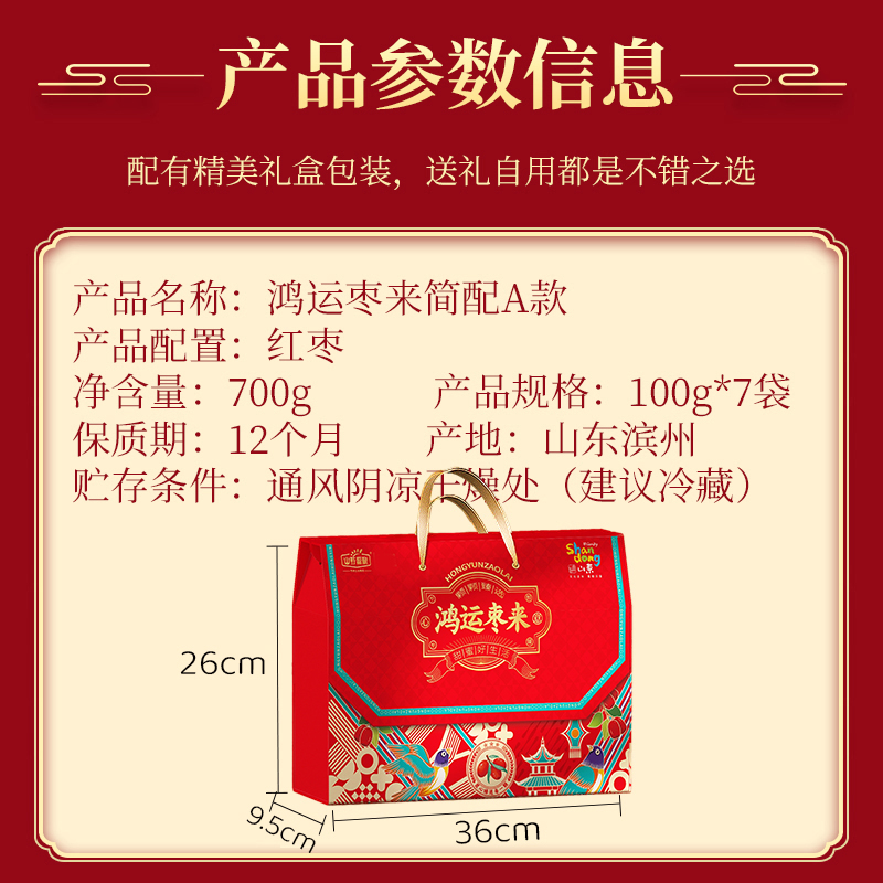 配 料:红枣 规 格:100g*7 净 重:700g 盒尺寸:36*9.5*26 箱重量:13kg 箱尺寸:60*37.5*54(0.122方)