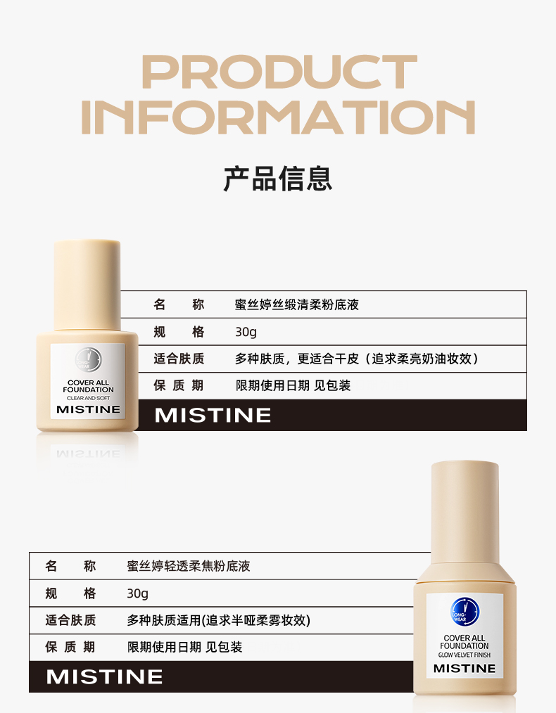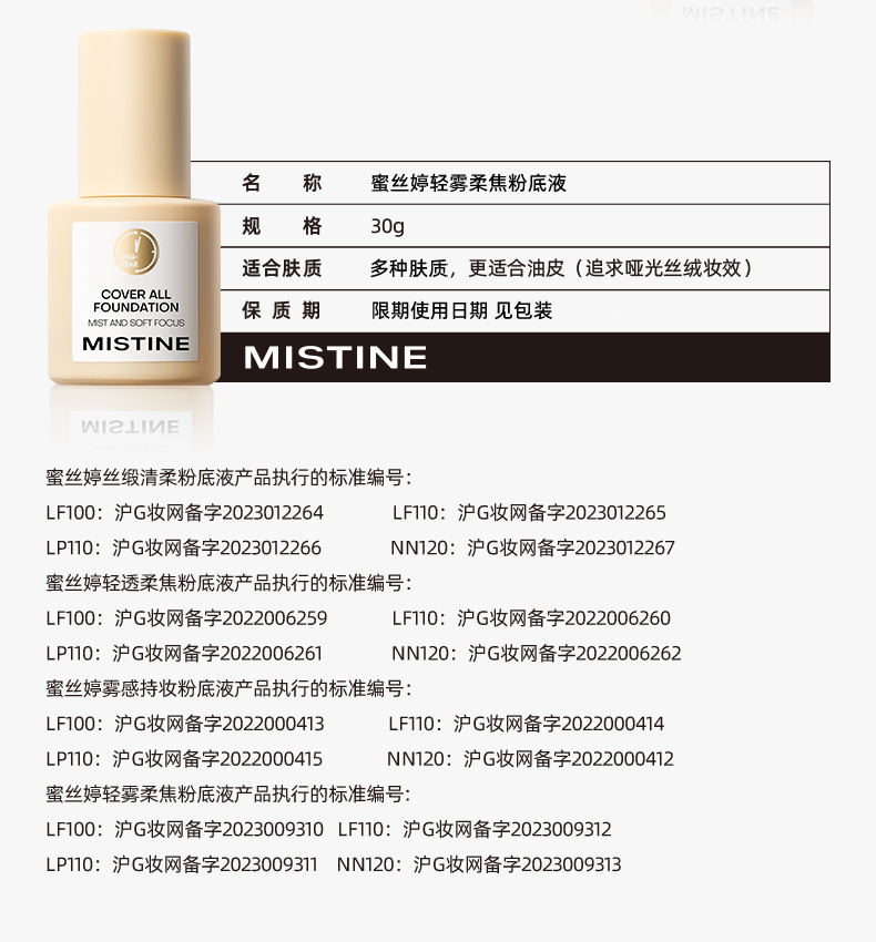 蜜丝婷轻雾柔焦金盾粉底液适合油皮LF100透亮瓷白色