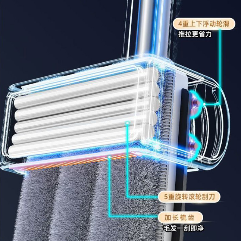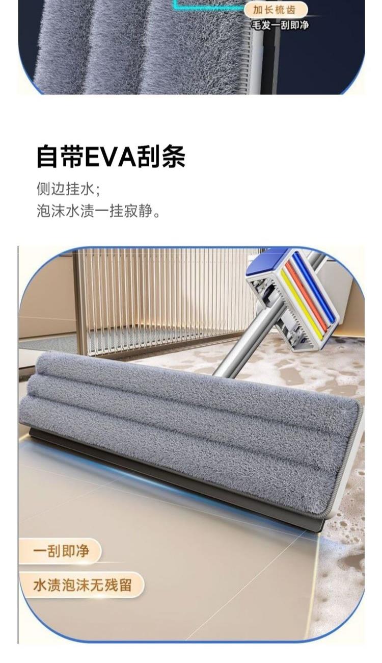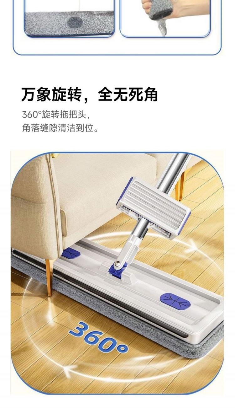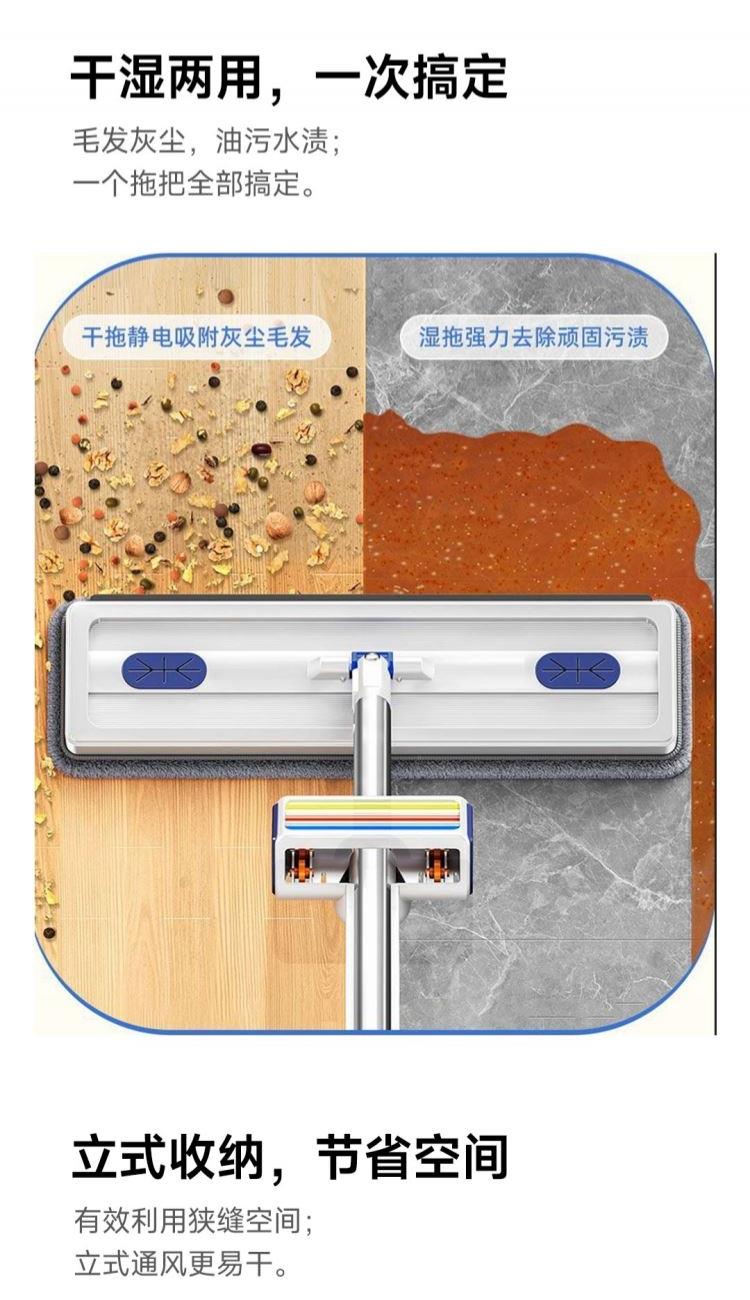 颜色:白蓝色 配置:拖把*1,布头*2 材质:PP、不锈钢、纤维棉头 产品尺寸: 42*11*137cm 包装尺寸:13*8*61.5cm 1. 42cm大拖头,清洁加倍有力; 2. 双组合刮齿+刮刀,清洁立新,过滤脏污; 3. 360°旋转头,深入清洁更灵活 4. 直立收纳,不占空间 5. 加厚不锈钢杆子,紧固耐用,不会生锈。