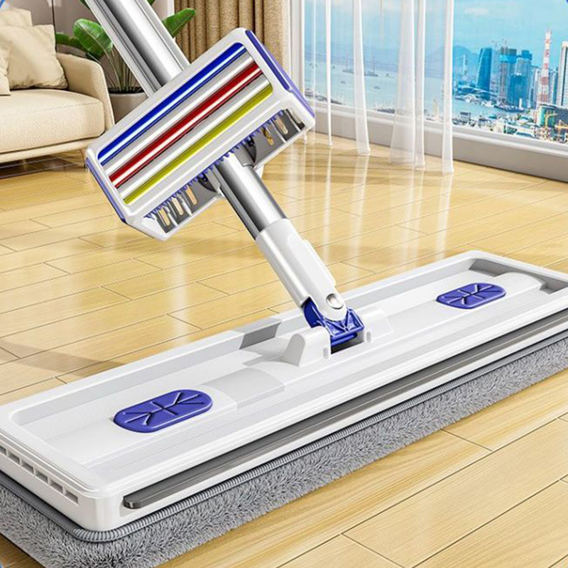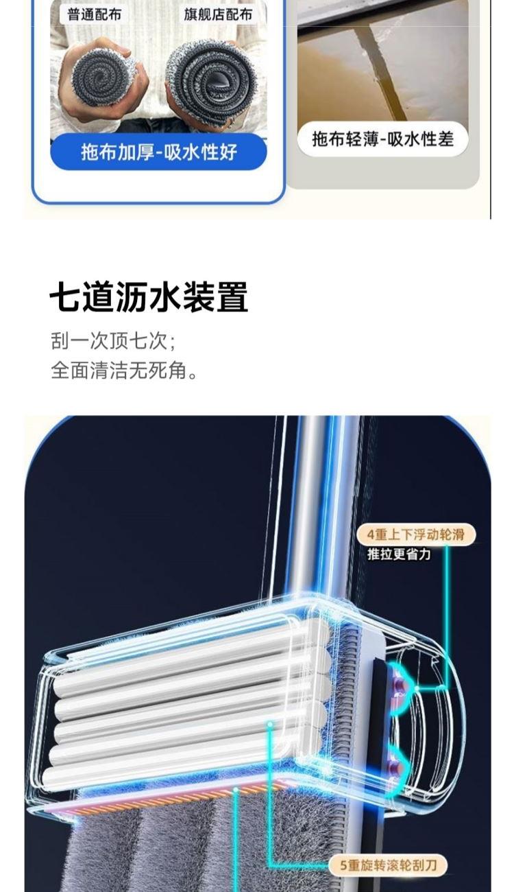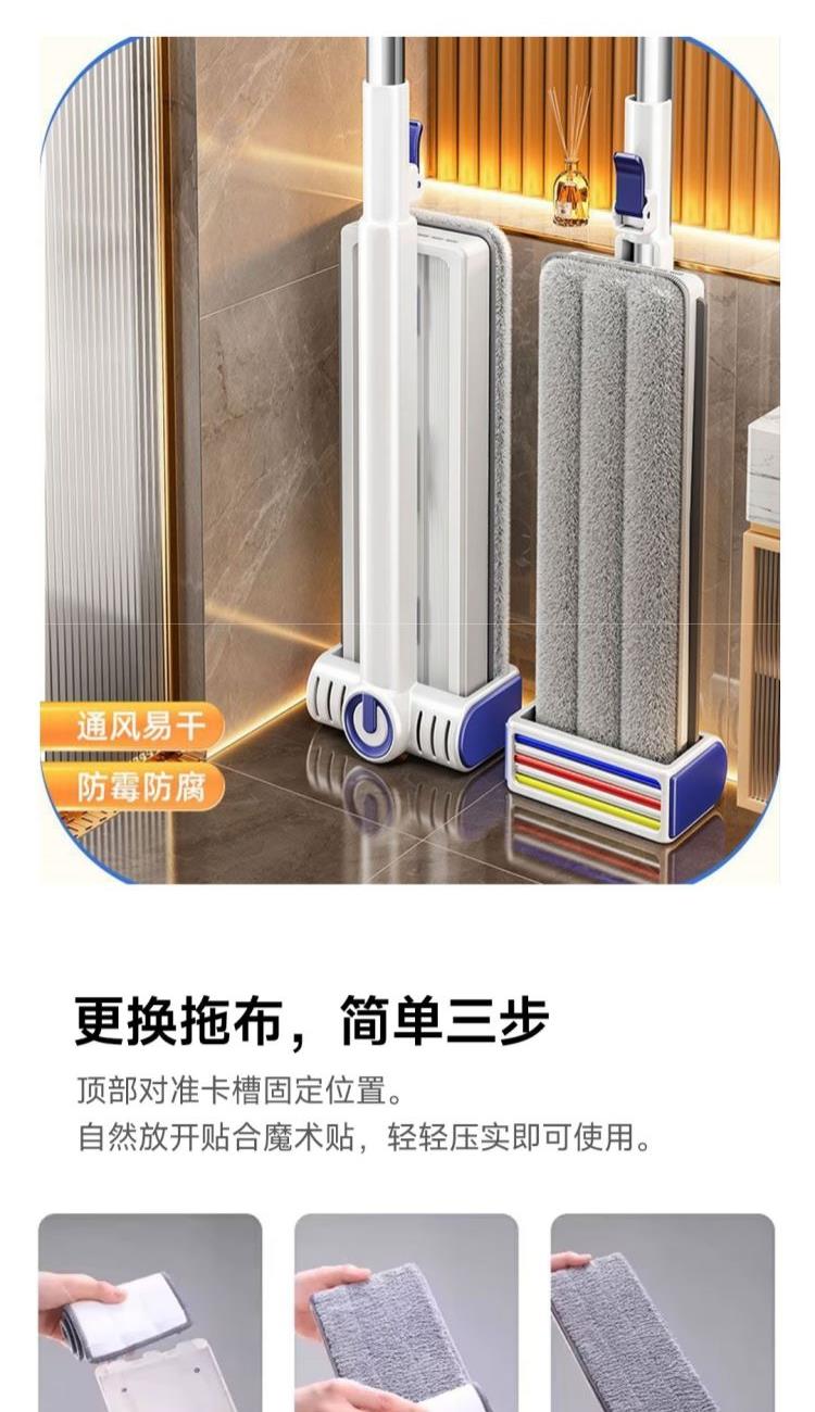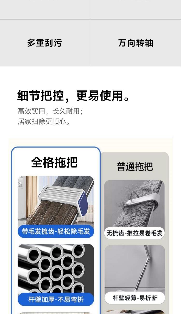 颜色:白蓝色 配置:拖把*1,布头*2 材质:PP、不锈钢、纤维棉头 产品尺寸: 42*11*137cm 包装尺寸:13*8*61.5cm 1. 42cm大拖头,清洁加倍有力; 2. 双组合刮齿+刮刀,清洁立新,过滤脏污; 3. 360°旋转头,深入清洁更灵活 4. 直立收纳,不占空间 5. 加厚不锈钢杆子,紧固耐用,不会生锈。