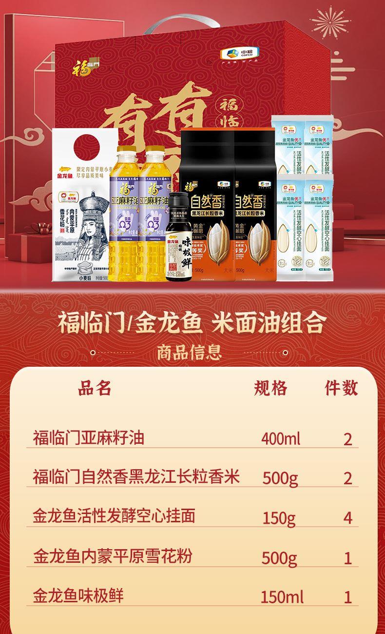 净含量:2100g+950ml 配置组合: 福临门亚麻籽油400ml*1瓶 福临门亚麻籽油400ml*1瓶 福临门自然香黑龙江长粒香米500g*1袋 福临门自然香黑龙江长粒香米500g*1袋 金龙鱼活性发酵空心挂面150g*4袋 金龙鱼内蒙平原雪花粉500g*1袋 金龙鱼味极鲜150ml*1瓶 福临门有礼有节包装盒*1个(320mm*110mm*240mm) 推荐理由: 黄金产区原料 + 匠心工艺,口感营养兼具精选东北寒地黑土大米、黄金玉米带 / 沂蒙山区原料,采用物理压榨、黄金碾磨等工艺,保留食材原生营养与本味;兼顾健康与美味。 内含大米、食用油、调味品等家庭日常必备品,拒绝闲置浪费;简约大气礼盒包装,适配企业福利、商务馈赠等场景,性价比高 + 实用性强,员工满意、采购省心。