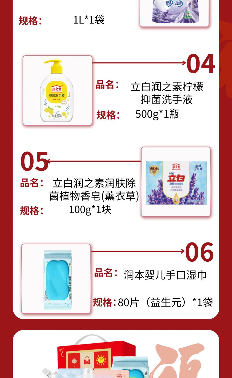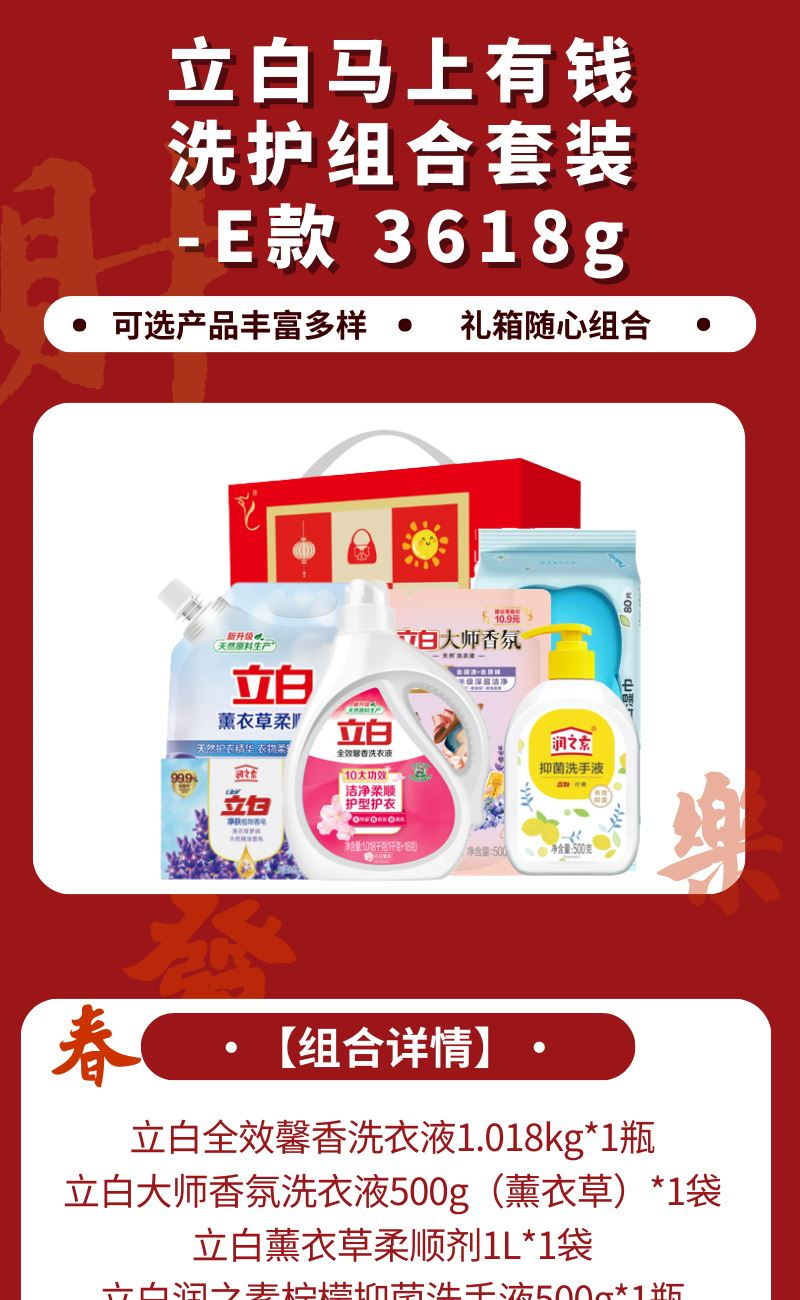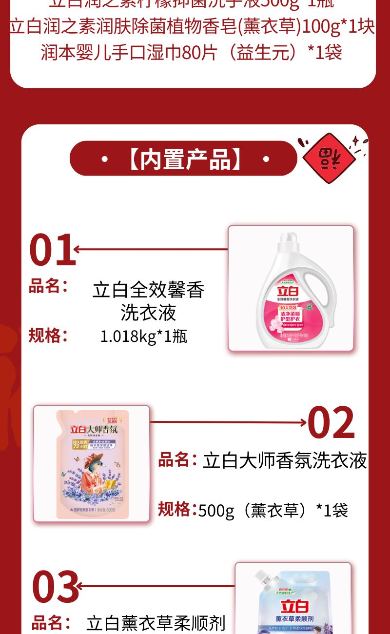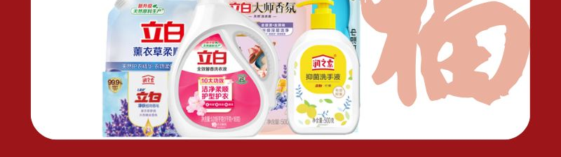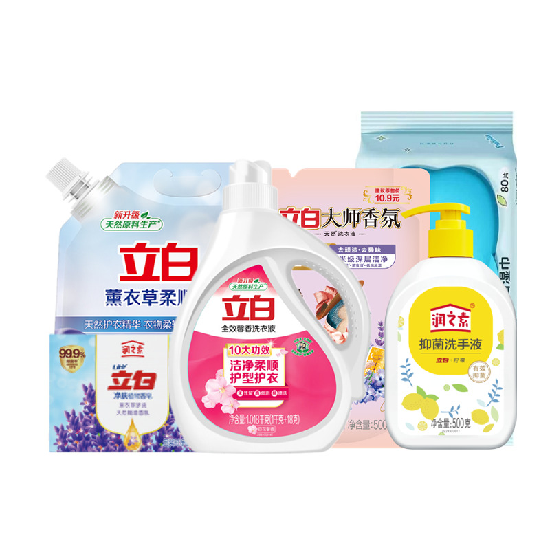 配置: 立白全效馨香洗衣液1.018kg*1瓶 立白大师香氛洗衣液500g(薰衣草)*1袋 立白薰衣草柔顺剂1L*1袋 立白润之素柠檬抑 菌洗手液500g*1瓶 立白润之素润肤除 菌植物香皂(薰衣草)100g*1块 润本婴儿手口湿巾80片(益生元)*1袋 卖点: 可选产品丰富多样,礼箱随心组合,多种价位因需而定,充分满足各种送礼需求,是商务送礼、单位福利的用心之选。