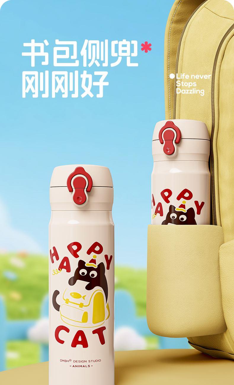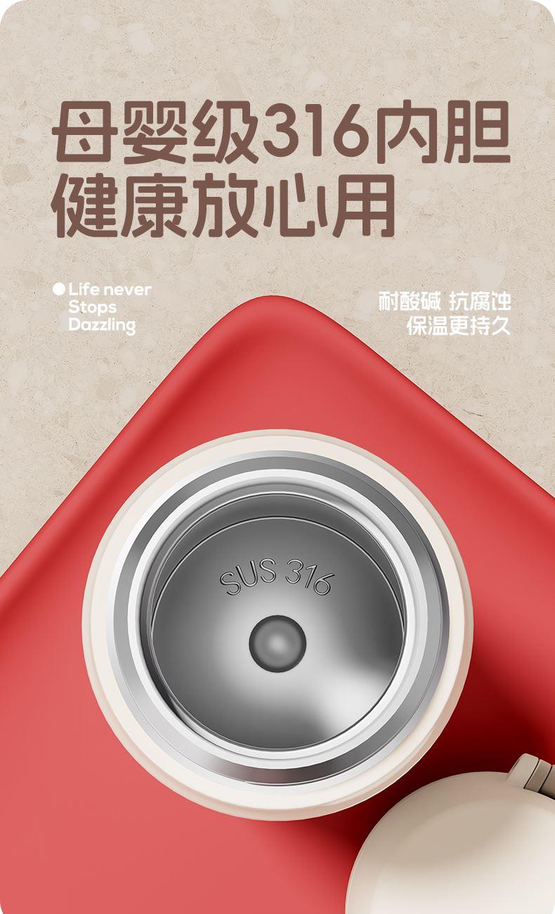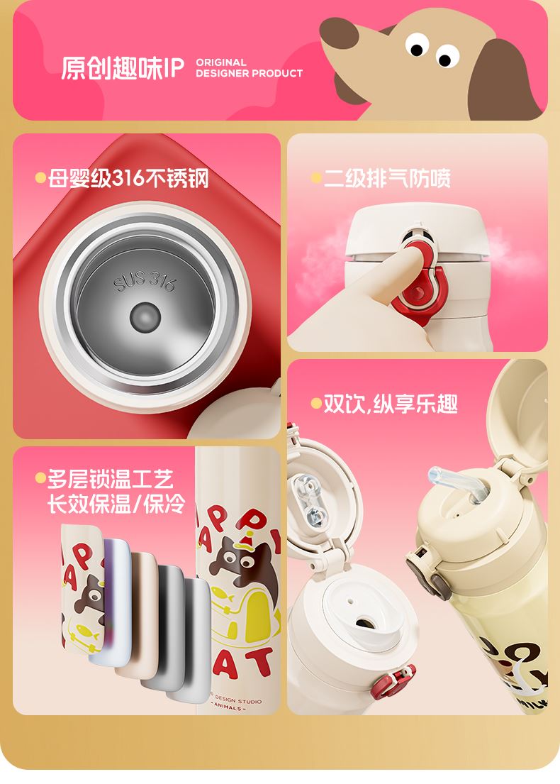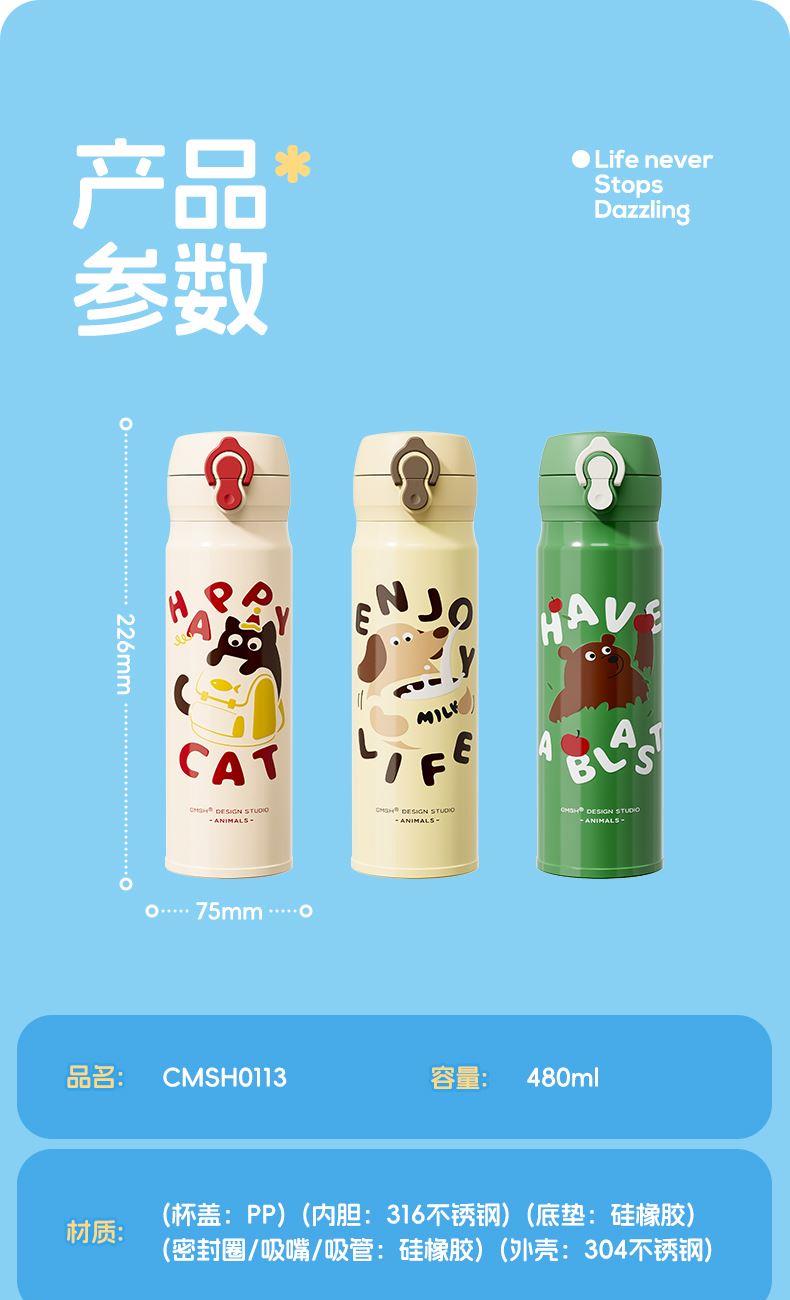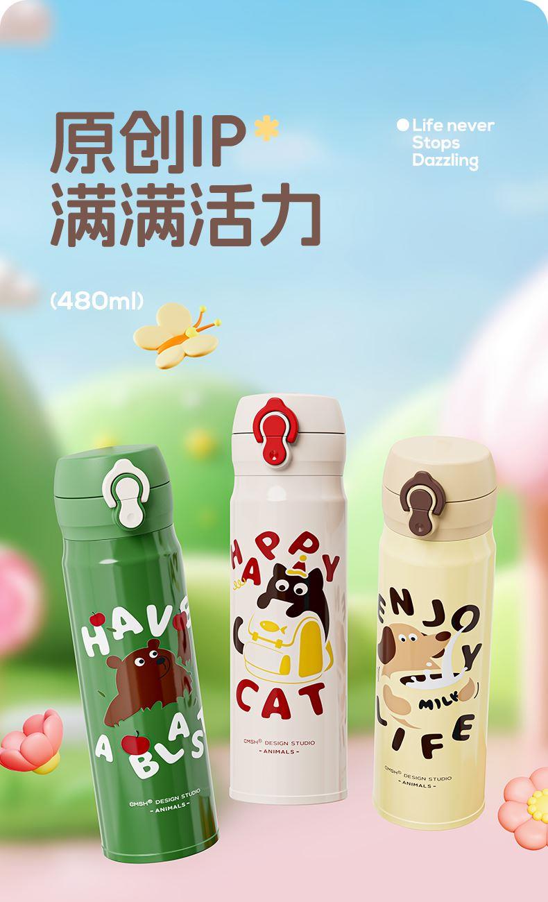 产品条码:6922958201138 内胆材质:316不锈钢 外壳材质:304不锈钢 杯盖材质:PP 密封圈材质:硅胶 产品容量:480ml 产品尺寸:67*75*226mm 产品净重:255g 产品颜色:米色,黄色,绿色 装 箱 数:48pcs 包装方式:独立彩盒包装 箱 重 量:15kg 产品特点: 原创涂鸦艺术 生动有趣 一键弹盖双饮 防喷溅设计 316钢材内胆 耐腐蚀更健康 纤细杯身 插包轻松无压力