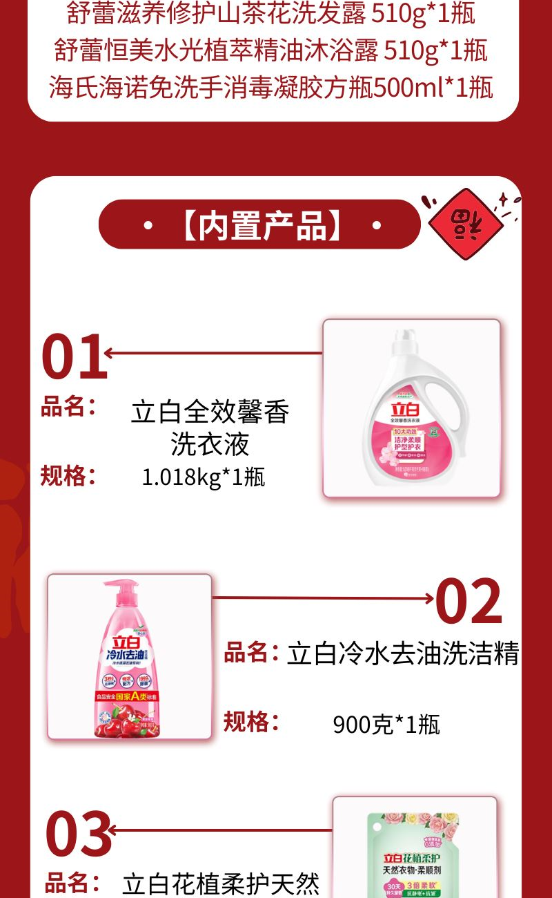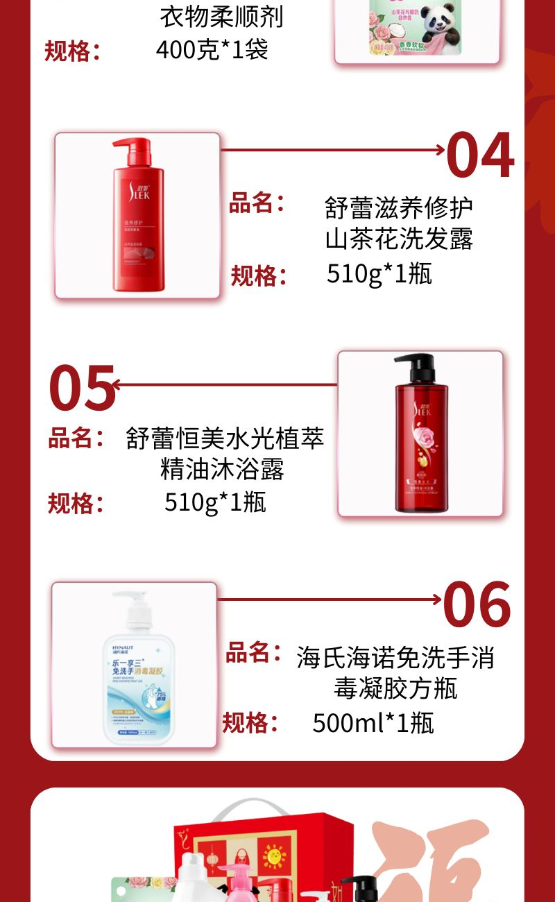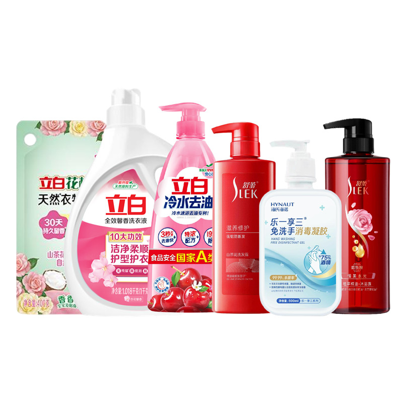配置: 立白全效馨香洗衣液1.018kg*1瓶 立白冷水去油洗洁精900克*1瓶 立白花植柔护天然衣物柔顺剂400克*1袋 舒蕾滋养修护山茶花洗发露 510g*1瓶 舒蕾恒美水光植萃精油沐浴露 510g*1瓶 海氏海诺免洗手消毒凝胶方瓶500ml*1瓶 卖点: 可选产品丰富多样,礼箱随心组合,多种价位因需而定,充分满足各种送礼需求,是商务送礼、单位福利的用心之选。