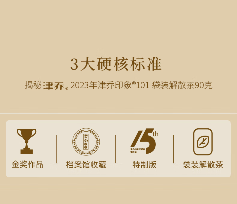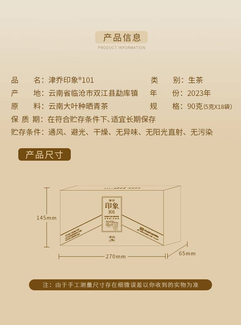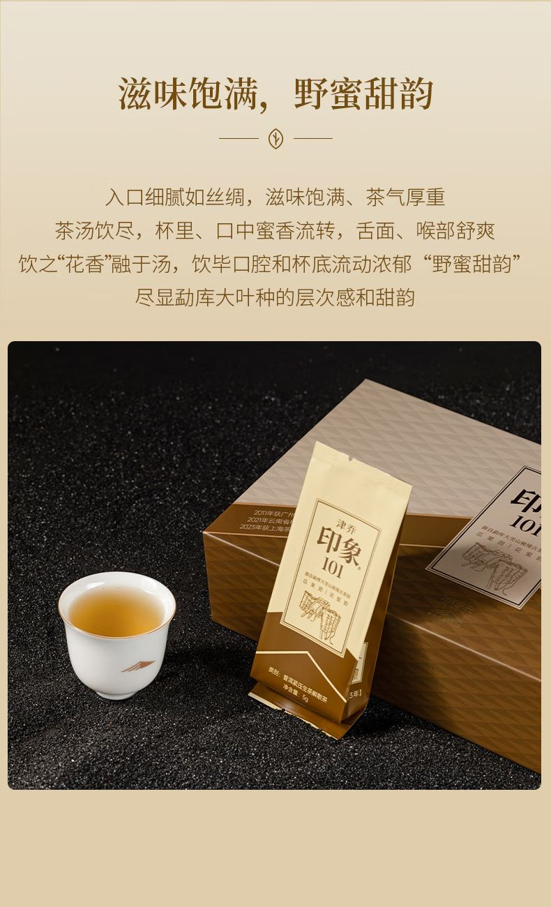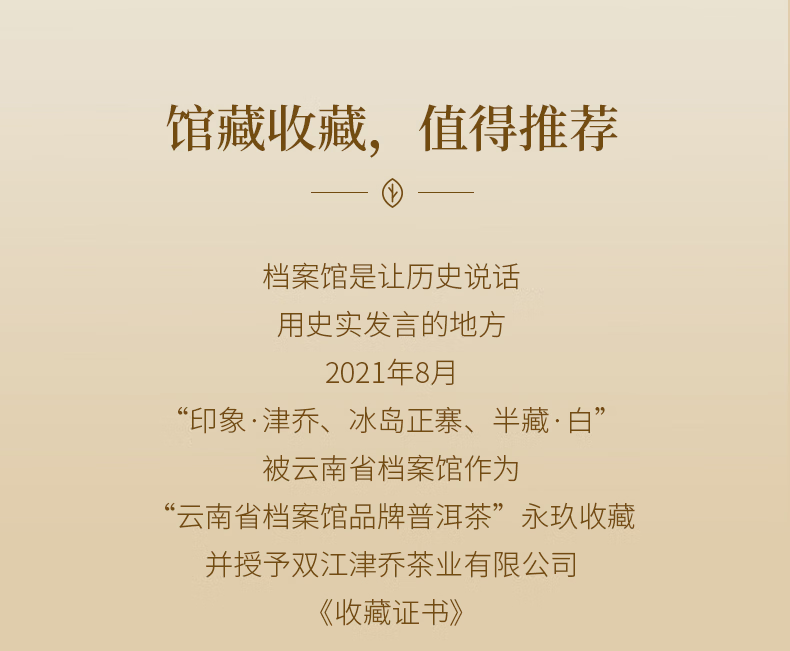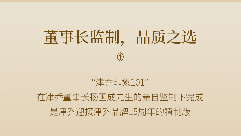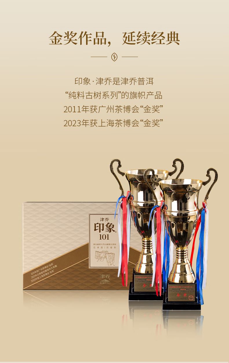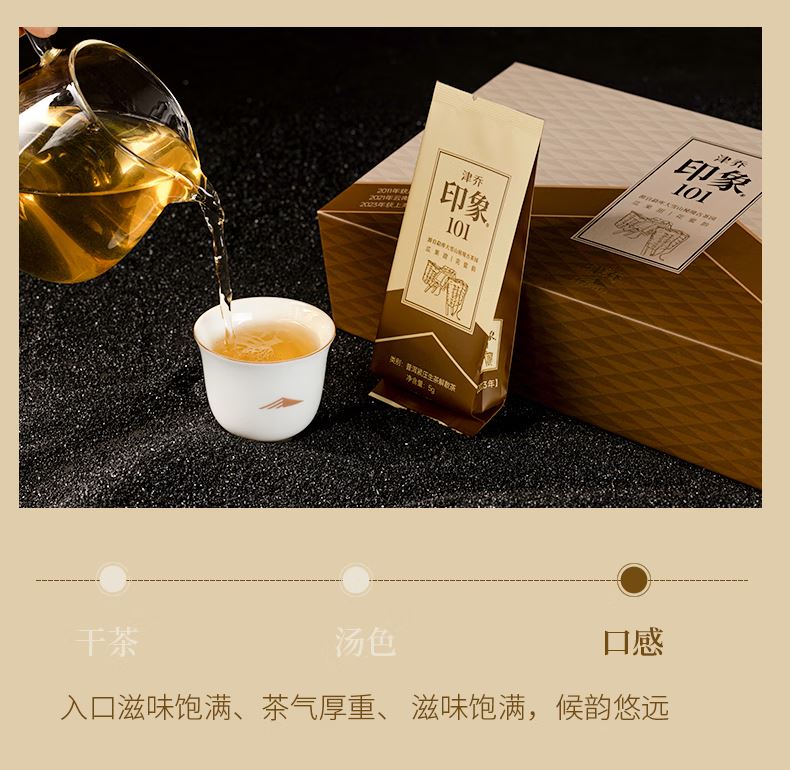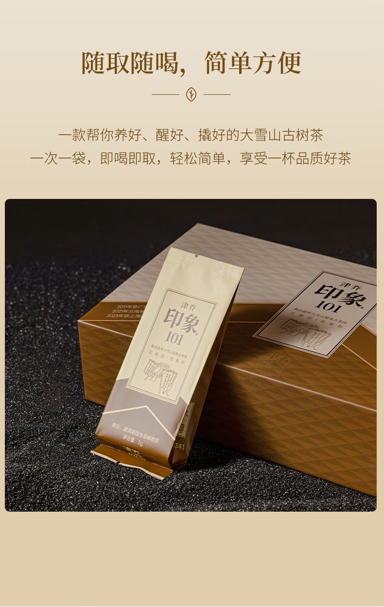 “津乔印象101”在津乔董事长杨国成先生的亲自监制下完成。是津乔迎接津乔15周年的特制版。一款帮你养好、醒好、撬好的大雪山古树茶一次一袋,即喝即取,轻松简单,享受一杯品质好茶。2021年8月“印象·津乔、冰岛正寨、半藏·白”被云南省档案馆作为云南省档案馆品 牌普洱茶”永玖收藏并授予双江津乔茶业有限公司《收藏证书》 品类:调味茶 规格:90g/盒 年份:2024年 产区:云南省临沧市双江县勐库镇保质期:在符合贮存条件下,本品适宜长期存放