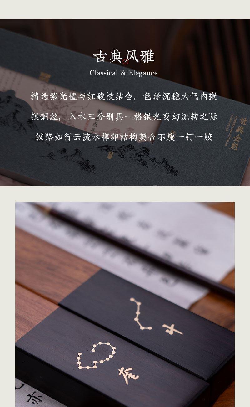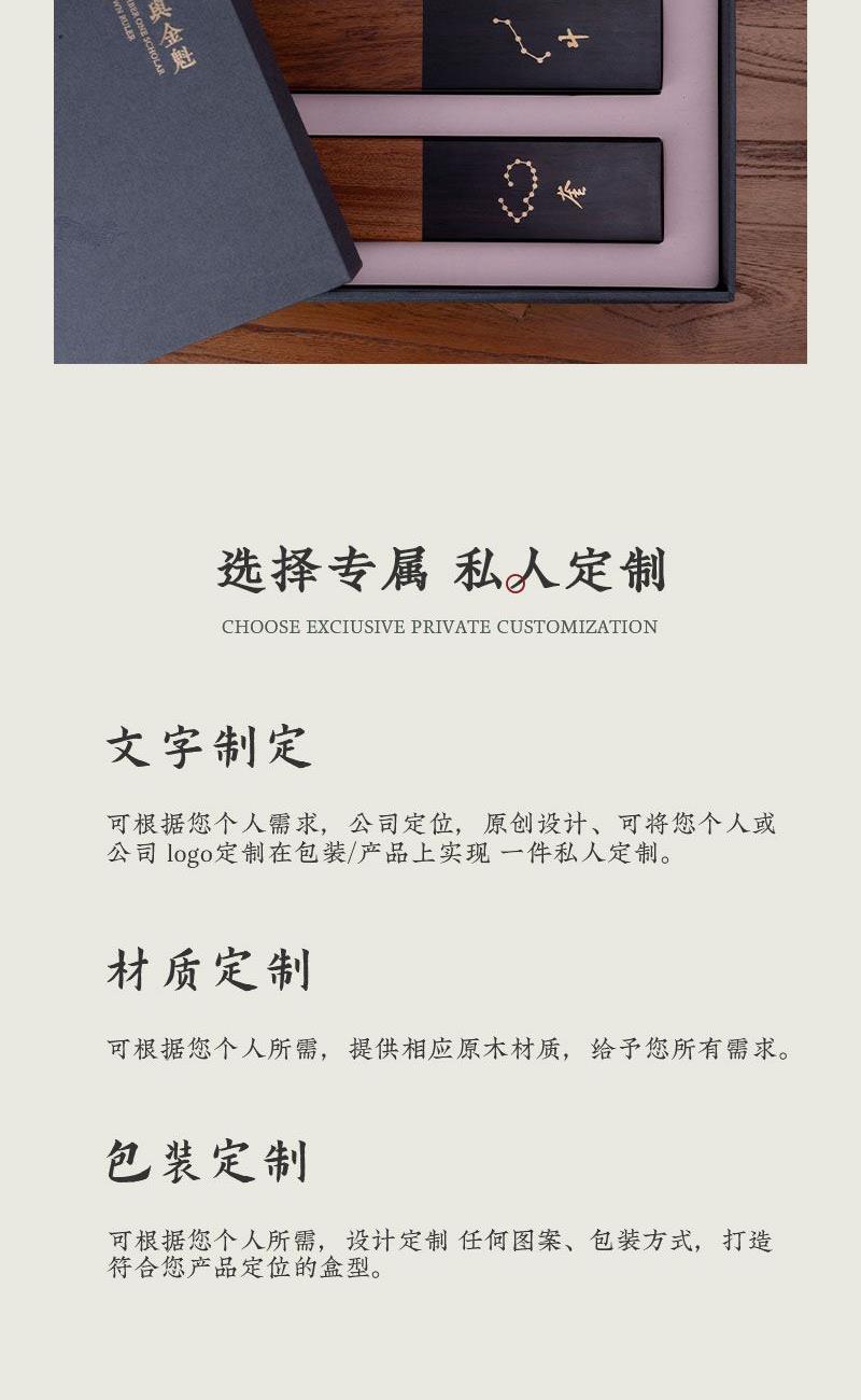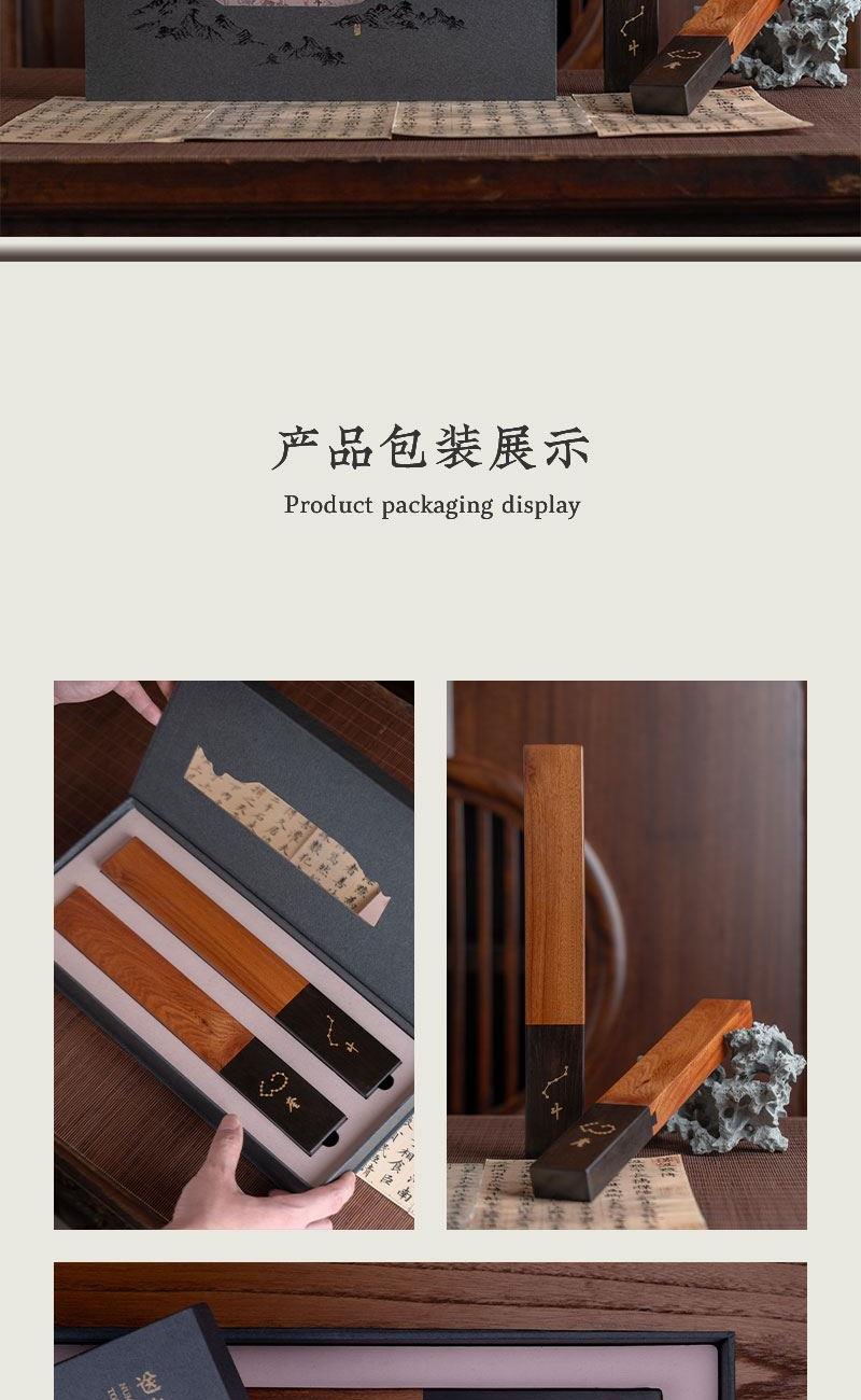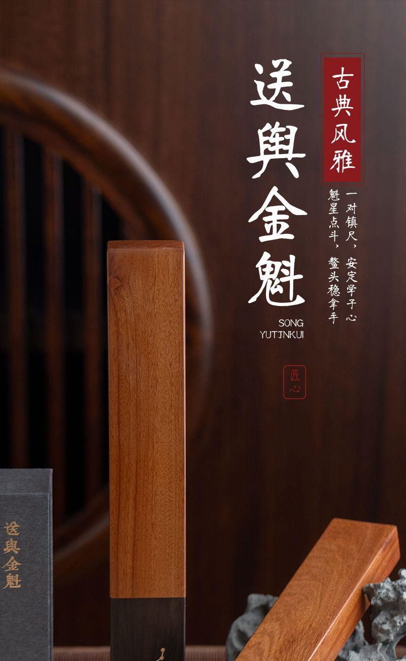 产品材质:红酸枝木/紫光檀木/黄铜镶嵌 礼盒规格:35.5*14.5*4 cm 礼盒重量:1.2kg 礼盒标配:红酸枝木镇纸、紫光檀木镇纸、礼盒、礼袋 送礼场景:长辈礼、商务礼、文房四宝 定制位:镇尺本体、礼袋、腰封 送礼寓意:一对镇尺,安定学子心;魁星点斗,鳌头稳拿手