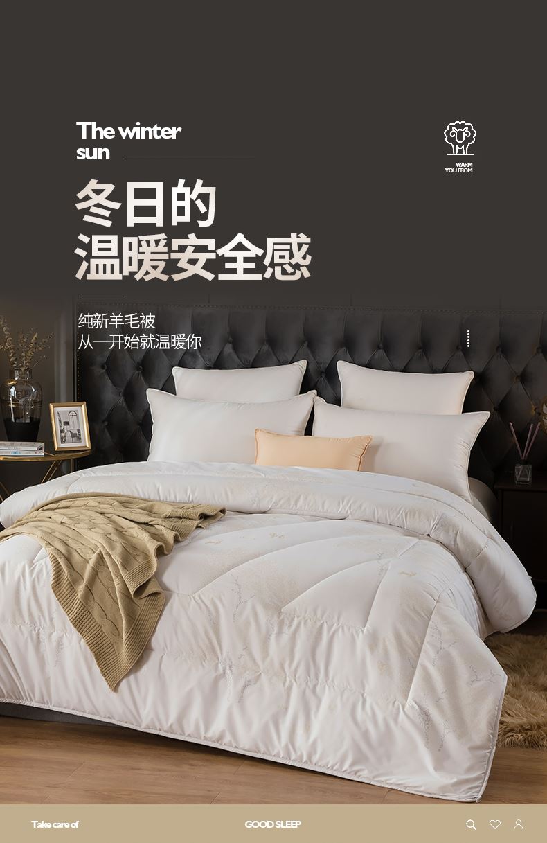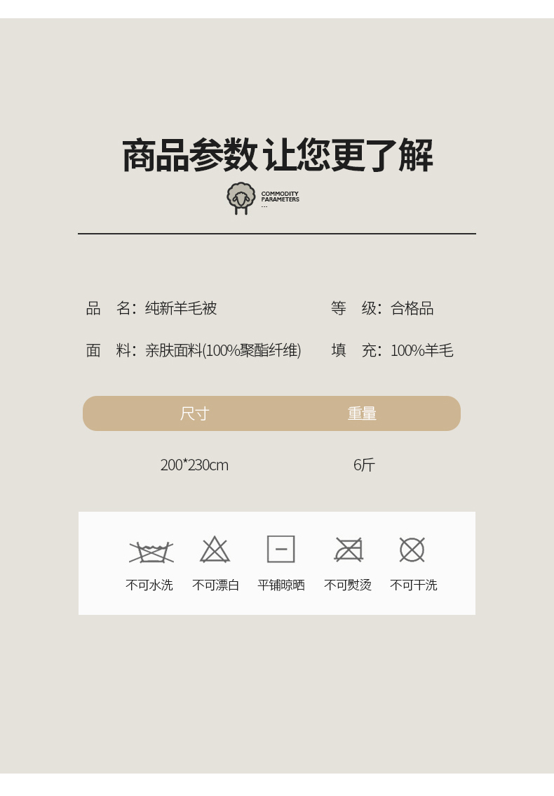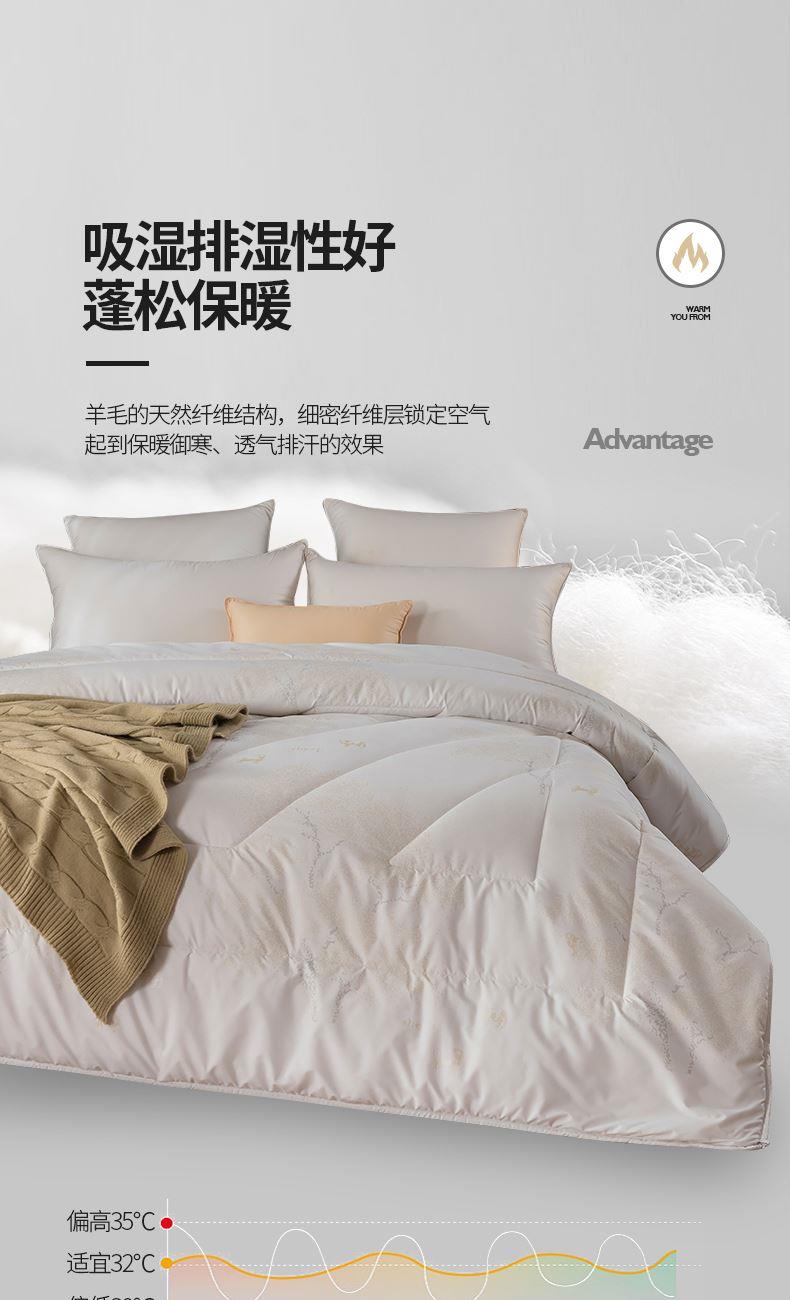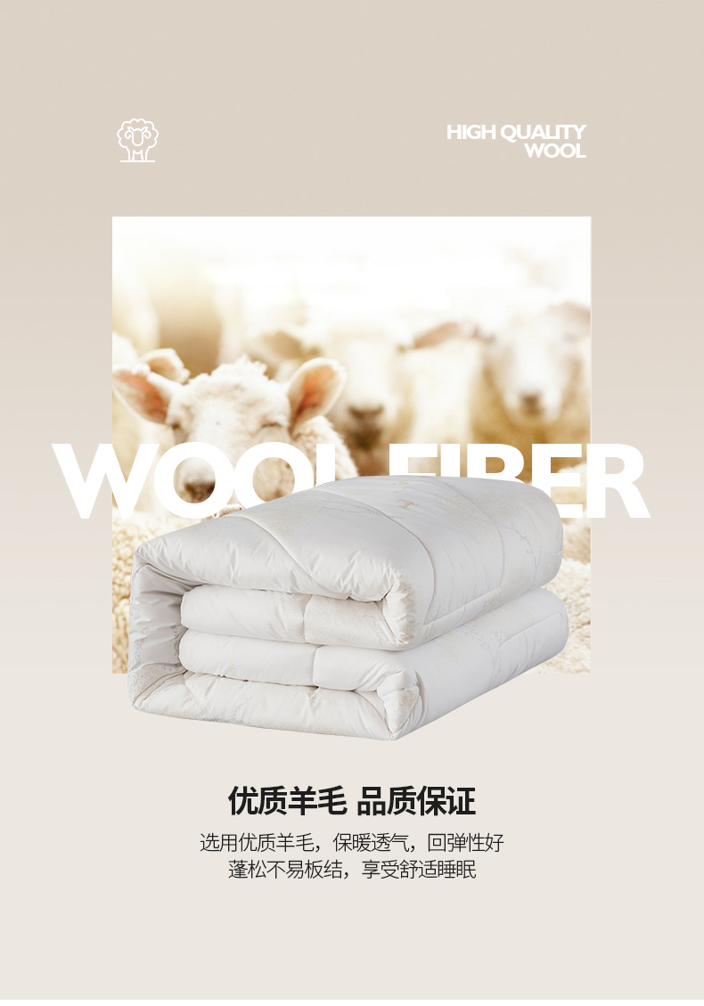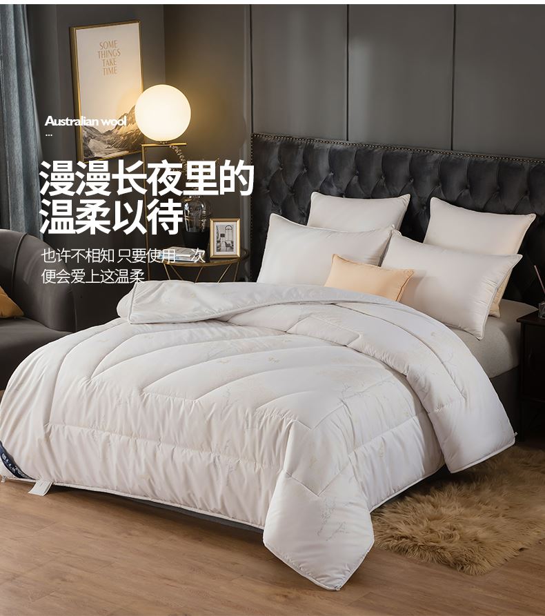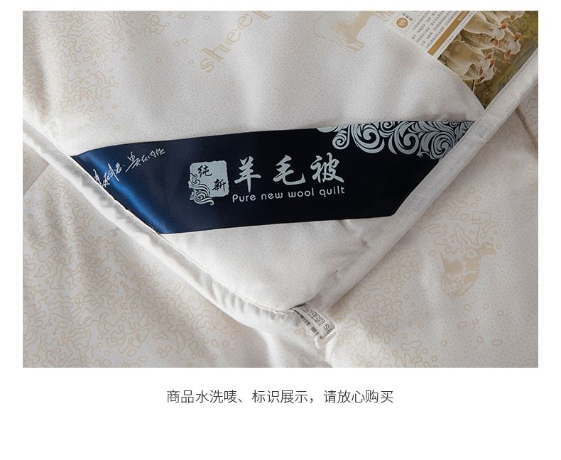 面料:高密防羽布 填充:羊毛 规格:200cm*230cm 填充克重:2000g 总重量:3000g 包装:精美软包 羊毛被优选品质均匀,柔软性佳,有弹性强度高的羊毛材料,而且有很好的可弹性。羊毛自身的卷曲性使被子蓬松透气同时能够很好的锁住温度,使热量均衡不流失,保持温暖,整晚舒适。