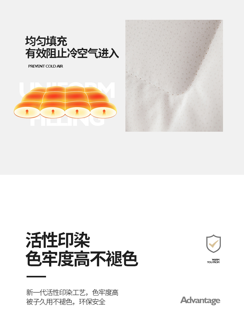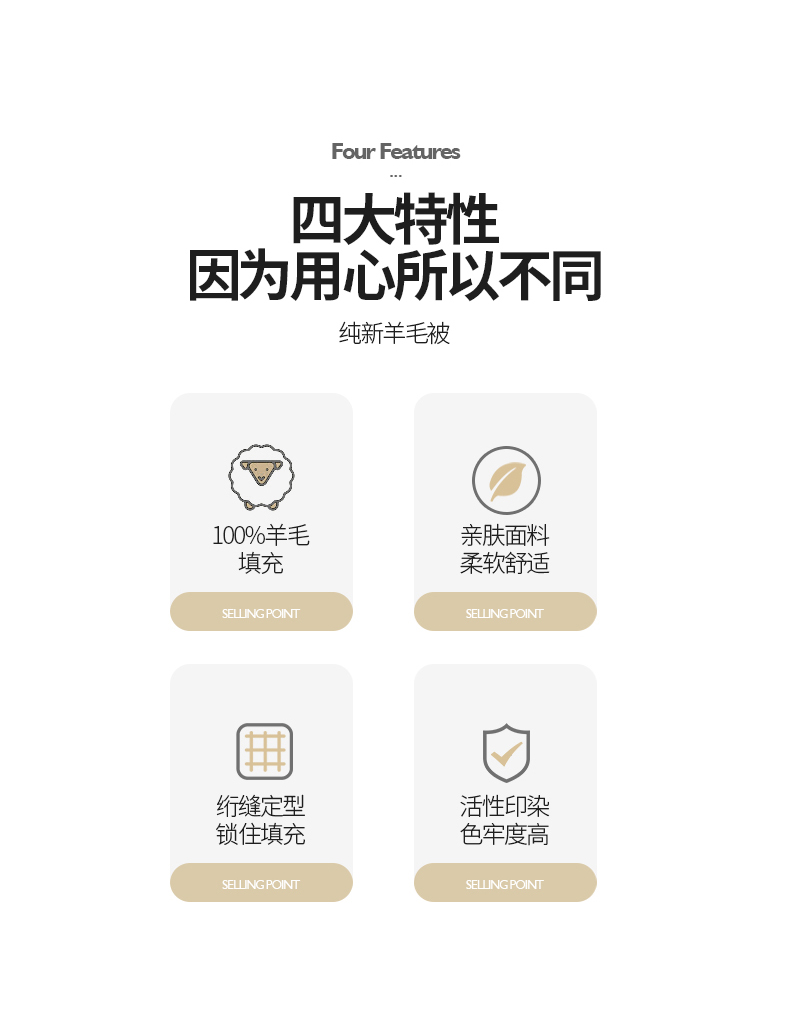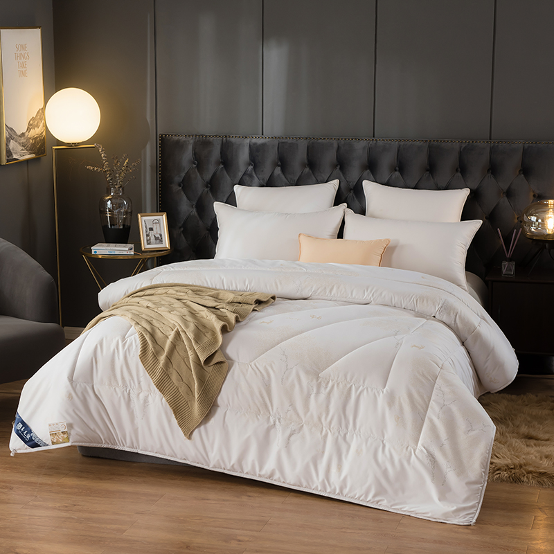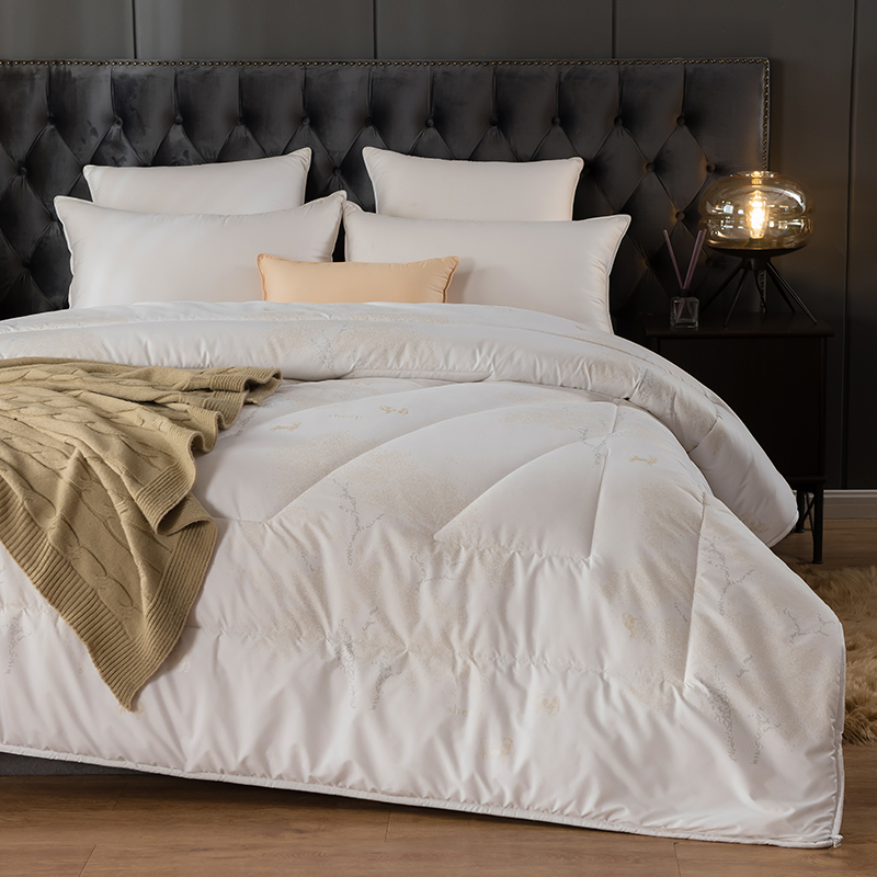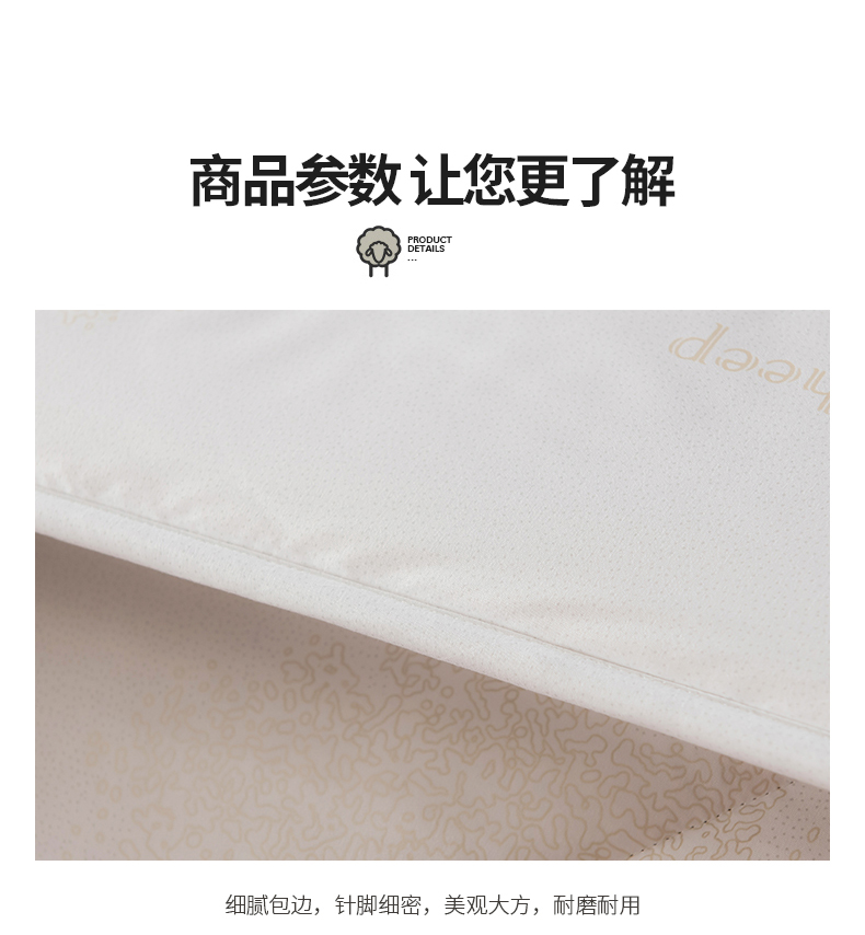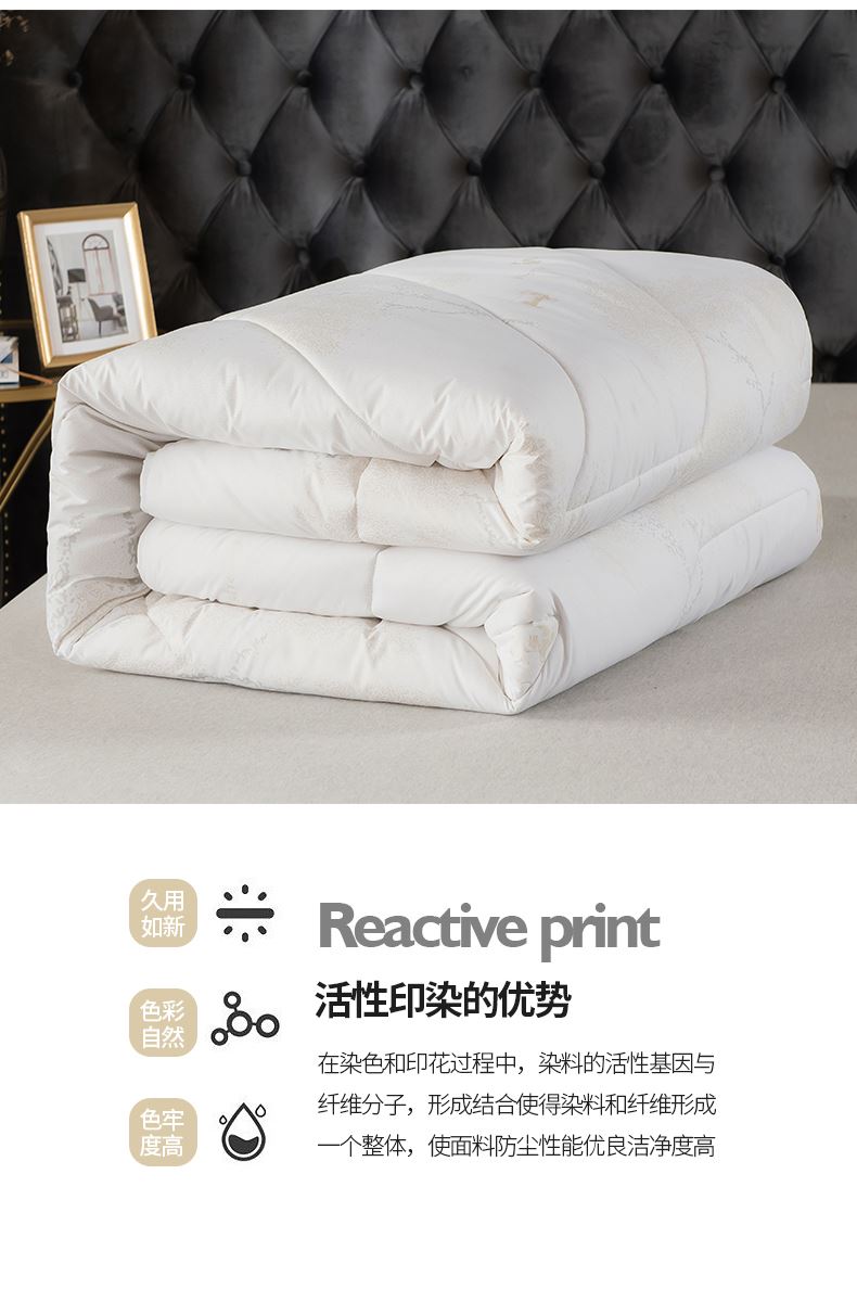面料:高密防羽布 填充:羊毛 规格:200cm*230cm 填充克重:2000g 总重量:3000g 包装:精美软包 羊毛被优选品质均匀,柔软性佳,有弹性强度高的羊毛材料,而且有很好的可弹性。羊毛自身的卷曲性使被子蓬松透气同时能够很好的锁住温度,使热量均衡不流失,保持温暖,整晚舒适。