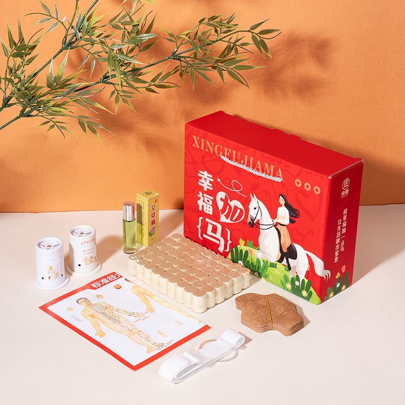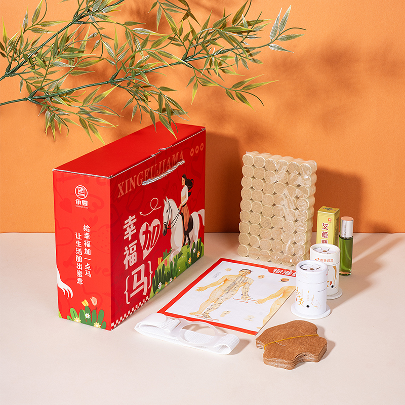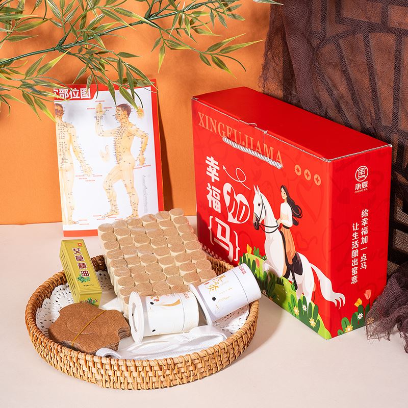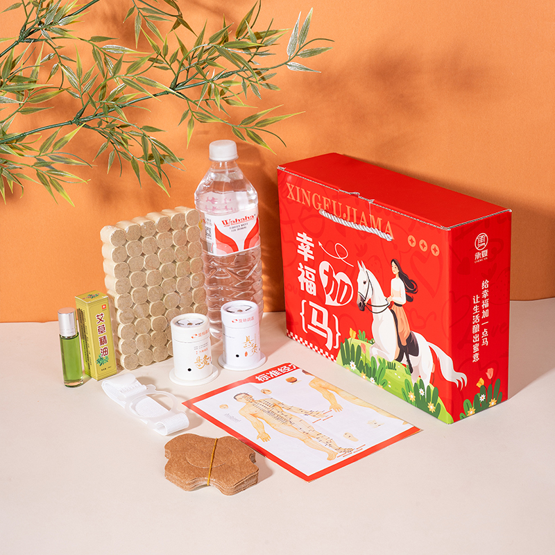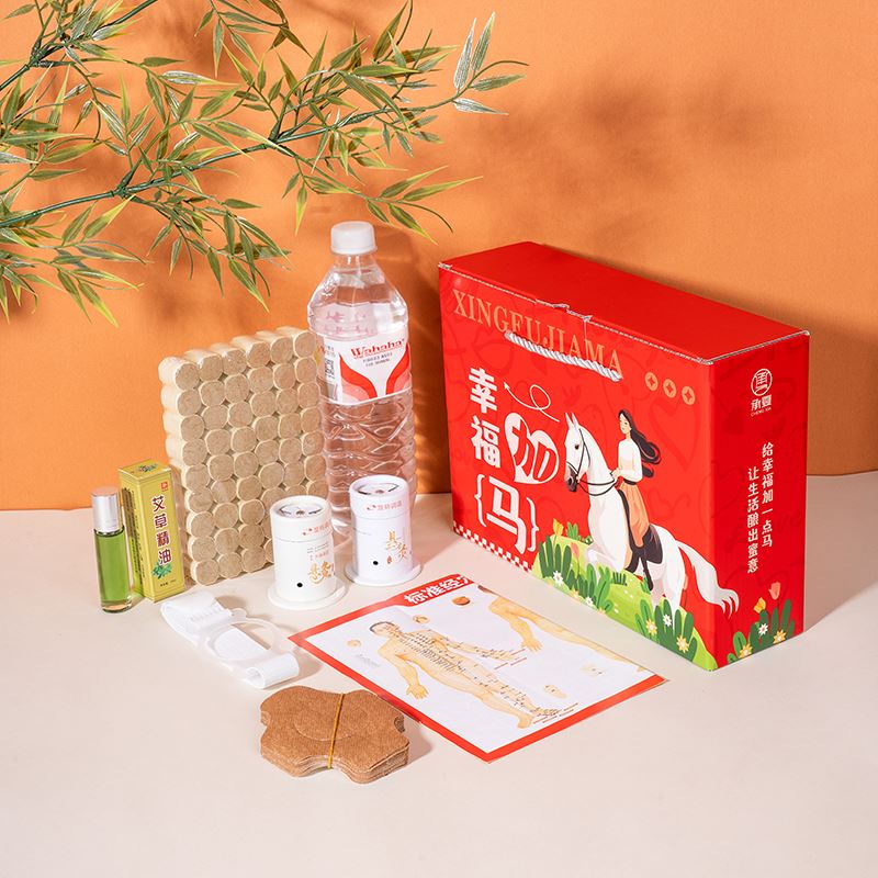 礼盒规格:270*80*200mm 产品配置:人体穴位图*1 艾草精油10ml*1 艾柱54粒*1 悬灸仪*2 悬灸胶贴*20 固定绑带*1 幸福加马彩盒*1个 推荐理由: 1、主题“幸福加马”,谐音幸福加码,送给客户加倍的幸福,马年马元素,为开门红、新年助力。 2、何以解忧,唯有艾灸,艾灸养生获得当下各个年龄段客户的认可,艾灸套装深受客户喜爱。 3、滚珠款艾草精油,灸前滚一滚,灸效加倍。 4、取出悬灸仪,用悬灸胶贴、绑带固定,放入黄金艾柱点燃,居家即可享受自己的艾灸养生时刻。 5、特别搭配穴位图,针对性艾灸穴位效果更佳。