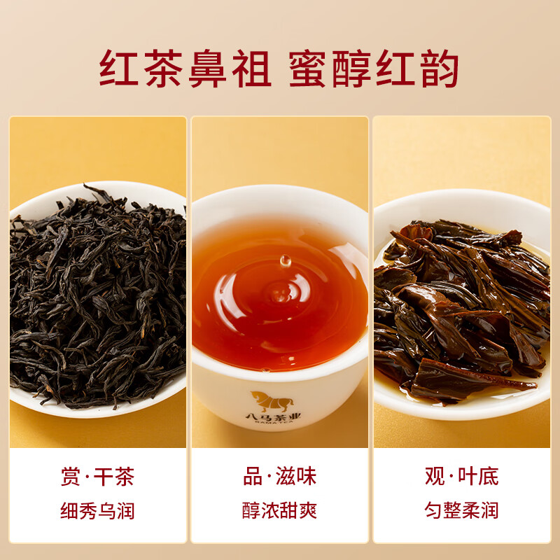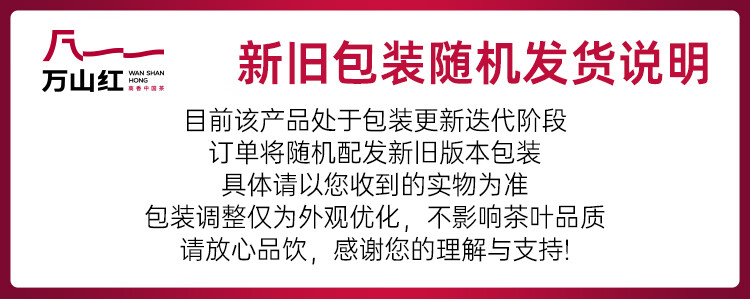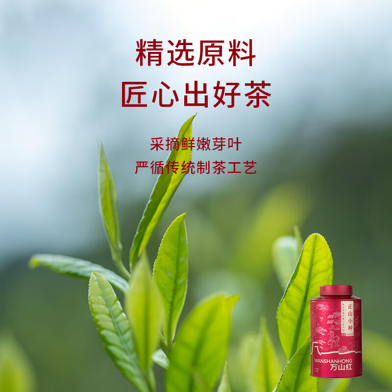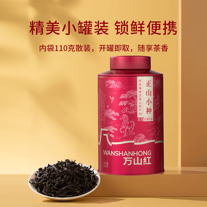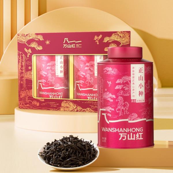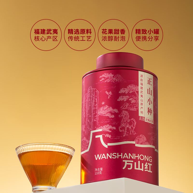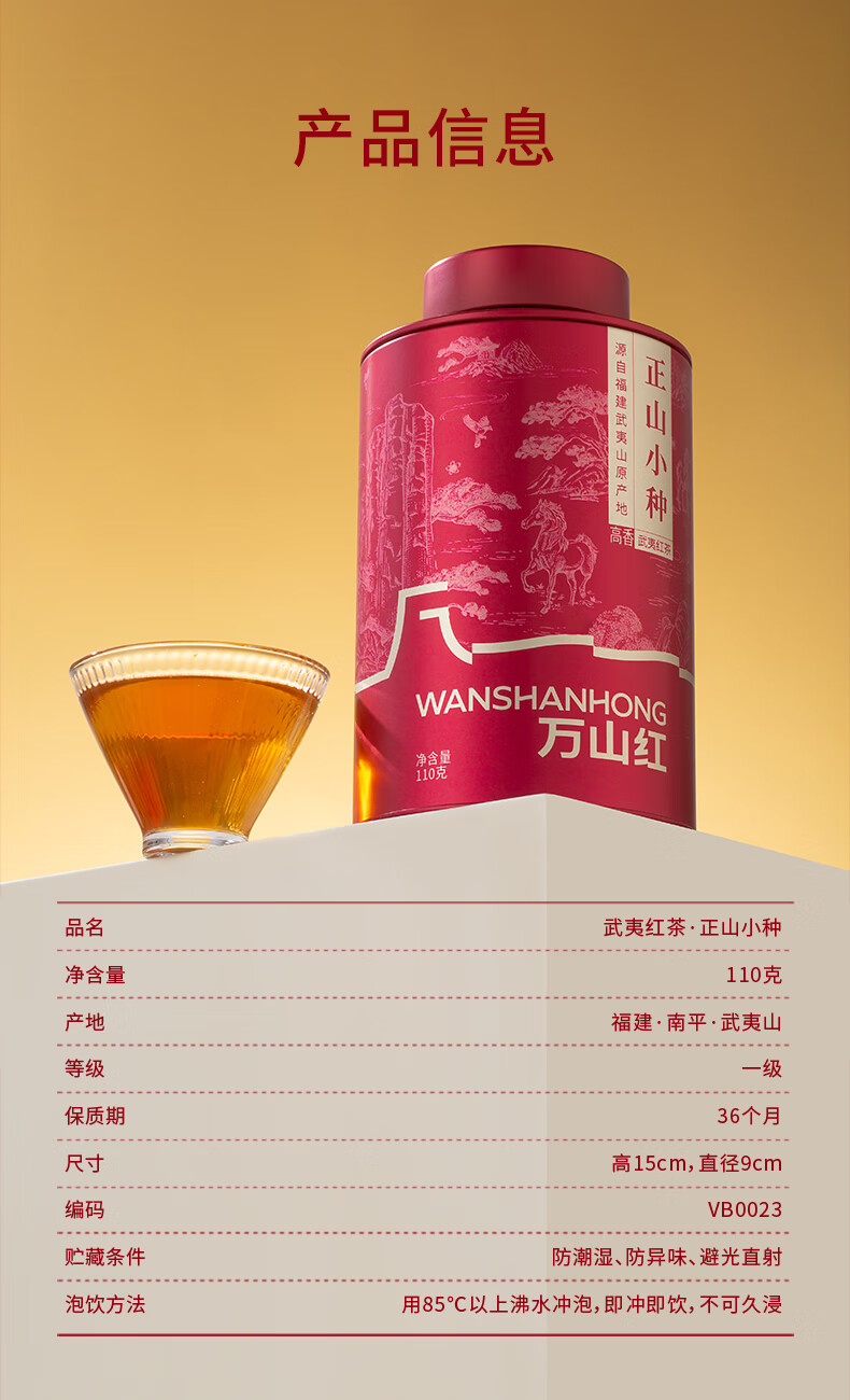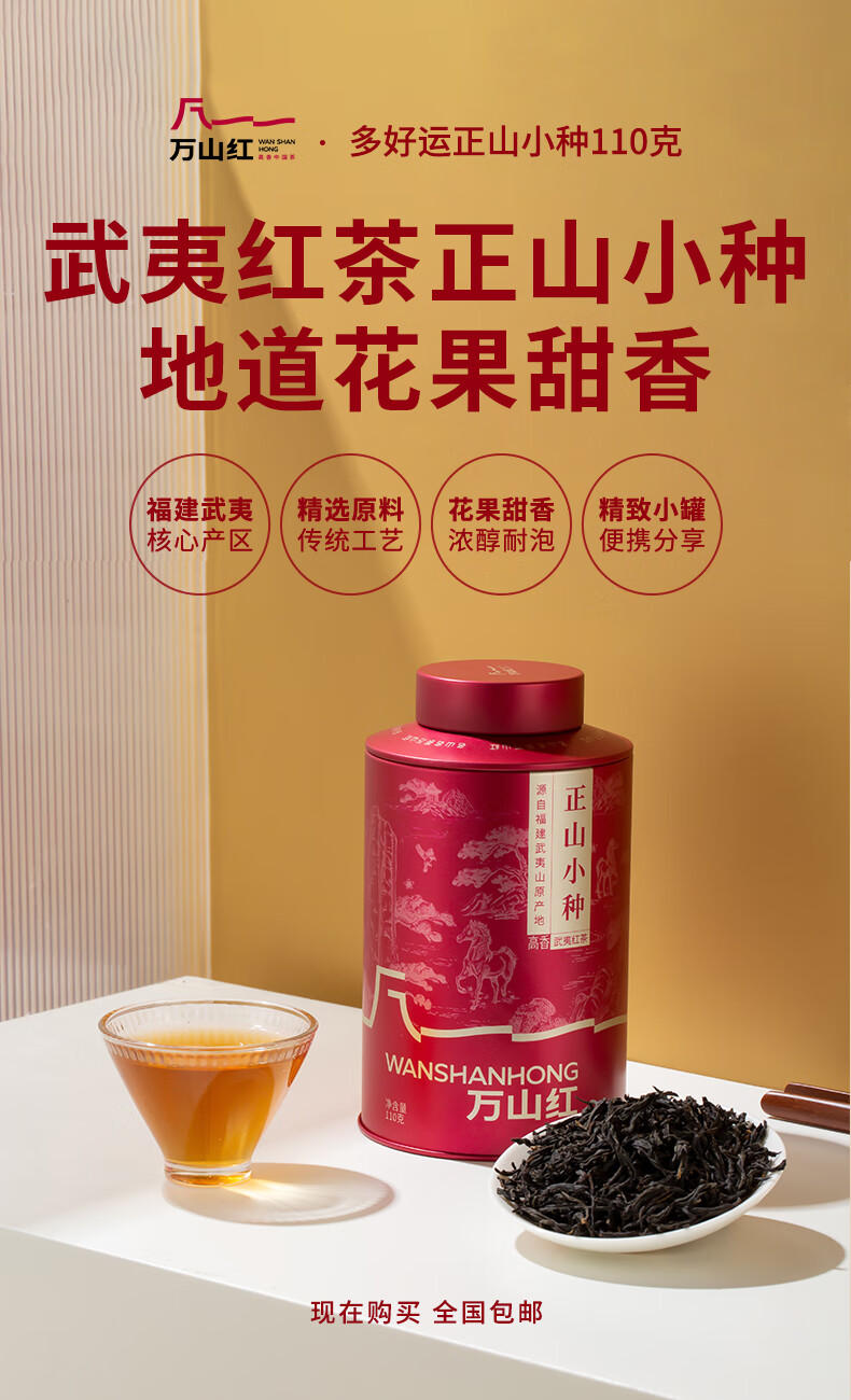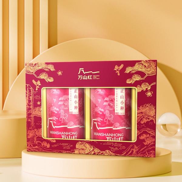 净含量:240克 组合方式: 一级武夷红茶正山小种110克*2罐 产品卖点: 1. 礼盒包装卖点 国风质感设计:红金撞色搭配山水、飞鸟等国风纹样,视觉喜庆且格调雅致,既符合传统审美,又显精致档次; 规整礼盒配置:双罐组1. 礼盒包装卖点 2. 场景适配卖点 全场景礼赠适配:无论节日(春节 / 中秋)、商务往来还是亲友馈赠,既满足 “送好茶” 的品质需求,也契合不同场景的仪式感。 3. 情感附加卖点 美好寓意加持:“万山红” 命名自带 “红火、大气” 的祝福属性,礼赠时能传递更饱满的心意。