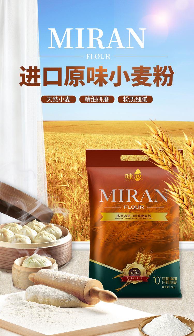 产 品 :咪然多用途进口原味小麦粉5kg 执行标准 : GB/T 1355 保 质 期 :9个月 产 地 :河南焦作 箱 规 :5*5kg