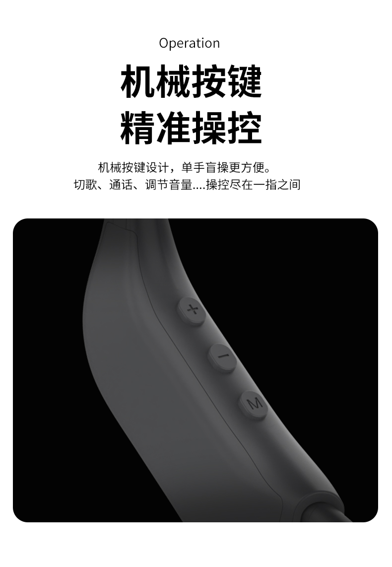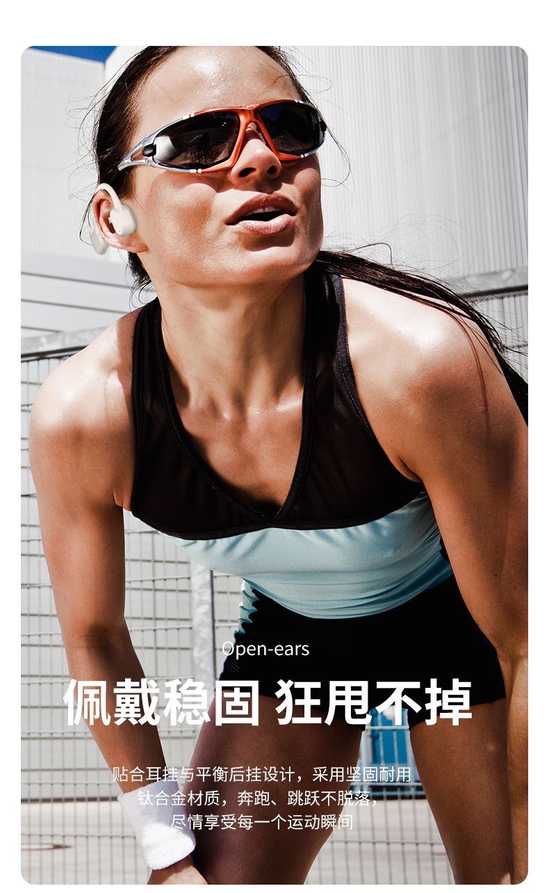 蓝牙版本:5.4 蓝牙连接距离:10m 喇叭类型:骨传导扬声器 续航时间:10小时 防护性能:IP66 产品重量:32g 电池:聚合物锂电池 待机时间:30天 充电时间:≤2.5h 充电电压:5V 1、舒适清爽更畅快,开放式久戴不累。 2、IPX6级防水,采用全封闭式设计,防水防尘。 3、AI黑科技隐秘清晰通话,杜绝漏音。 4、机械按键设计,单手盲操更方便。 5、720小时超长待机,续航全新升级。 6、可同时连接两台蓝牙设备,双设备随身切换,畅快稳连接。
