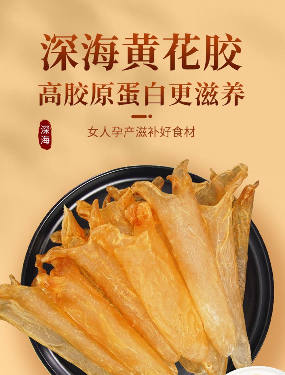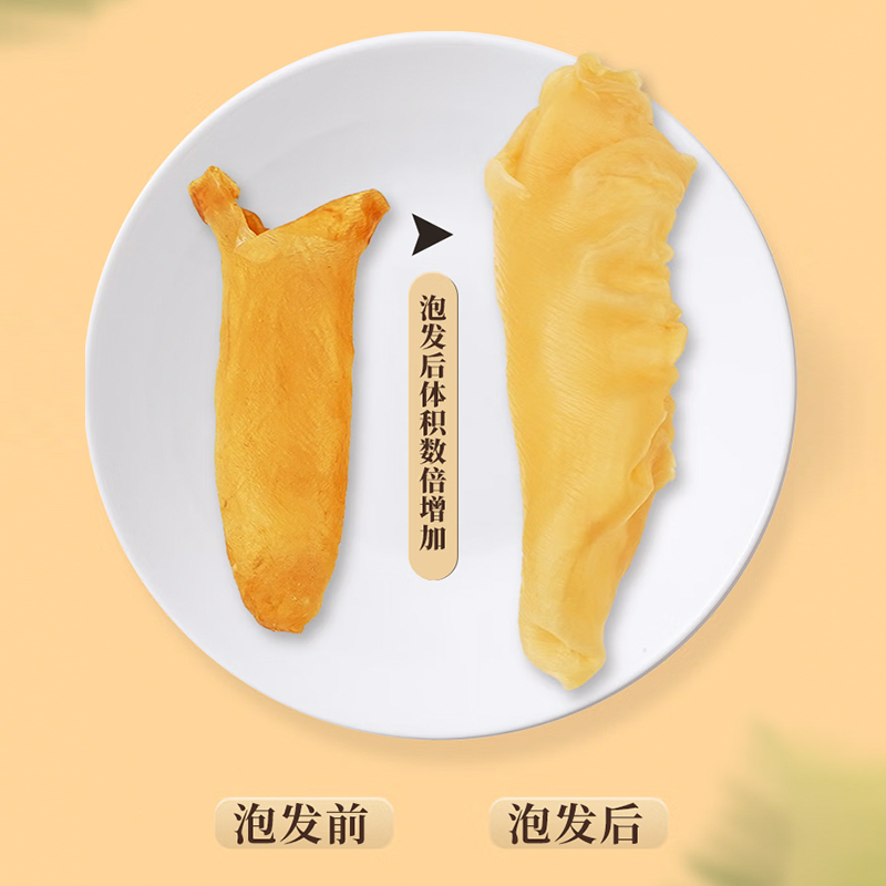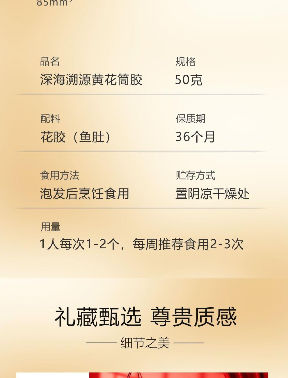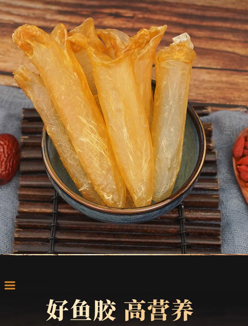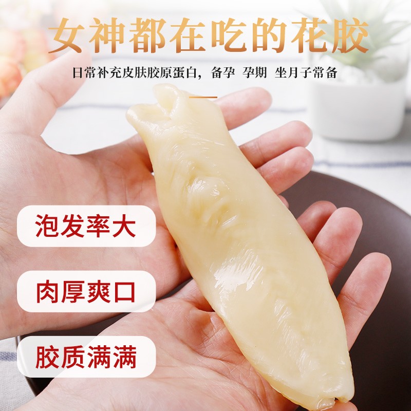 规格:50克(8-12头) 卖点: 营养价值高:黄花筒胶是花胶的一种,富含胶原蛋白,这种成分对皮肤有很好的滋养作用,能够增加皮肤的弹性,减少皱纹,起到美容养颜的功效。同时,还含有多种维生素和矿物质,有助于补充人体所需的营养元素。 - 口感鲜美:在烹饪后,黄花筒胶具有软滑、Q弹的口感 - 烹饪多样性:可以用于多种烹饪方式,比如制作花胶鸡汤、花胶排骨汤等滋补汤品。