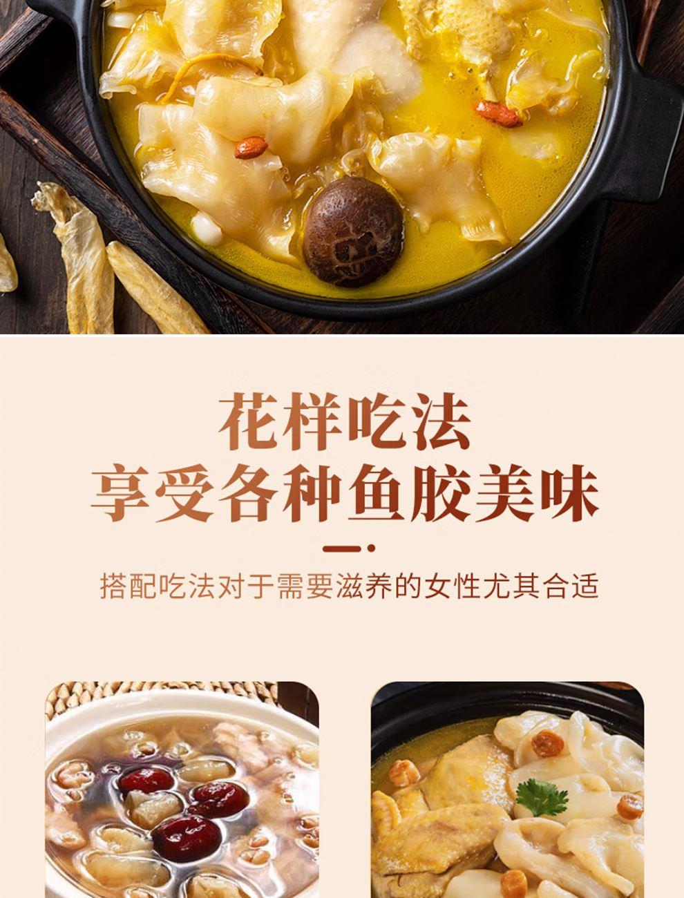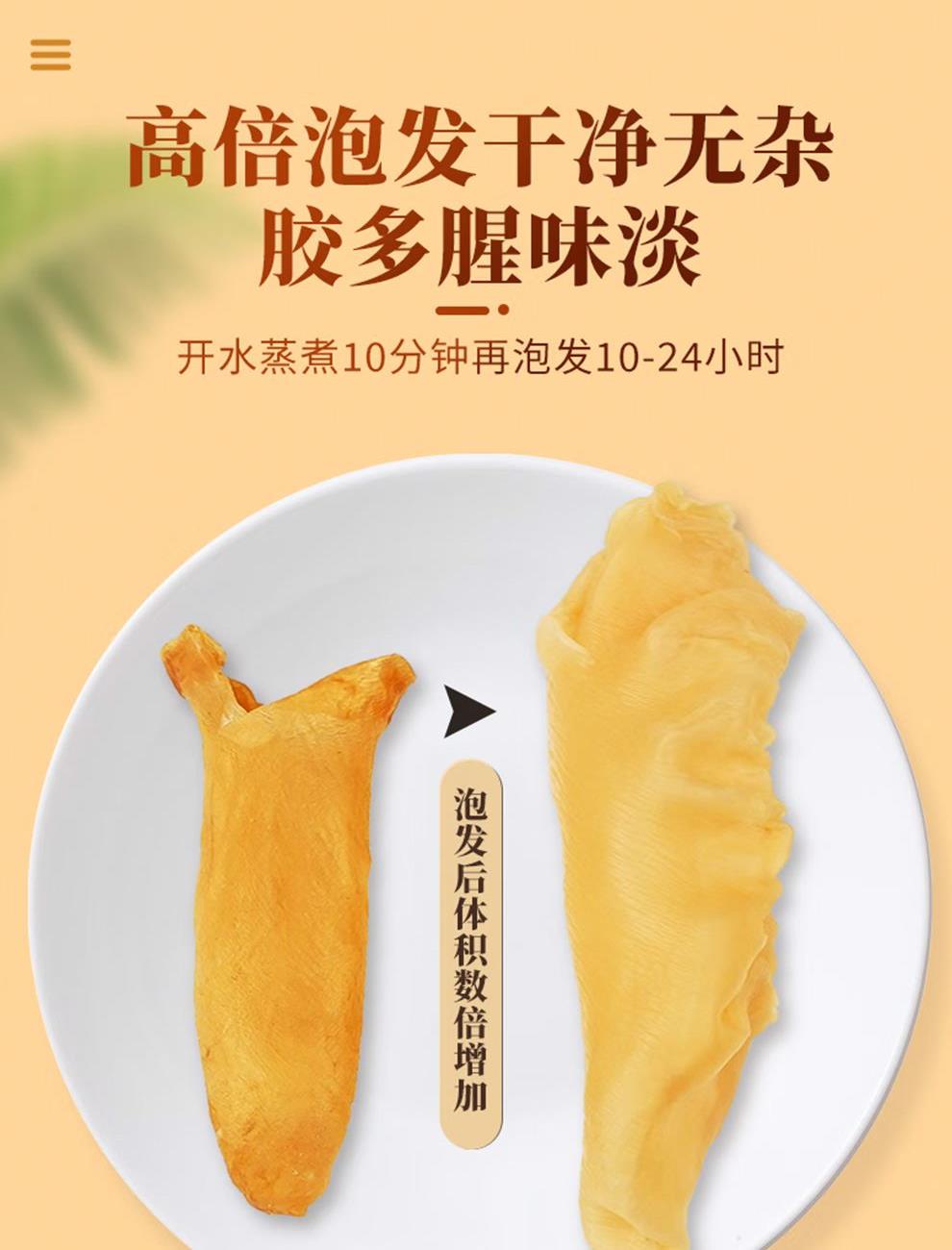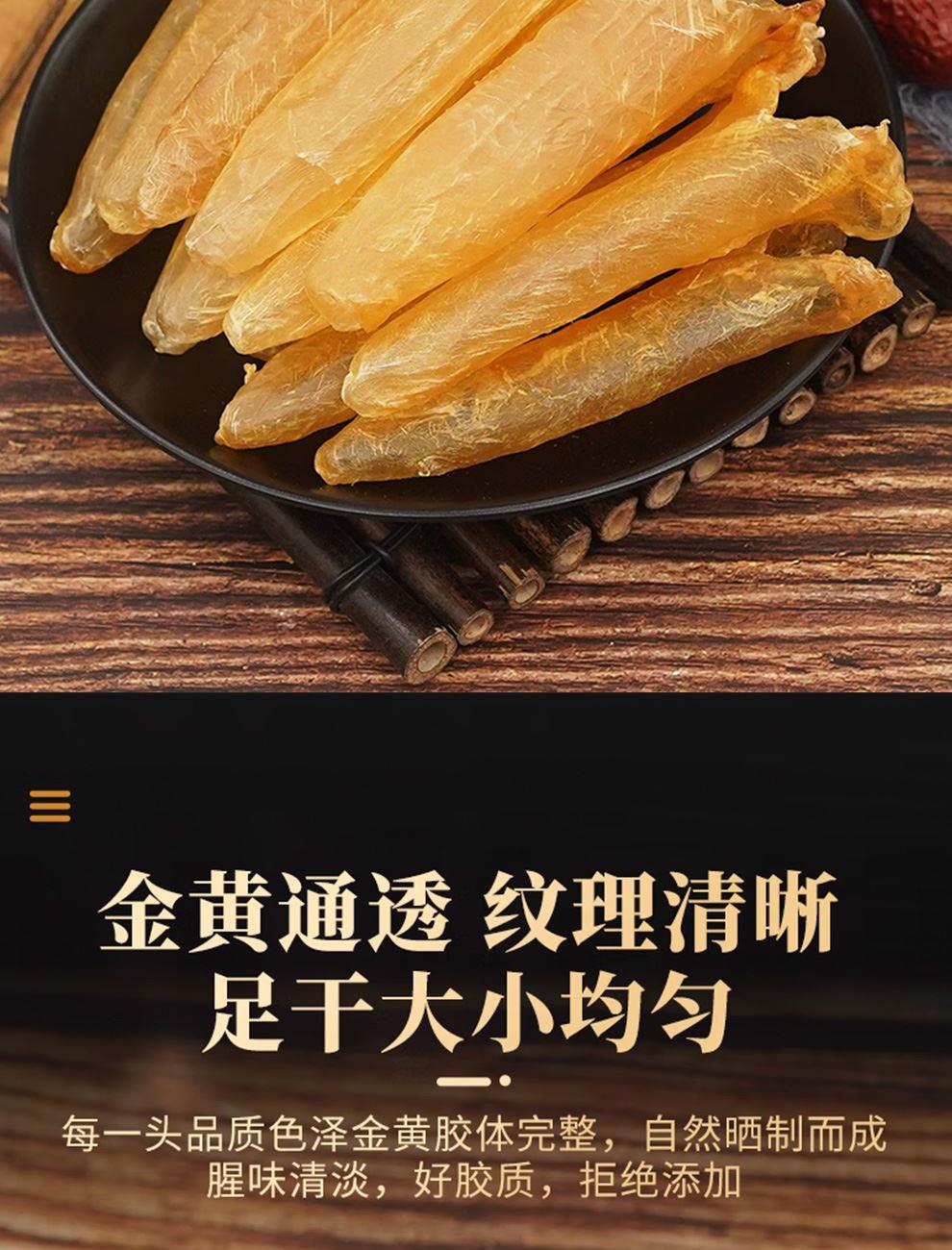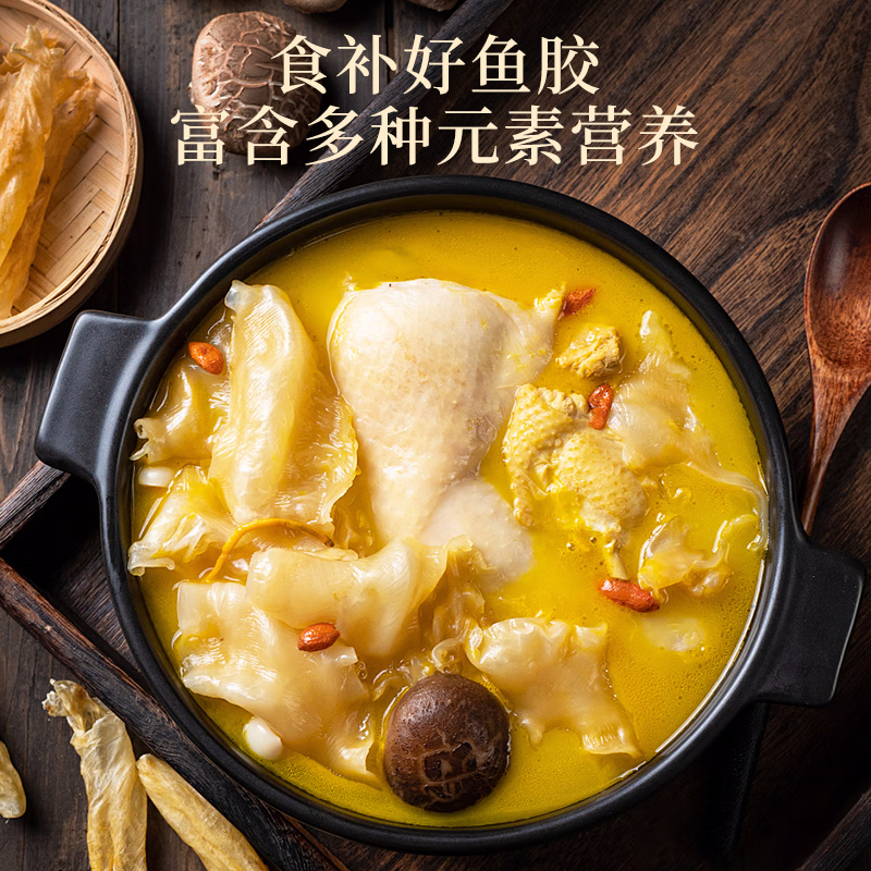 规格:50克(8-12头) 卖点: 营养价值高:黄花筒胶是花胶的一种,富含胶原蛋白,这种成分对皮肤有很好的滋养作用,能够增加皮肤的弹性,减少皱纹,起到美容养颜的功效。同时,还含有多种维生素和矿物质,有助于补充人体所需的营养元素。 - 口感鲜美:在烹饪后,黄花筒胶具有软滑、Q弹的口感 - 烹饪多样性:可以用于多种烹饪方式,比如制作花胶鸡汤、花胶排骨汤等滋补汤品。