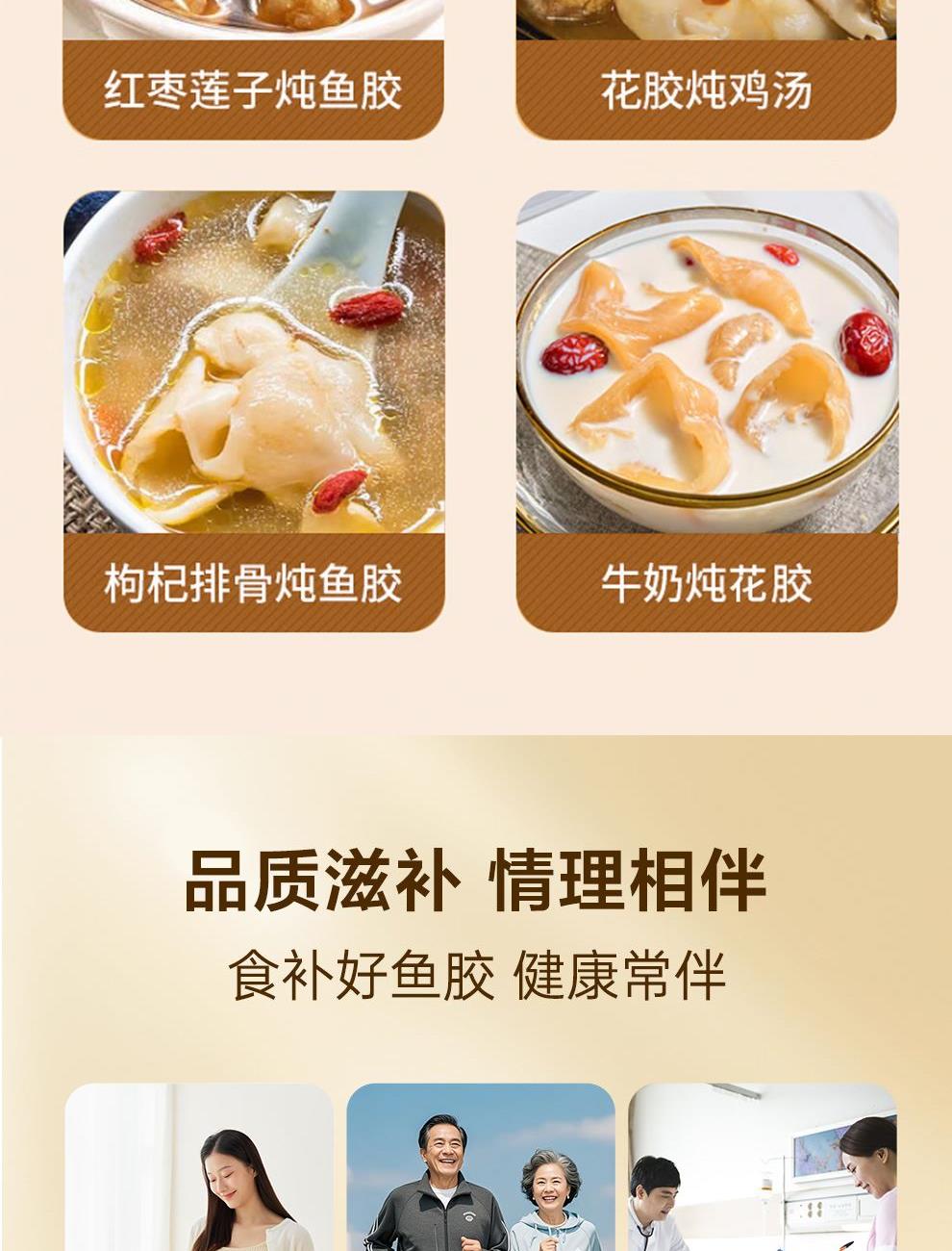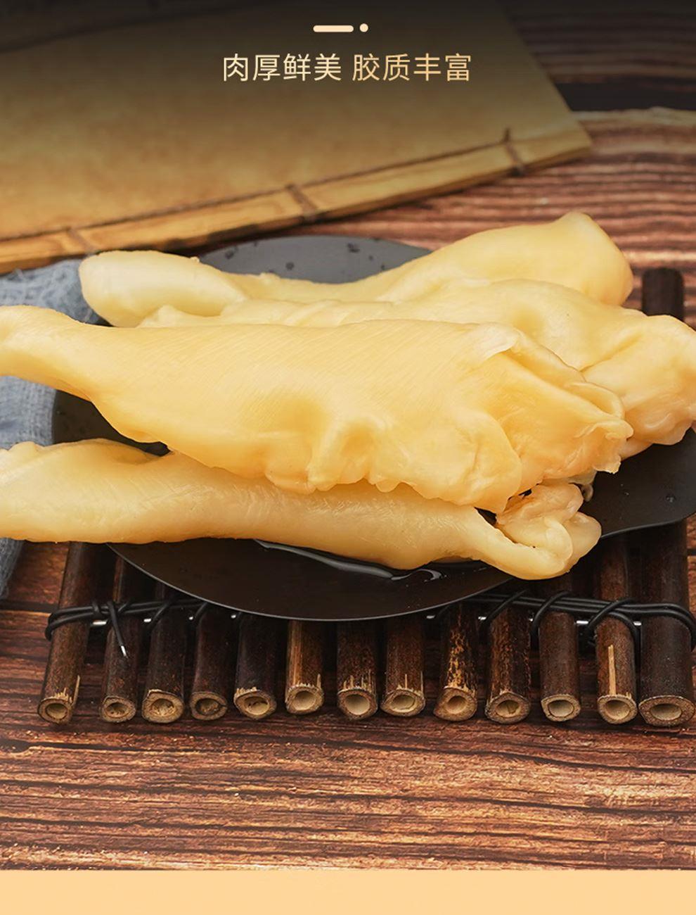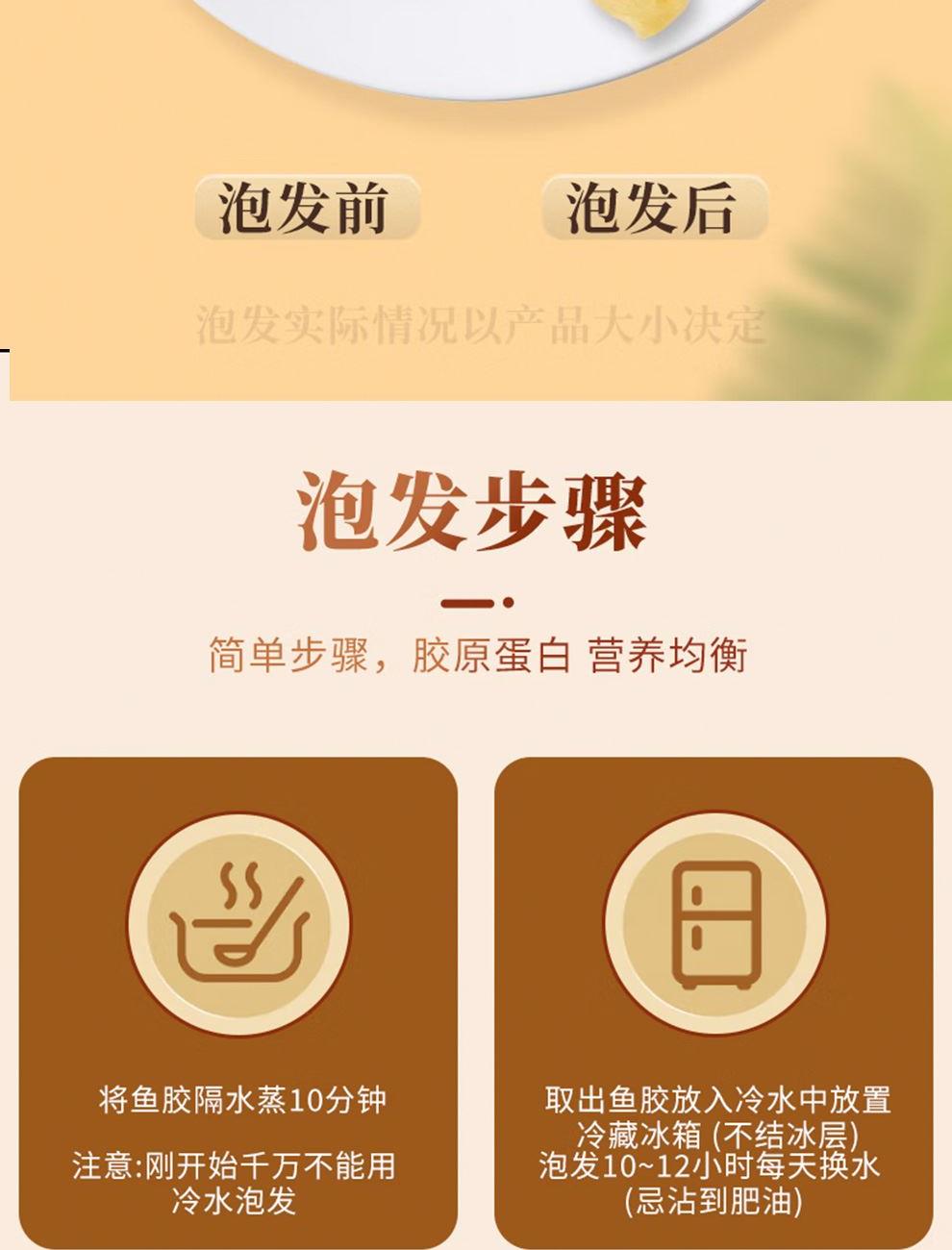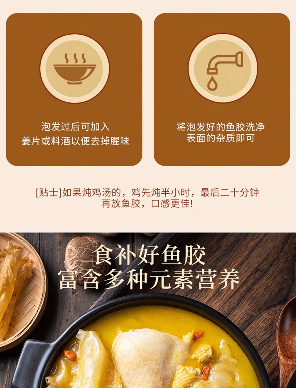 规格:50克(8-12头) 卖点: 营养价值高:黄花筒胶是花胶的一种,富含胶原蛋白,这种成分对皮肤有很好的滋养作用,能够增加皮肤的弹性,减少皱纹,起到美容养颜的功效。同时,还含有多种维生素和矿物质,有助于补充人体所需的营养元素。 - 口感鲜美:在烹饪后,黄花筒胶具有软滑、Q弹的口感 - 烹饪多样性:可以用于多种烹饪方式,比如制作花胶鸡汤、花胶排骨汤等滋补汤品。