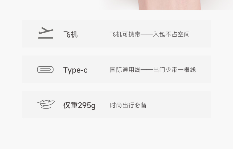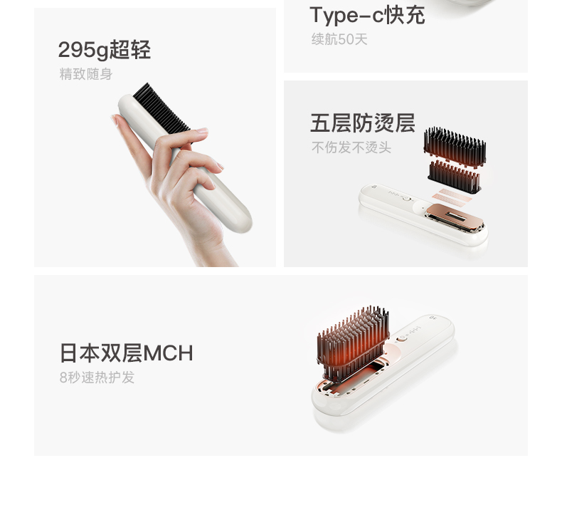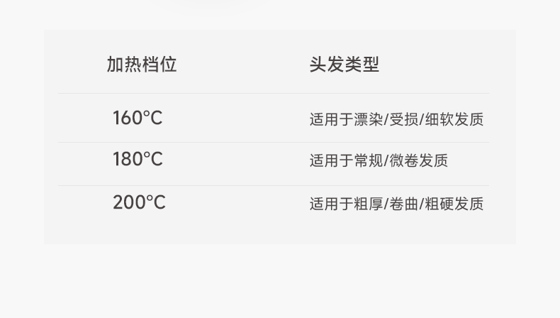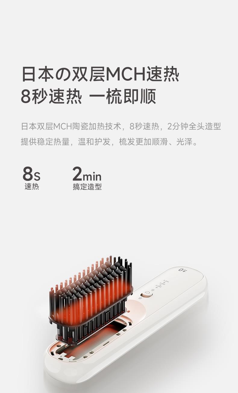 充电方式:USB TYPE-C接口 电池容量:3200mAH 额定电压:直流/7.4V 续航时间:50分钟 充满时间:约4小时 温度设定:160-180-200°C 负离子水润护发 双MCH陶瓷发热 双层防烫护齿 3档温度可选