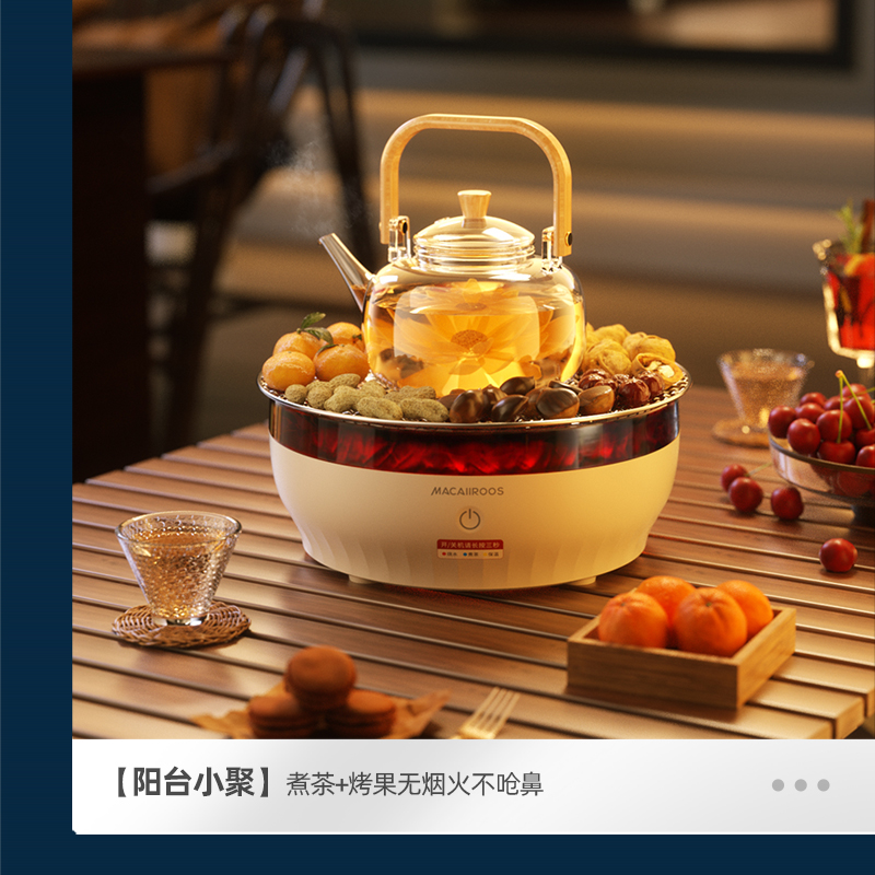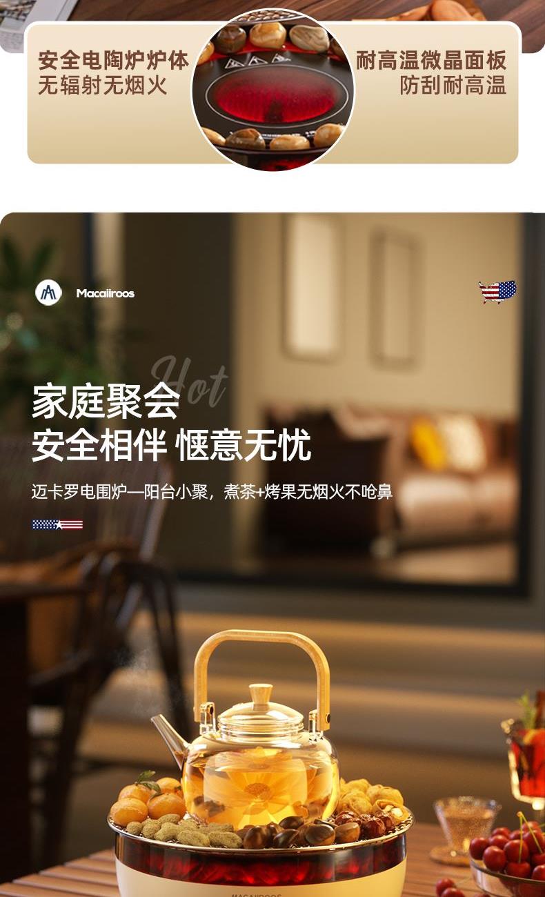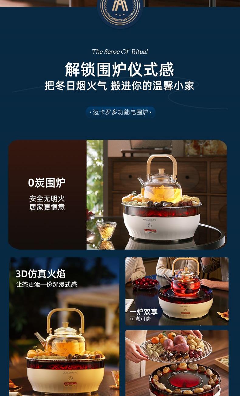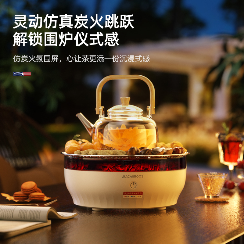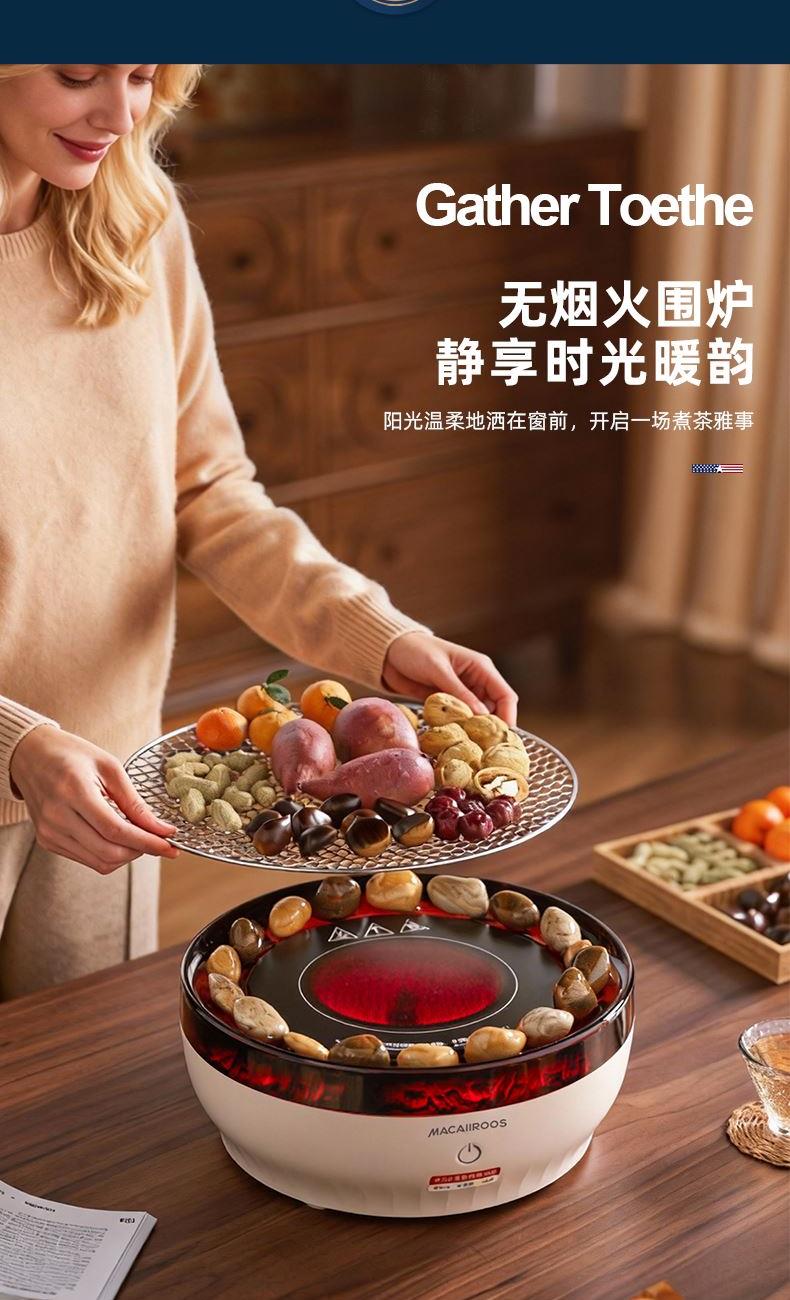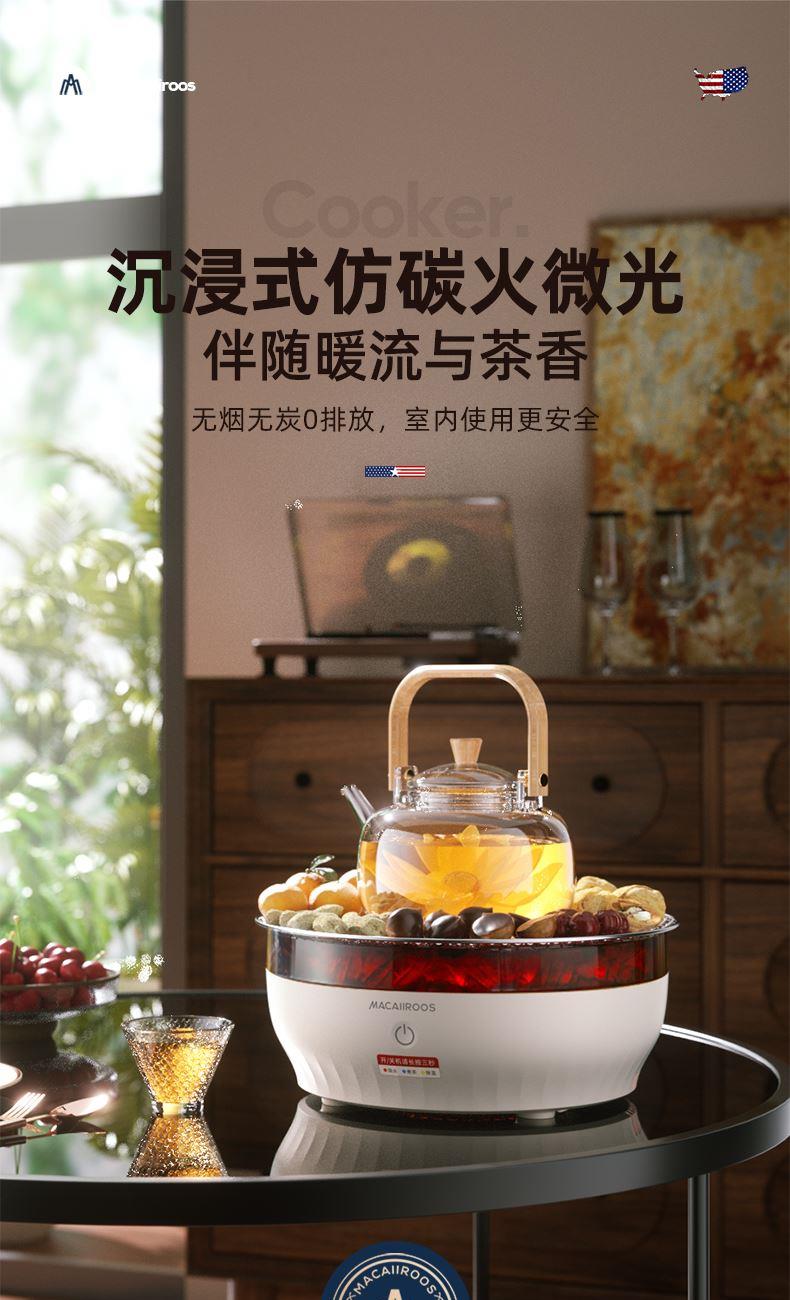 额定功率:1000W 额定容量:1.2L 额定电压:220V~ 额定频率:50Hz 产品净重:1.67kg 产品毛重:1.95kg 整箱重量:2.5kg 一机多用集围炉、电陶炉于一体,可烧烤坚果,也可单独使用; 红外发热&3D火焰远红外发热,不挑锅具;3D仿真火焰效果,无烟无炭0排放; 微晶面板耐高温防爆裂微晶面板,加密食品级烤网; 产品配置配烤网、茶壶,触摸操控,闲时三五友人煮茶、烧烤。