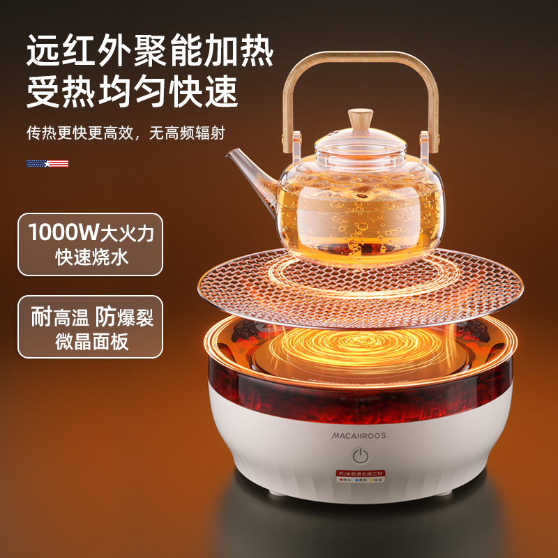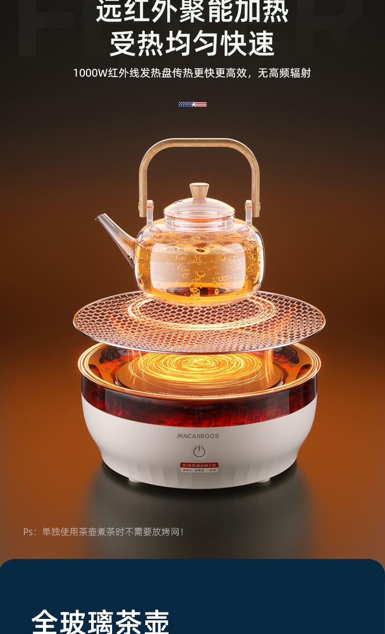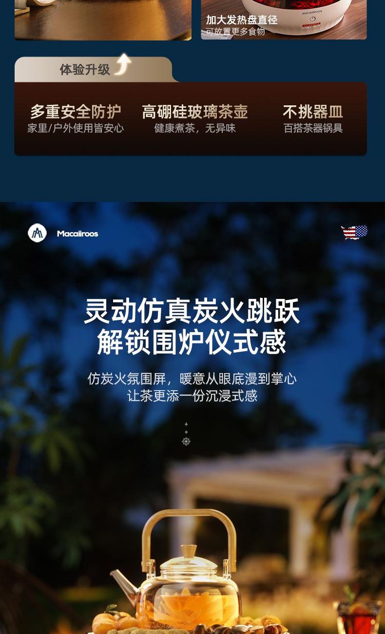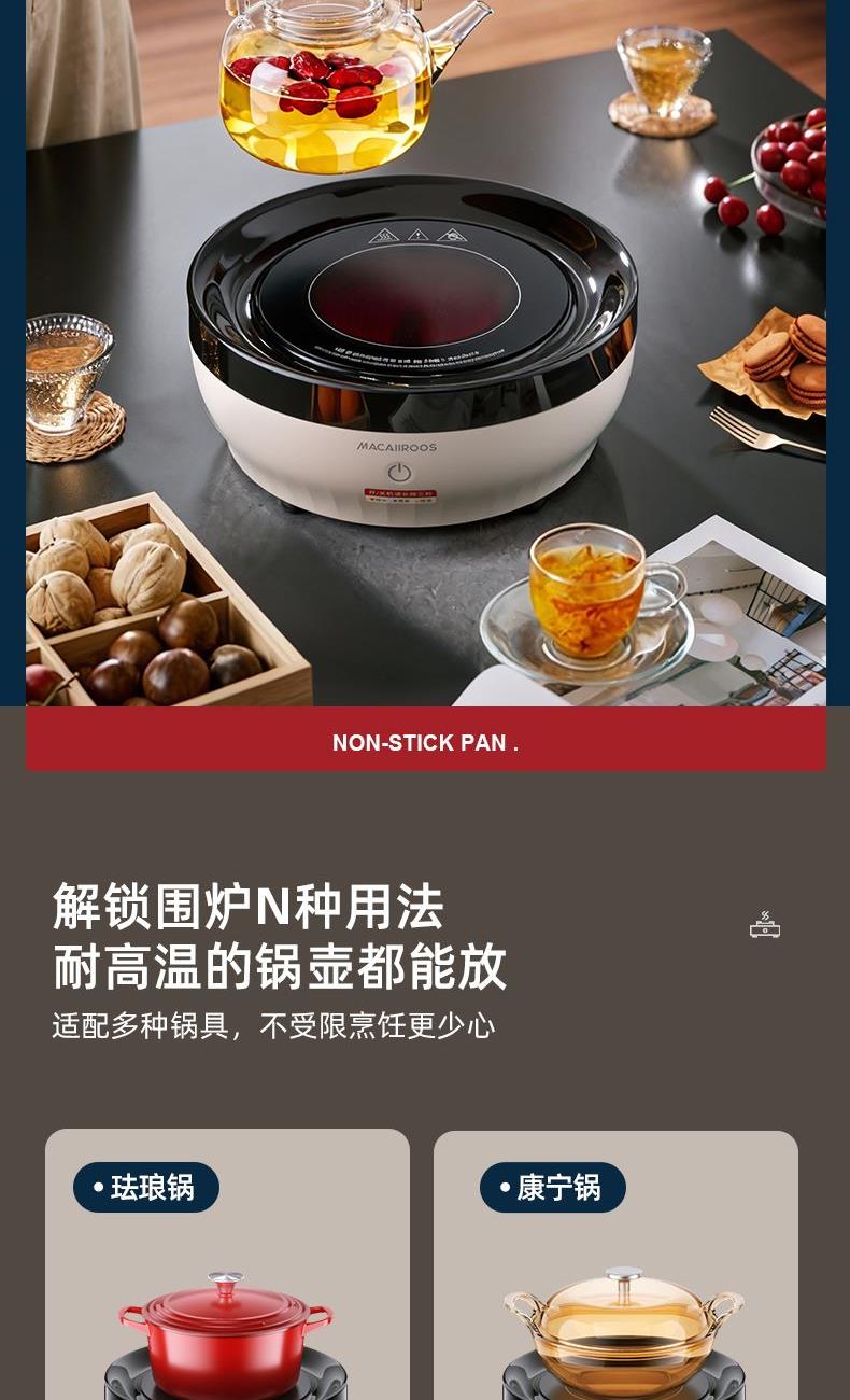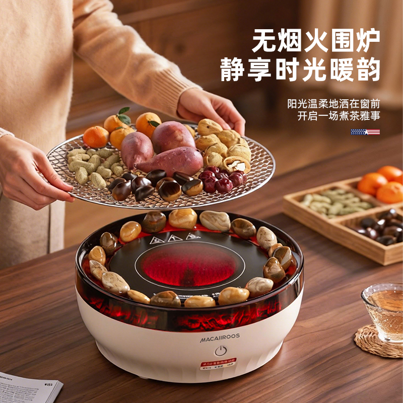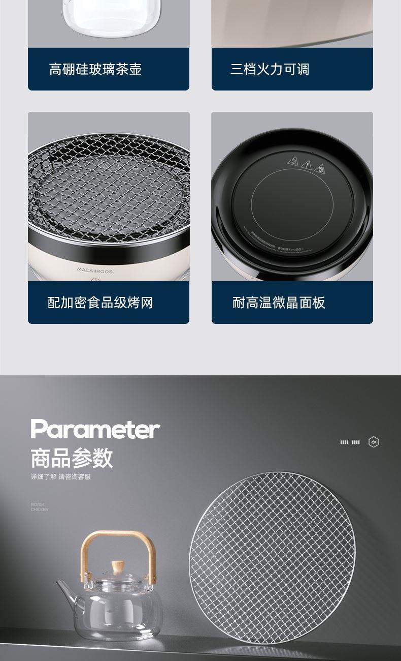 额定功率:1000W 额定容量:1.2L 额定电压:220V~ 额定频率:50Hz 产品净重:1.67kg 产品毛重:1.95kg 整箱重量:2.5kg 一机多用集围炉、电陶炉于一体,可烧烤坚果,也可单独使用; 红外发热&3D火焰远红外发热,不挑锅具;3D仿真火焰效果,无烟无炭0排放; 微晶面板耐高温防爆裂微晶面板,加密食品级烤网; 产品配置配烤网、茶壶,触摸操控,闲时三五友人煮茶、烧烤。